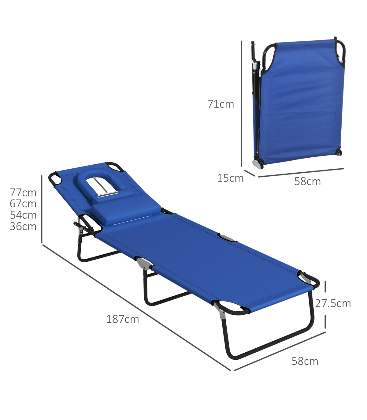 - Adjustable backrest can be locked to four different positions; - Steel frame is strong, also foldable to carry and store easily; - Padded face hole to relax on your front comfortably; - Smooth, breathable fabric seat; - Maximum load 120kg, assembly required; - Colour: Beige; - Material: Steel, Oxford Cloth; - Overall Dimensions: 187L x 58W x 36Hcm; - Foldable Size: 71L x 15W x 58Hcm; - Reading Hole Size: 20W x 15Dcm; - Weight Capacity: 120kg; - Item label: 84B-002V01BG;