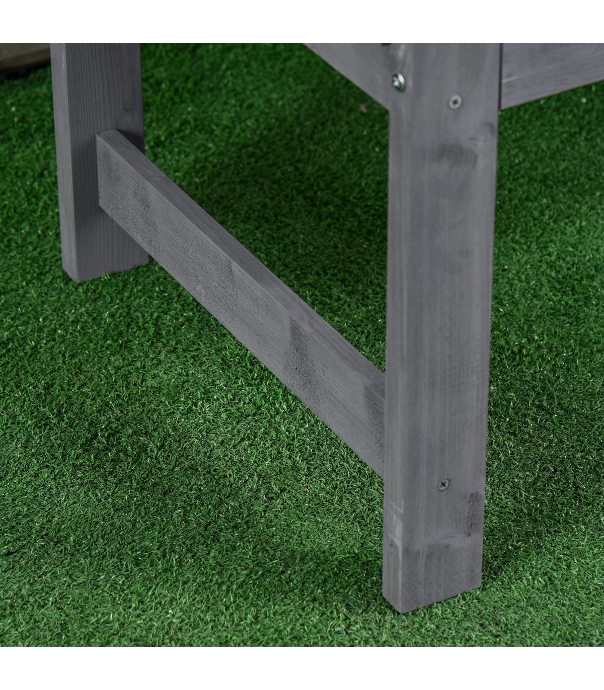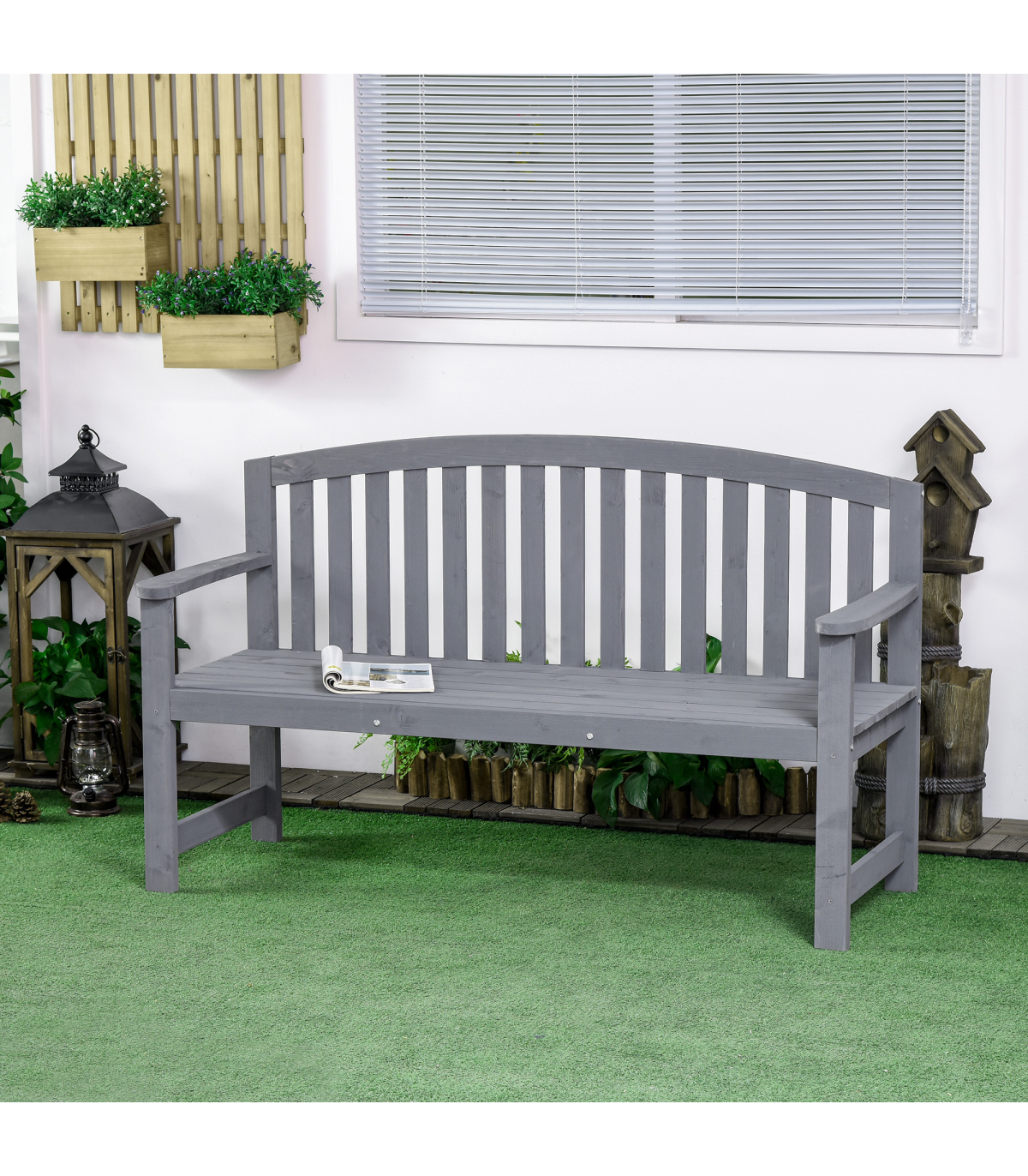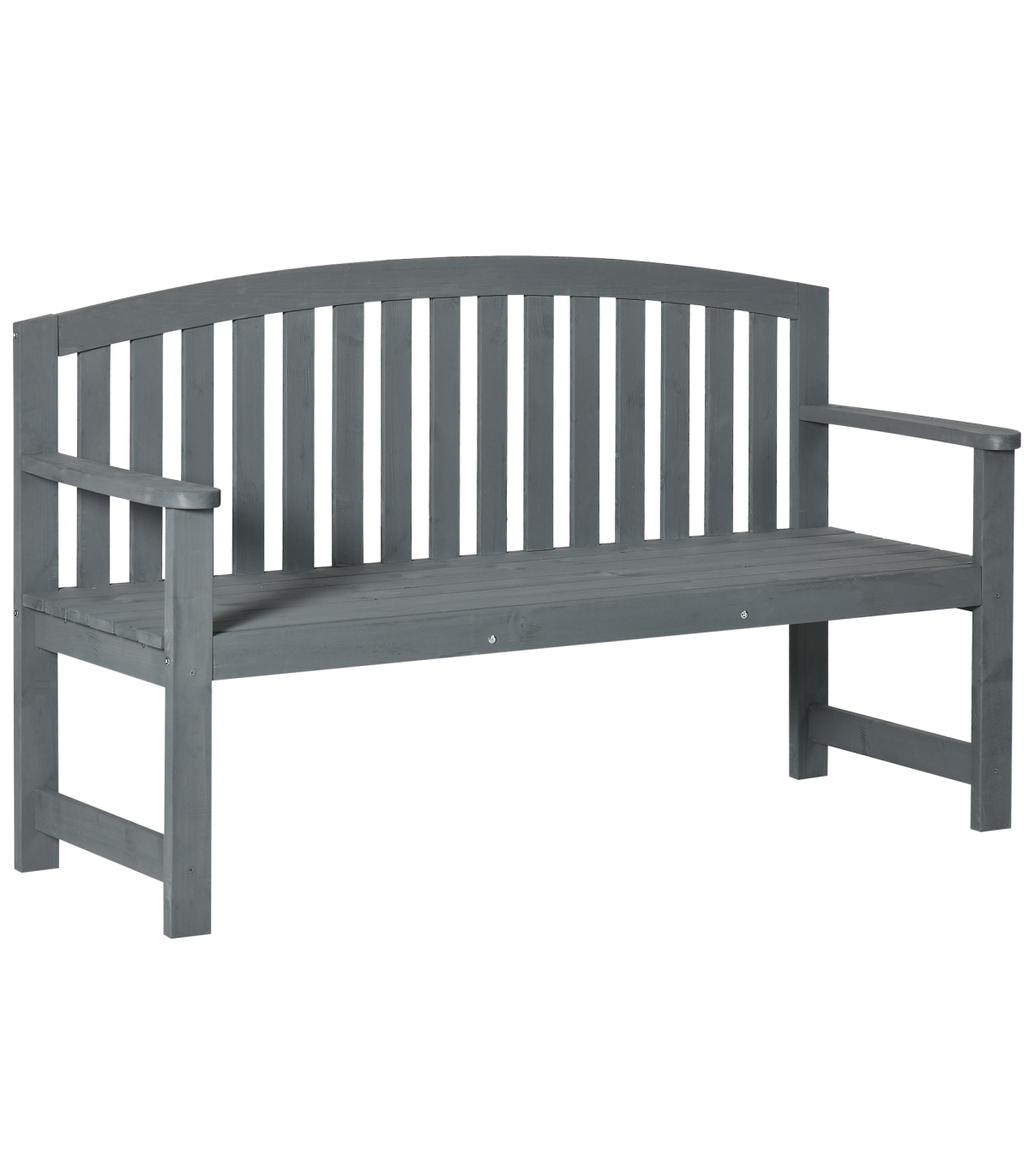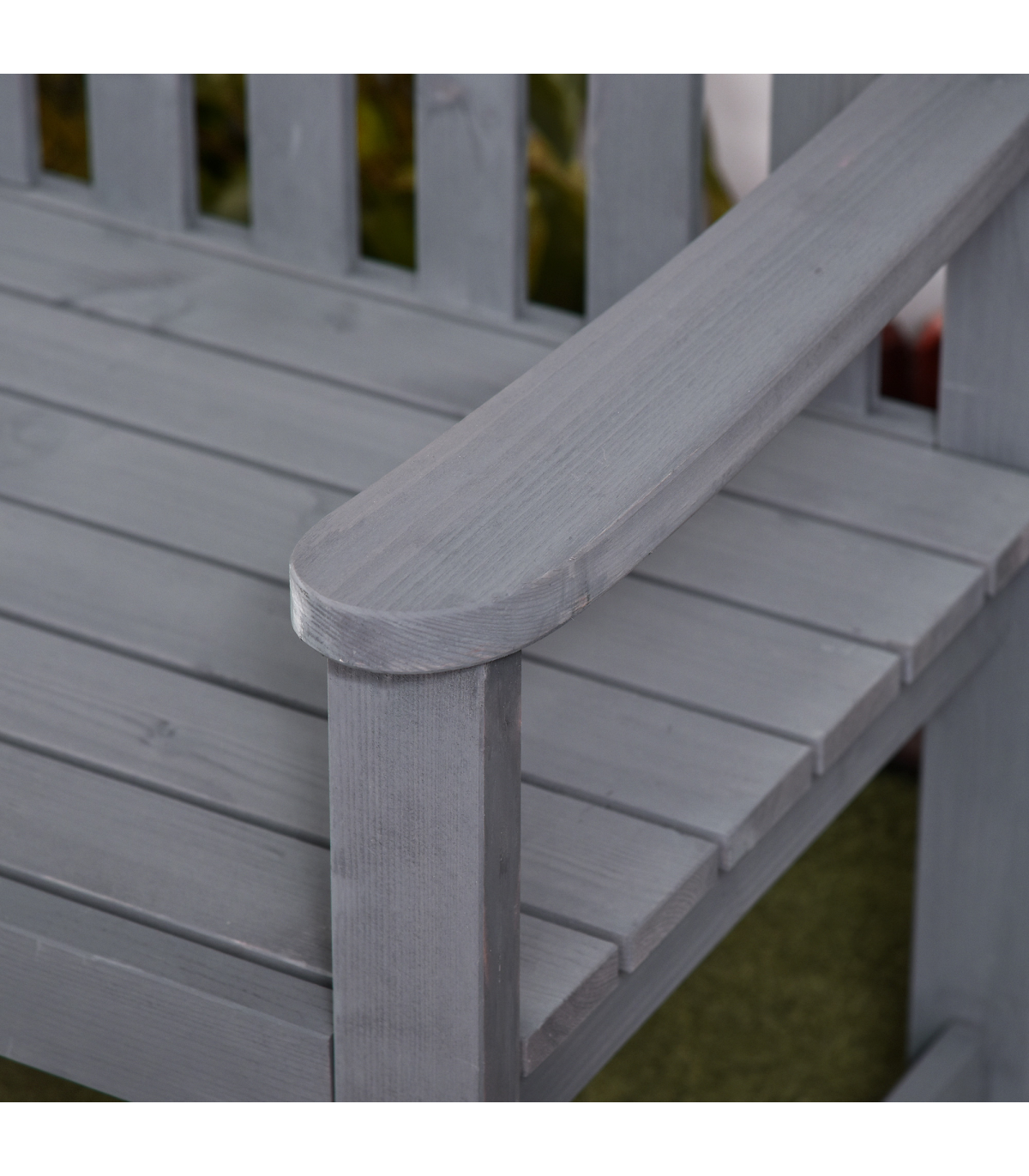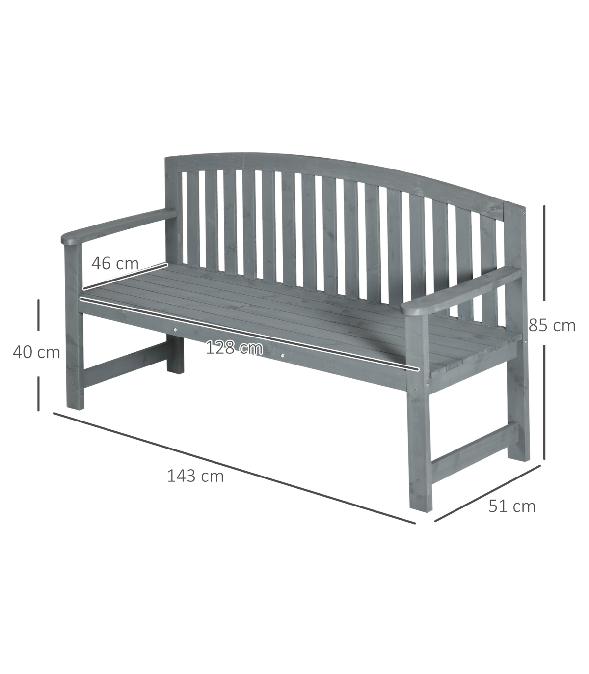 - Two-seater design, space to relax with friends; - Curved designed back and smooth armrests for support and comfort; - Solid fir wood structure with protective paint; - Slatted back and seat prevent water build-up; - Suitable for garden, porches, balconies and other outdoor spaces; - Maximum load 240kg, assembly required; - Colour: Grey; - Material: Fir Wood; - Overall Dimension: 143L x 51W x 85H cm; - Seat Size: 128W x 46D cm; - Seat Height (from Floor): 40 cm; - Armrest Size: 48L x 8W cm; - Back Size: 126W x 45H cm; - Weight Capacity: 240 kg; - Item Label: 84B-634V00GY;