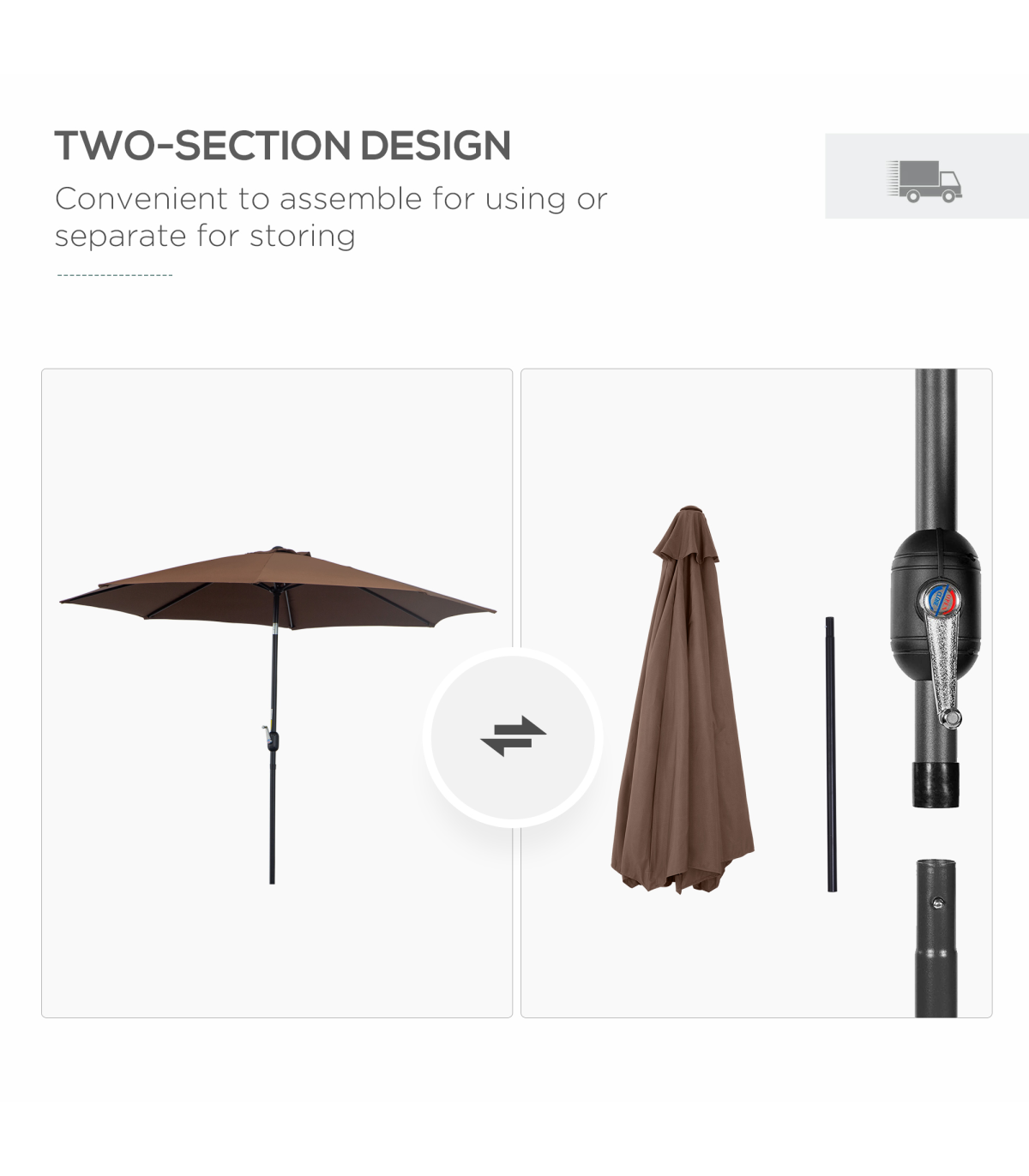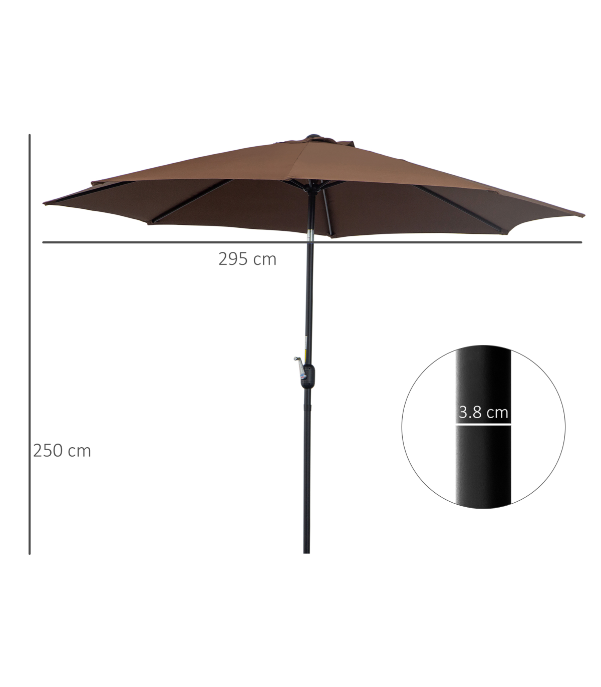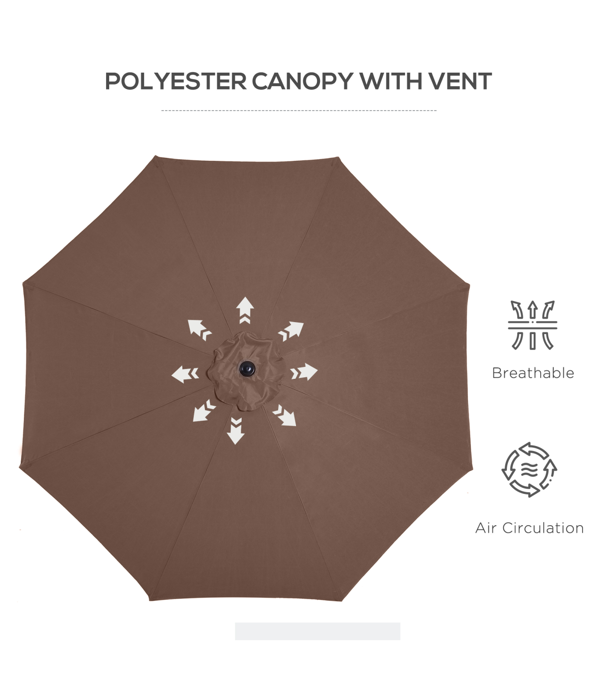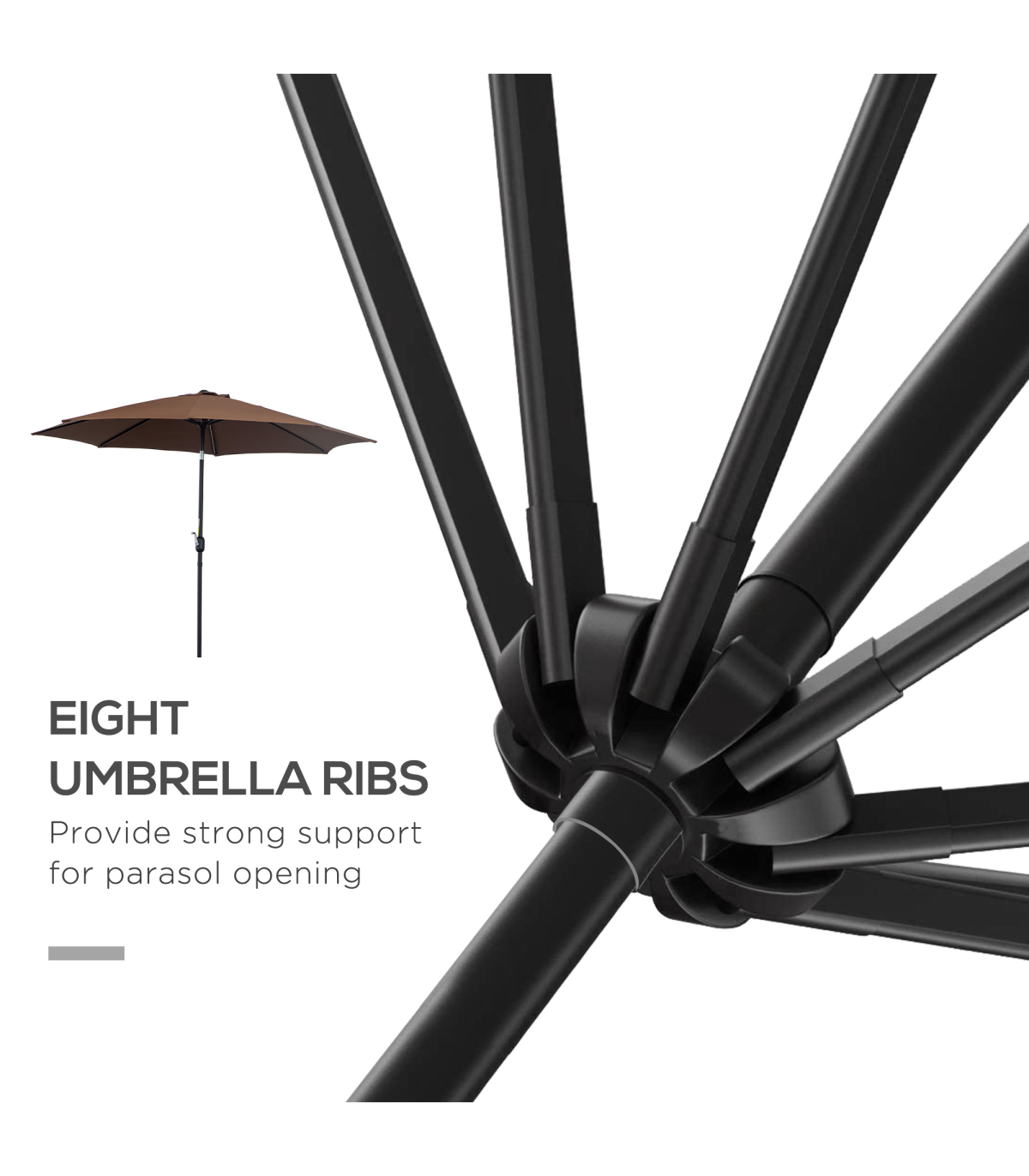 - Steel frame to keep parasol upright, connected to the canopy with eight steel ribs
