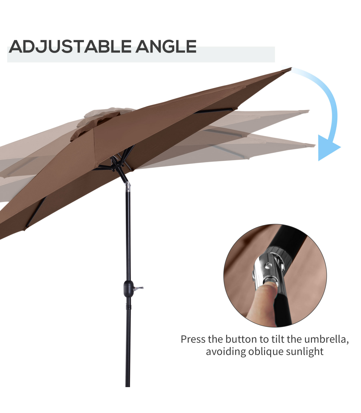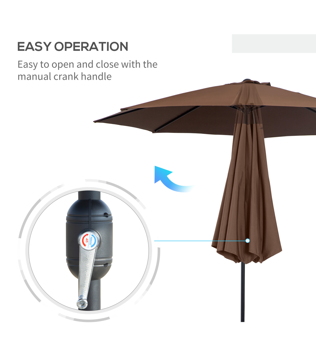 - Crank handle to open and close canopy easily. Also adjusts the canopy angle