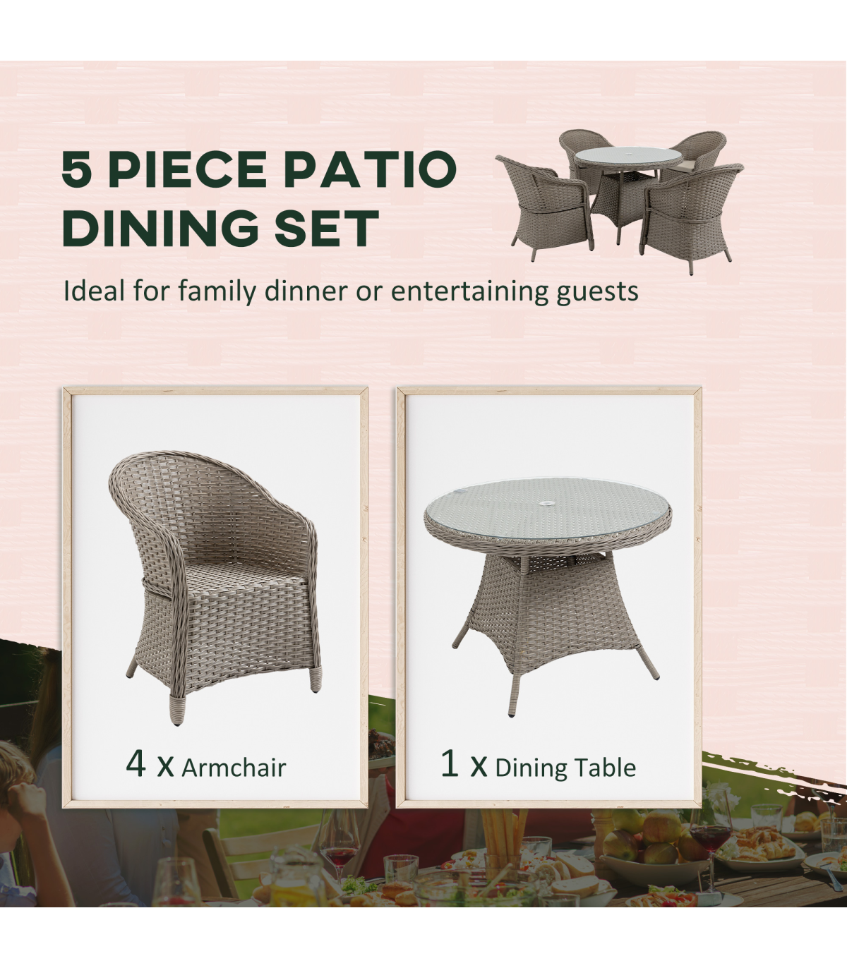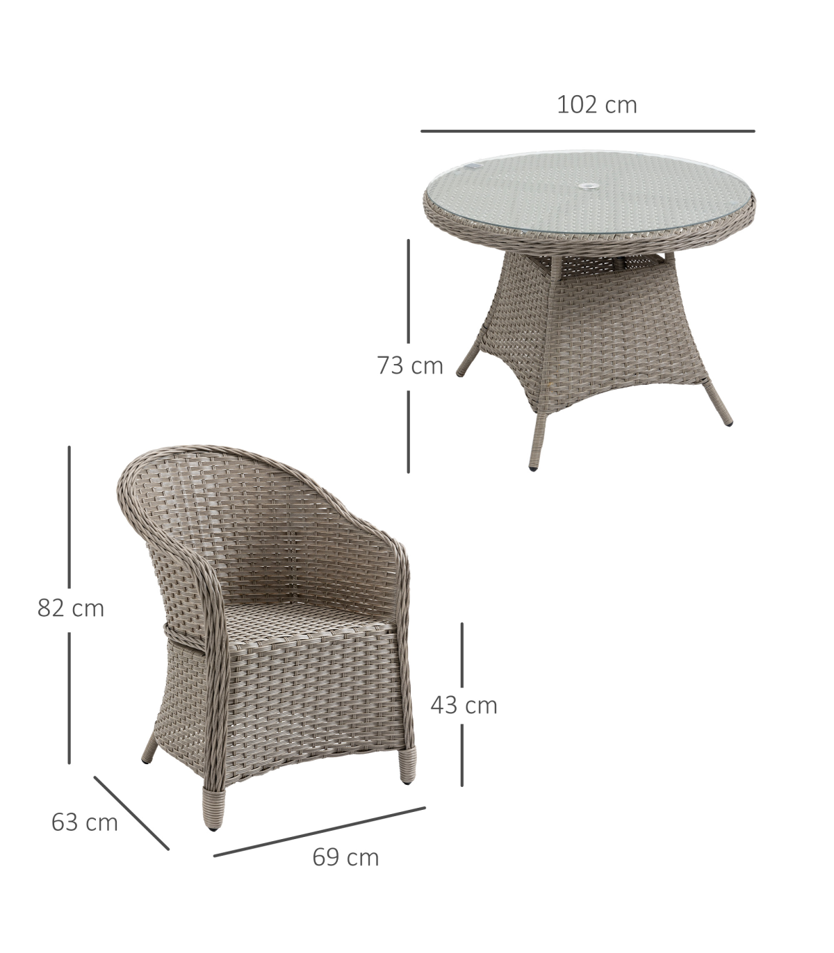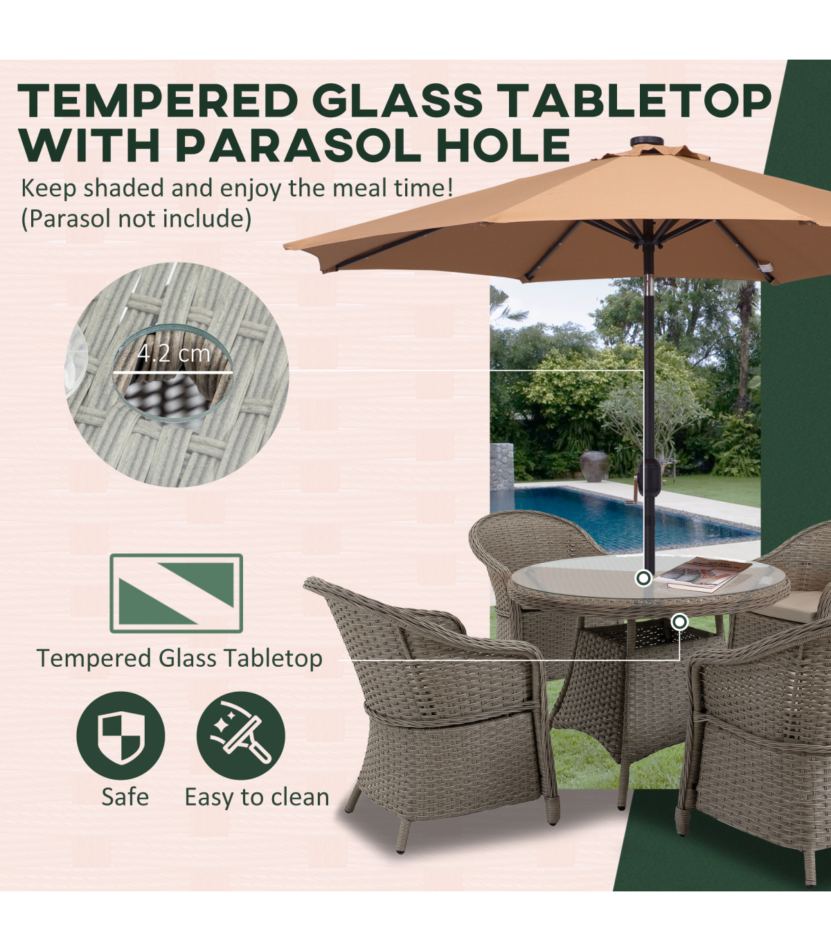 Gathering guests around this season, and beyond, don't come as stylish as this. The garden sofa dining set pairs a sleek glass-top table with on-trend mixed grey rattan for a welcome addition to your garden and outdoor areas. Comes with four armrest chairs, each with a padded seat cushion for comfort and high back and armrests for support. The middle hole in the table of the rattan garden dining set offers a place for a parasol to keep you safely shaded. Relax in comfort and style with Outsunny.