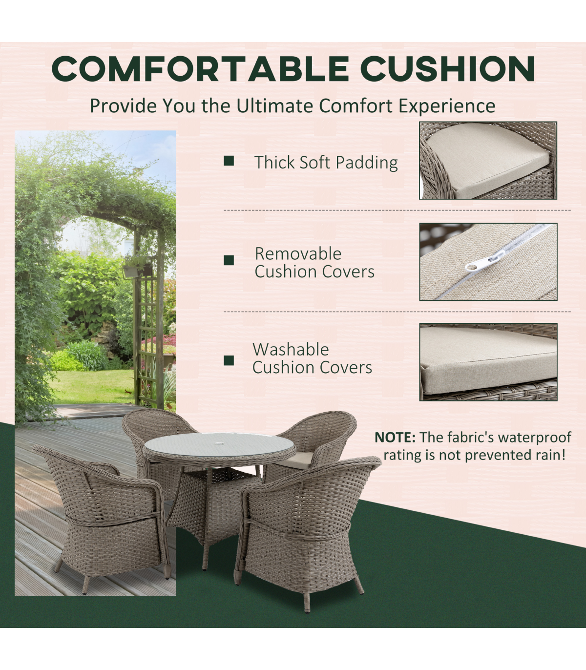 Five pieces - four chairs and matching dining table Metal frame for a strong core, wrapped in durable plastic wicker Padded seat cushions for comfort. Covers are removable and washable Sleek tempered glass table top, with handy umbrella hole Assembly required