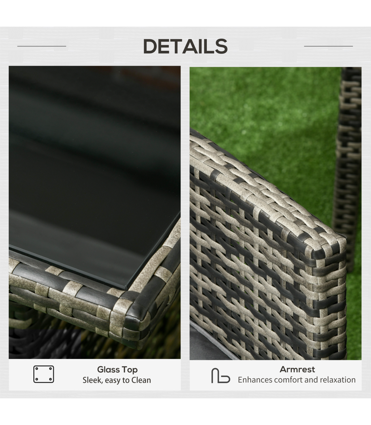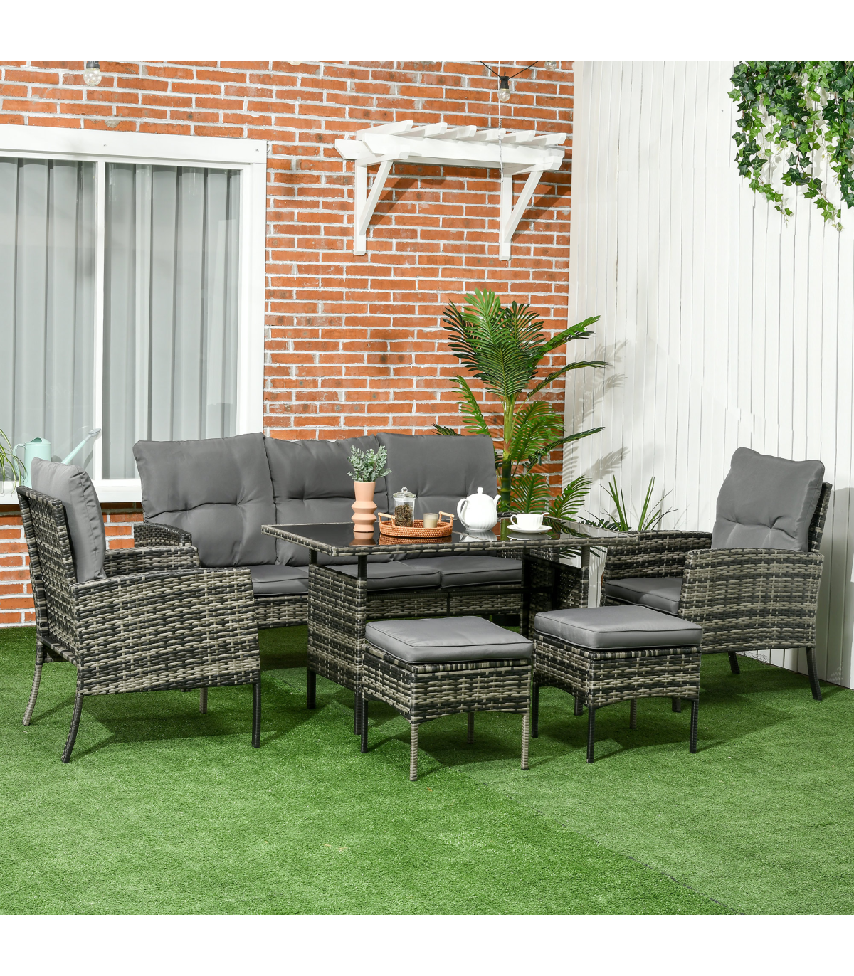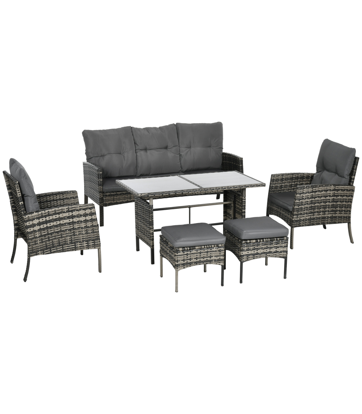 Six-piece set: Rattan furniture set includes two armchairs, two footstools, a three-seater sofa and a matching coffee table. Separate pieces to set up how you want.Padded seat and back cushions: Comes on all the seats of this garden sofa set, keeps you comfortable. Seat cushion covers are removable and washable.Steel, wrapped in rattan: Powder coated metal means each piece in this garden sofa set is strong, with the outdoor furniture wrapped in plastic wicker for double the durability with a stylish garden look.Glass-top dining table: A matching design for this rattan garden furniture set, with a sleek touch. A centrepiece for everyone to socialise together.Dimensions: Chair: 80H x 58W x 68Dcm. Sofa: 80H x 158W x 68Dcm. Table: 68H x 138L x 68Wcm. Stool: 38H x 40W x 40Dcm. Assembly required.