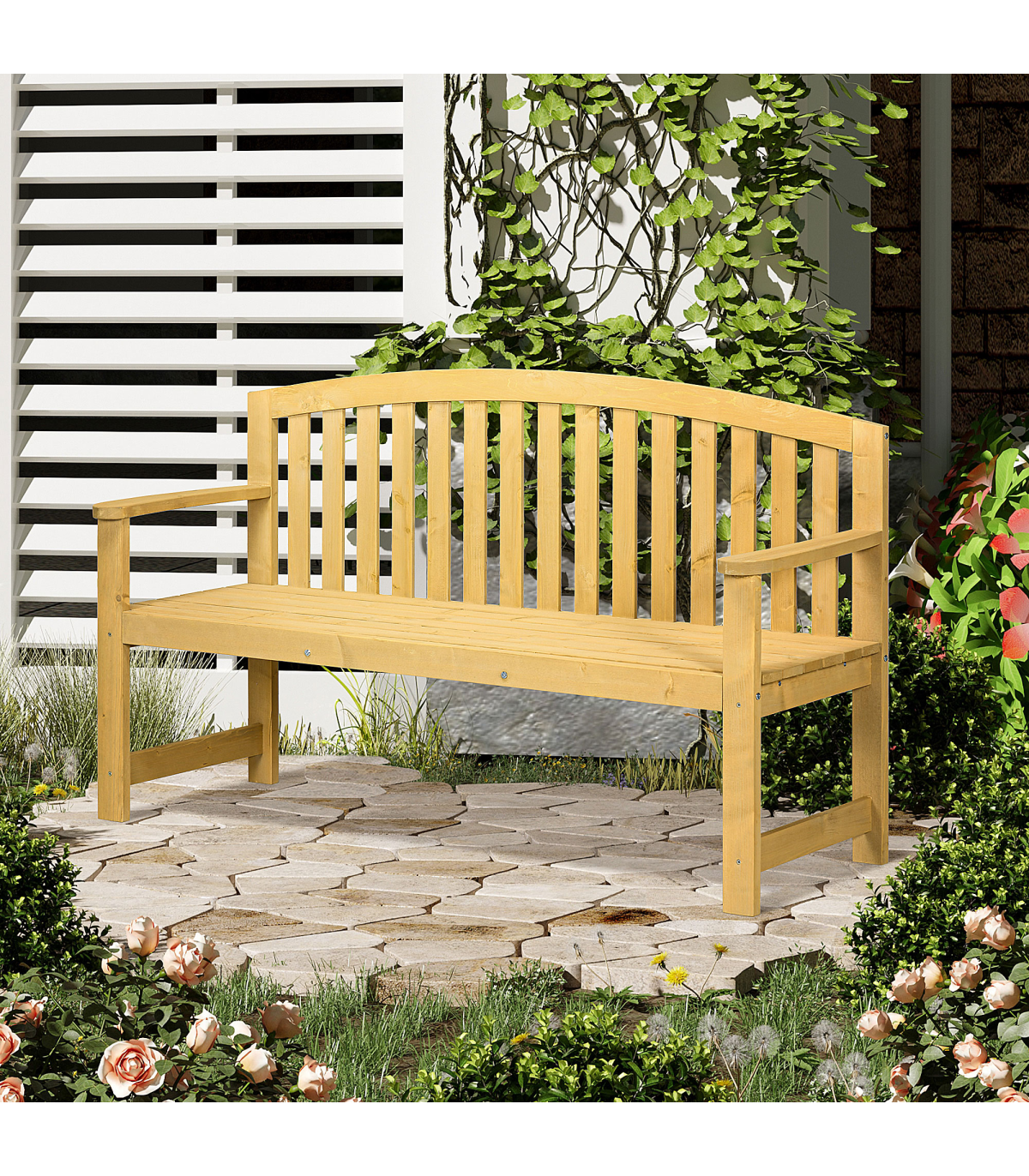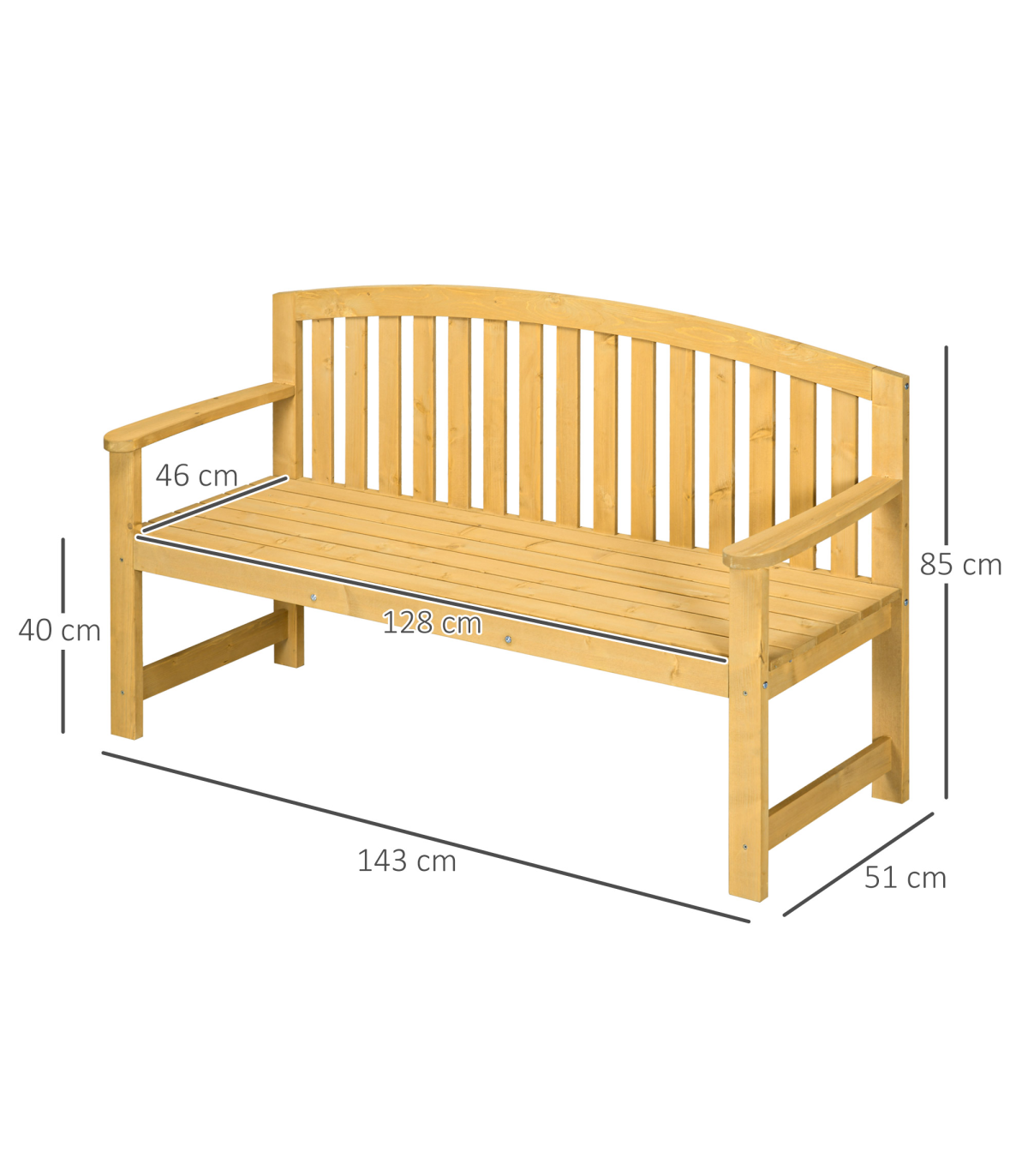 Fir wood structure: Bench is solid and durable, with a top coating of paint for mild protection against weathering. Leave natural or paint to a colour you want.143cm long seat: Plenty of space for two people to sit and relax together.Ergonomic: Tall back and armrests, supports your body as you relax, keeps you comfortable.Slatted design: Prevents water build up and allows air to circulate around.Dimensions: 85H x 143L x 51Wcm. Maximum load 240kg. Assembly required.