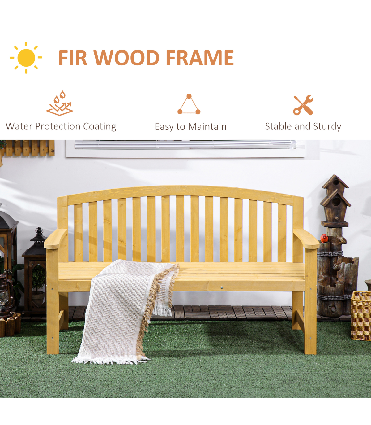Bring understated beauty into your garden and beyond, with this Outsunny bench. Made from fir wood, it is crafted into a spacious two-seater design, ensuring there is plenty of room to sit with company. The slatted back and seat prevents water building up, with a tall back and fixed armrests for support. Finished with a lick of protective varnish. Enhanced comfort? Choose an Outsunny cushioned seat.