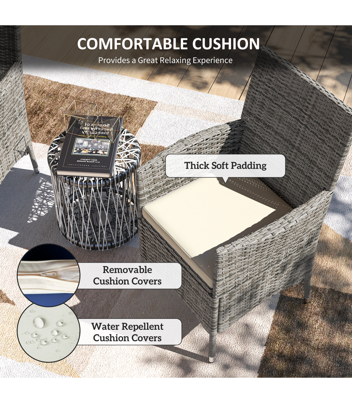 ● 5cm thick padded seat cushions keep you comfortable. Covers are removable and washable