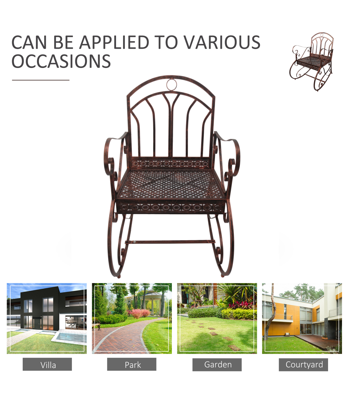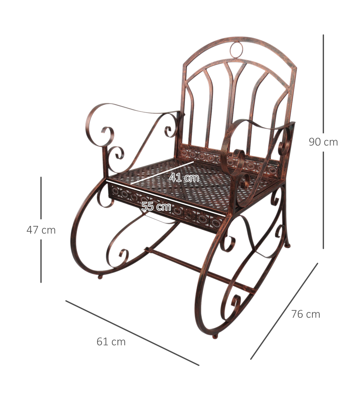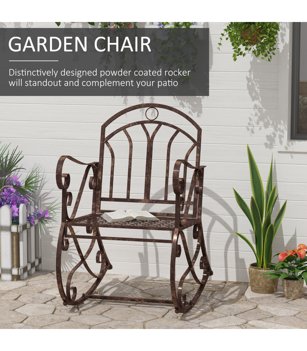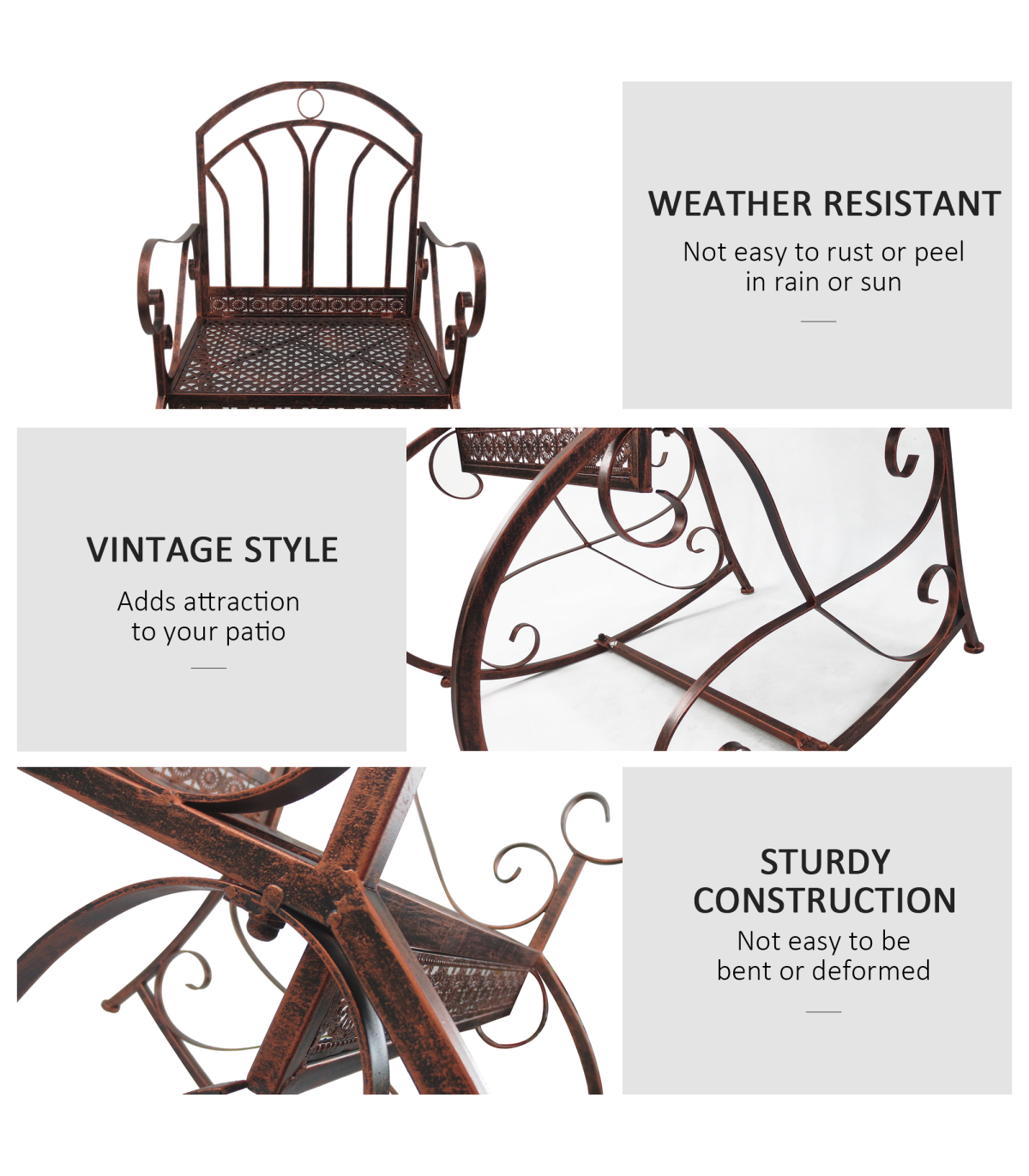 This Outsunny rocking chair is a great piece of furniture to have in your garden and patio. Made from metal in a bronze finish, it will be a great compliment to any home. It is a single seater with rocking function and comes with armrests making it comfortable while you enjoy the sunshine.