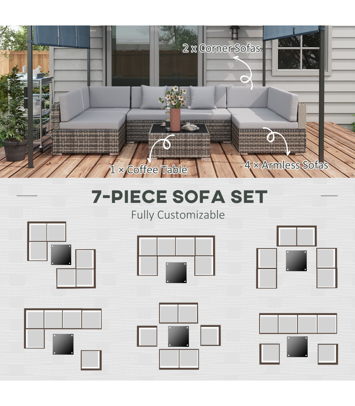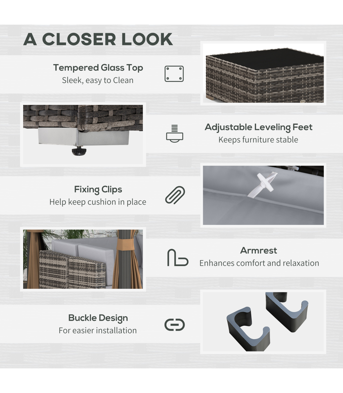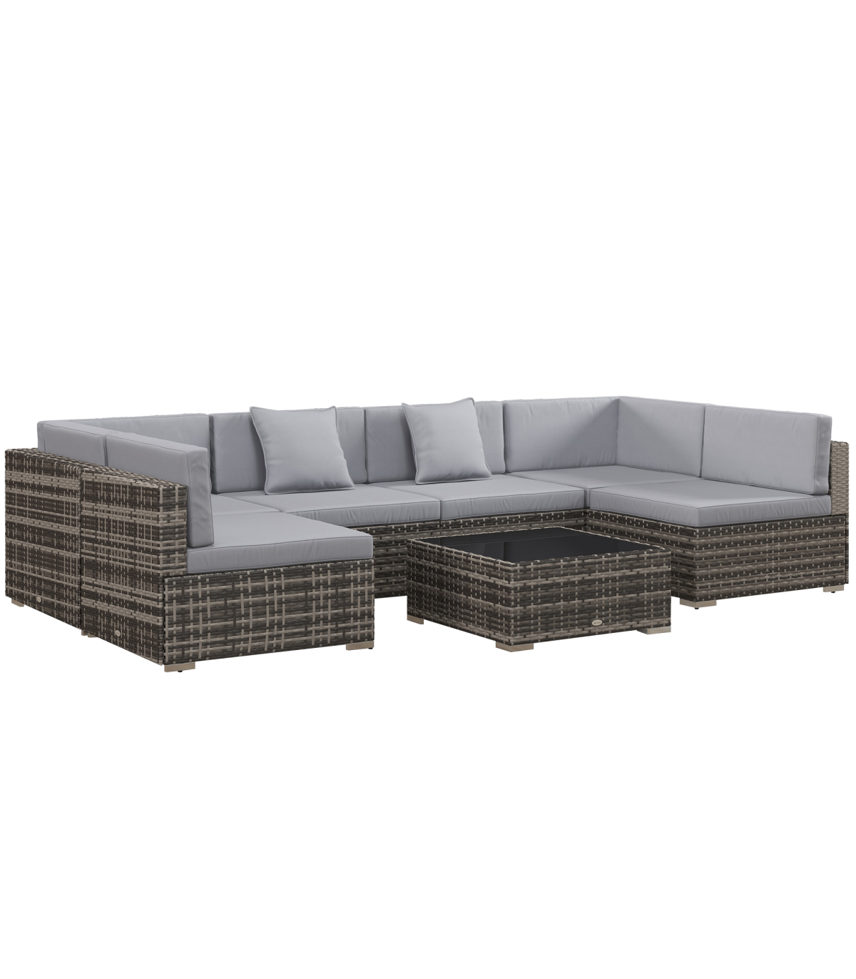 wrapped in PE wicker, the rattan top offers extra protection and style. Padded seat and back cushions provide comfort, with two extra pillows included. The rattan corner sofa is easy to assemble, with the buckle fastenings keeping all pieces secure. Set is completed with a safe tempered glass top on the table for a sleek look.