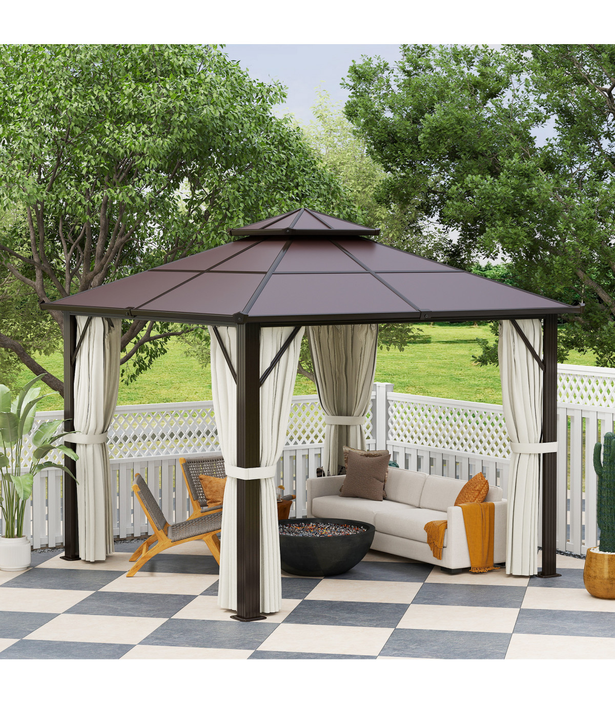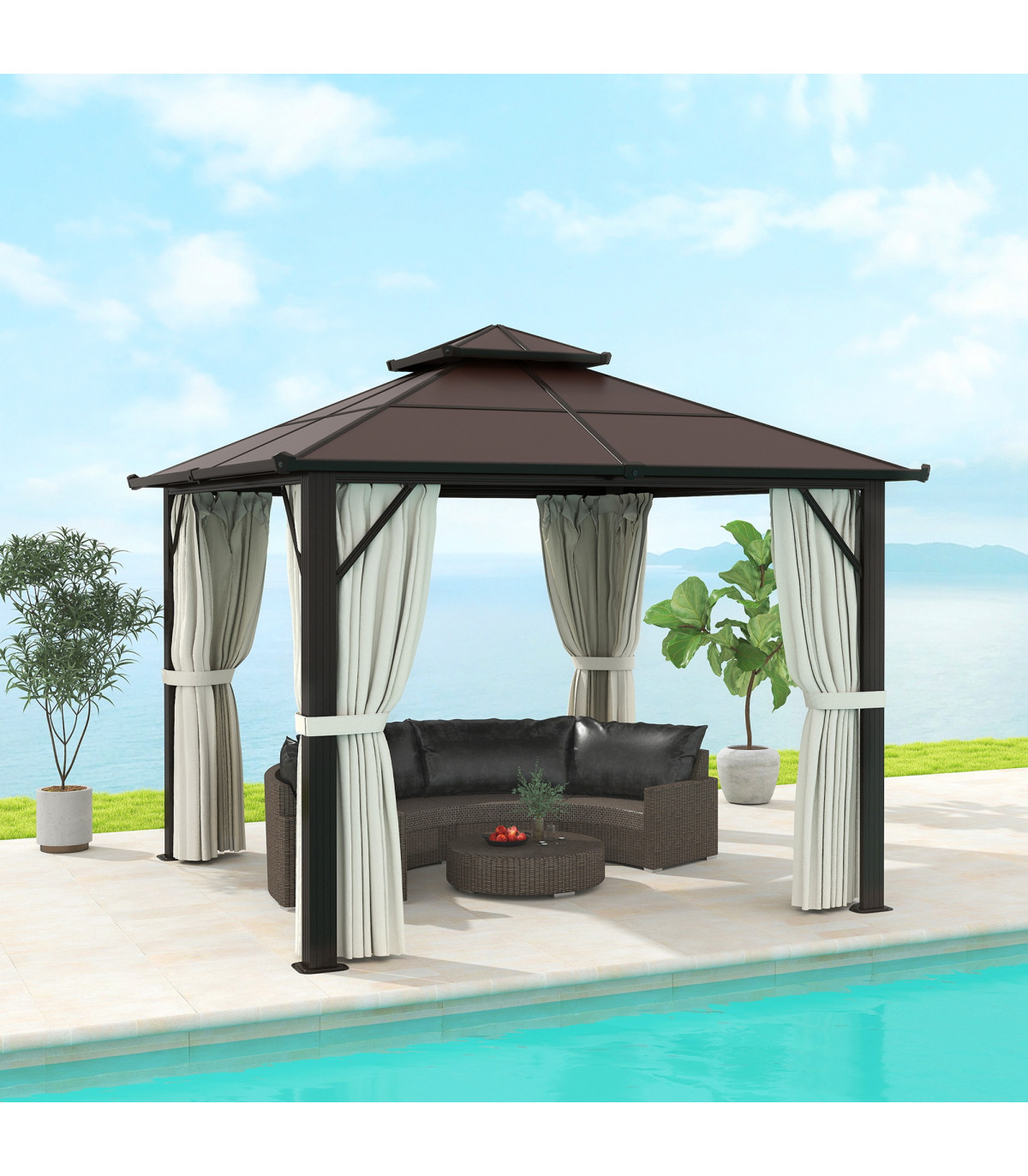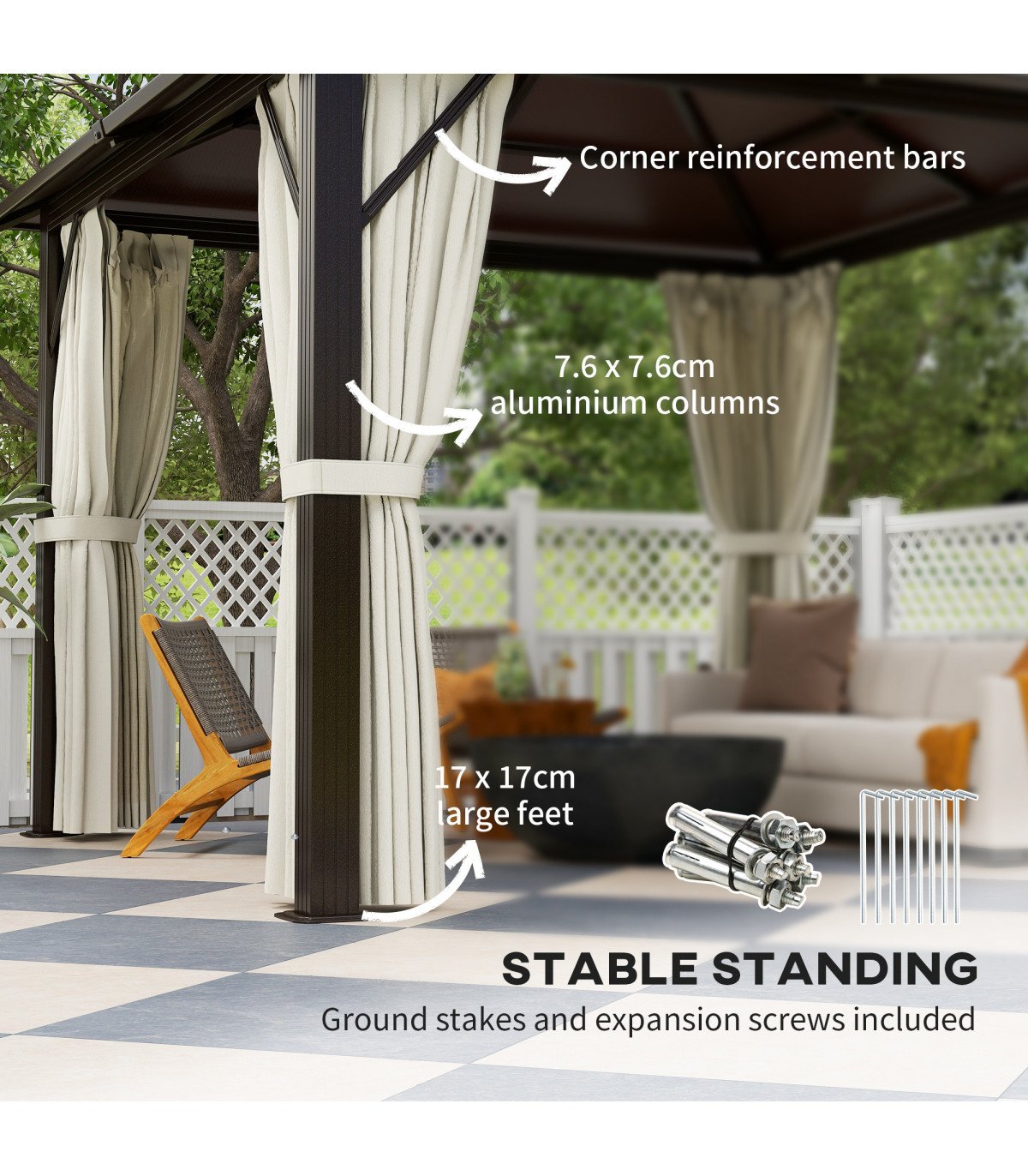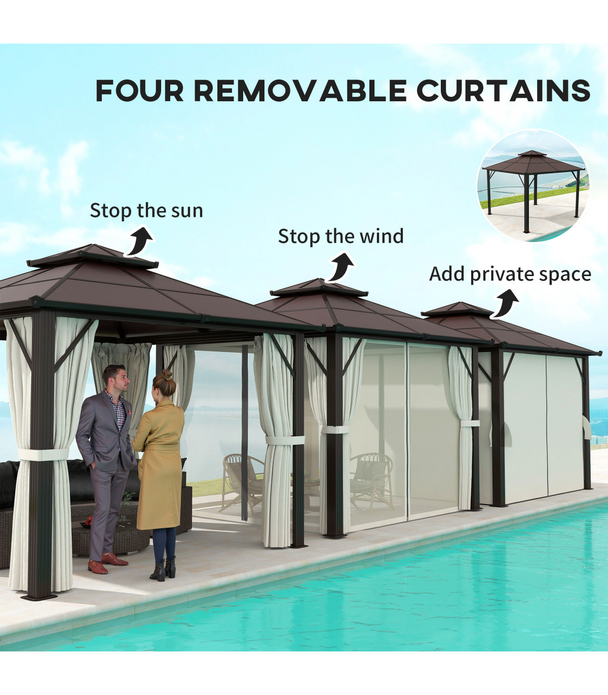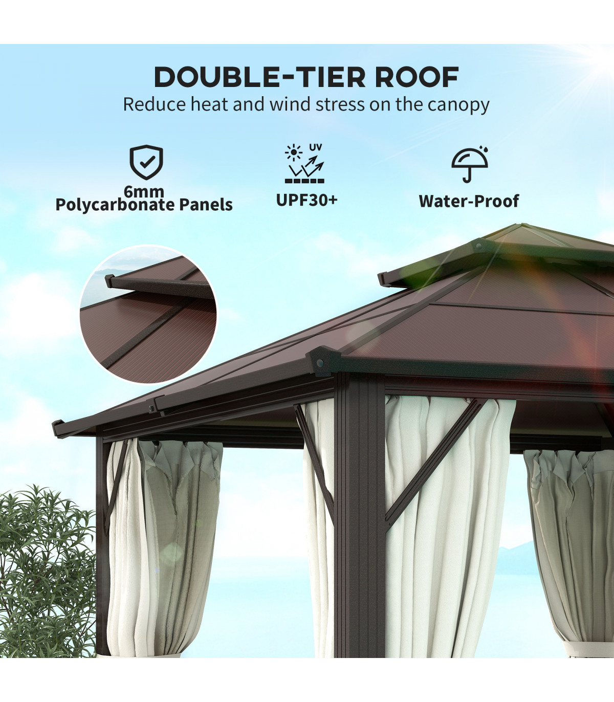 Transform your garden into a haven with the Outsunny polycarbonate gazebo. Featuring 6mm thick polycarbonate panels, this waterproof gazebo shields you from UV rays while keeping you cool with its clever two-tier airflow design. Stop the sun at any angle and get rid of unwanted winged guests with curtains and nettings. Enjoy a serene outdoor shelter with sides, great as a heavy-duty, permanent fixture for any patio.