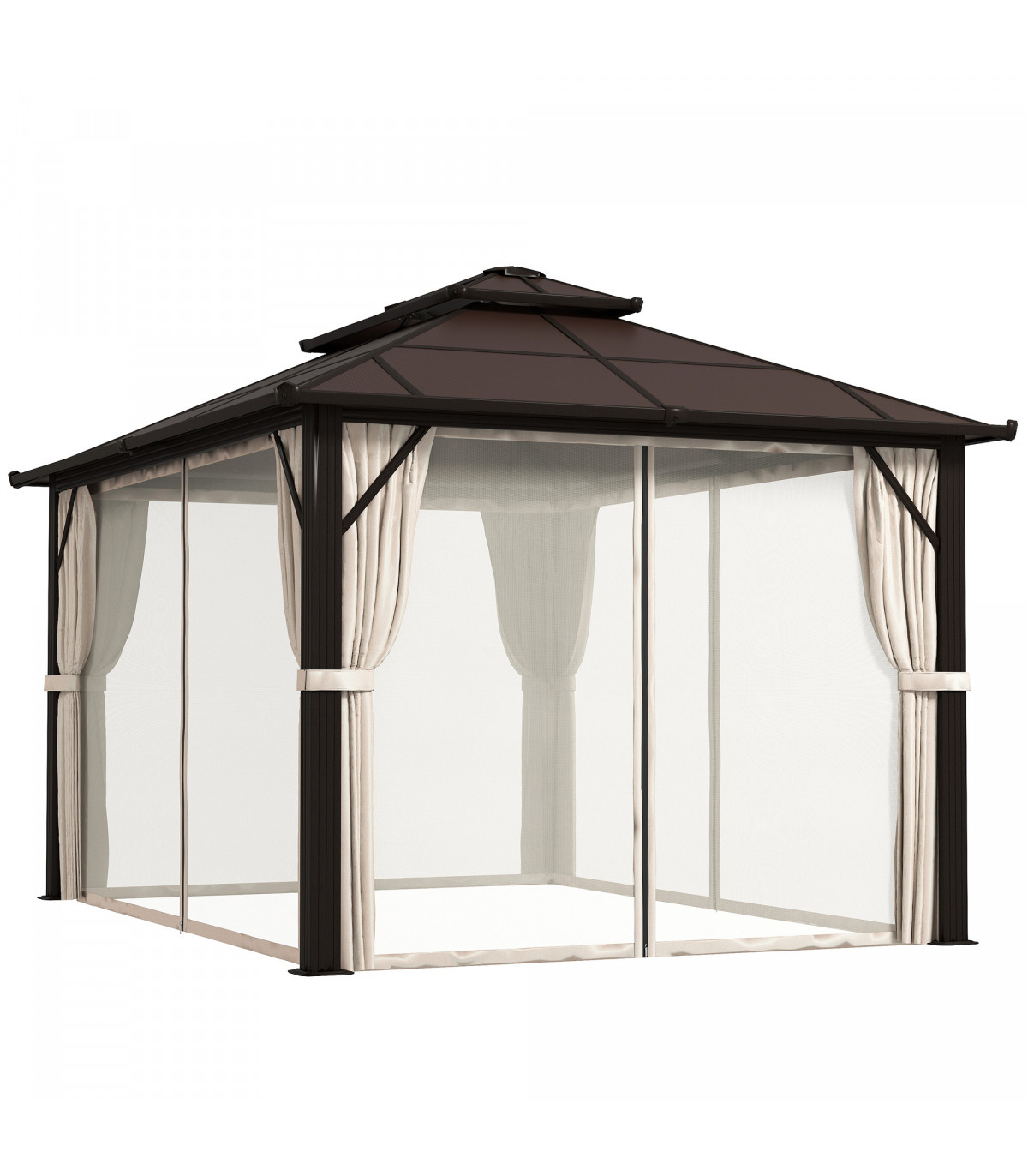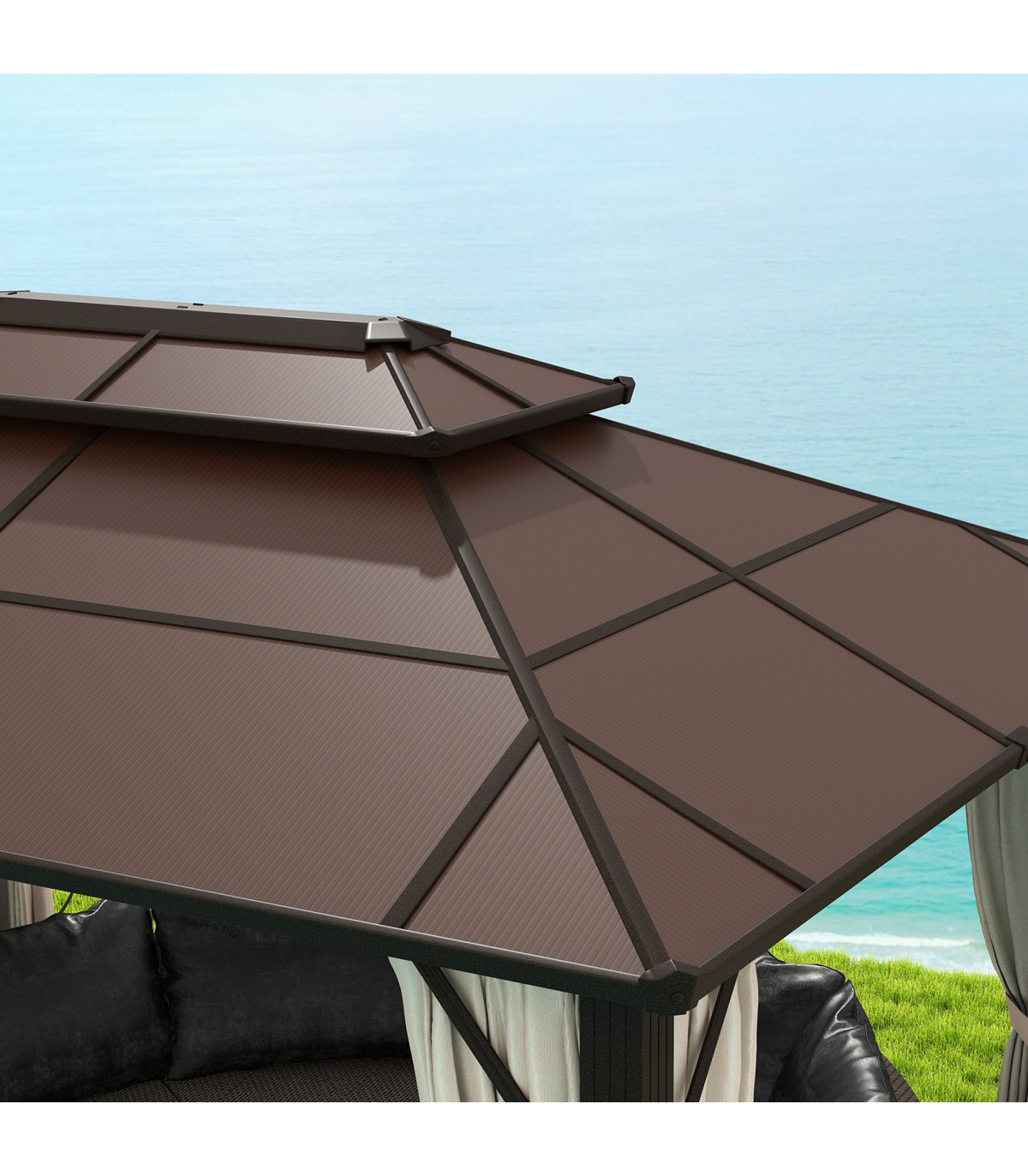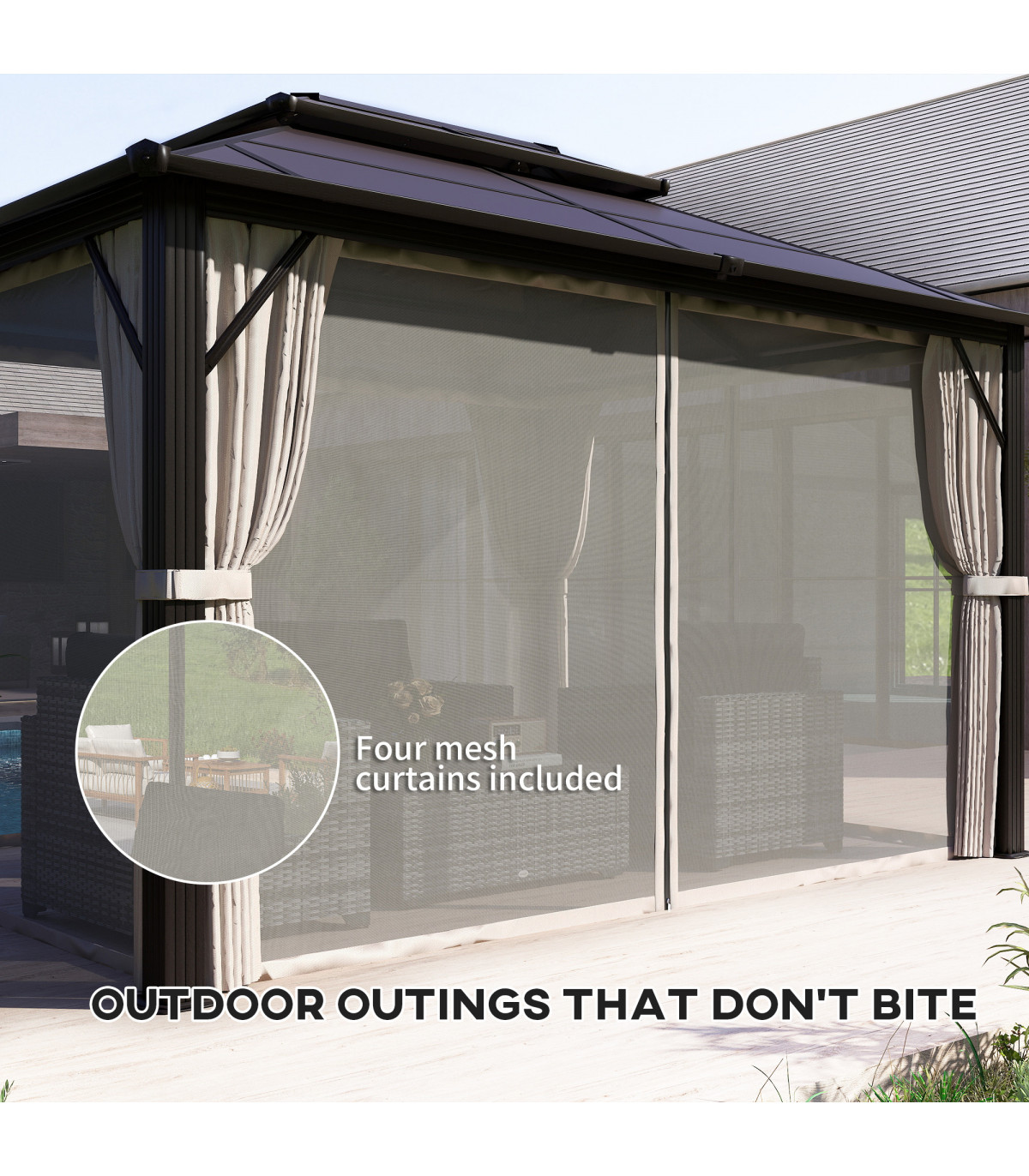 Transform your garden into a haven with the Outsunny polycarbonate gazebo. Featuring 6mm thick polycarbonate panels, this waterproof gazebo shields you from UV rays while keeping you cool with its clever two-tier airflow design. Stop the sun at any angle and get rid of unwanted winged guests with curtains and nettings. Enjoy a serene outdoor shelter with sides, great as a heavy-duty, permanent fixture for any patio.