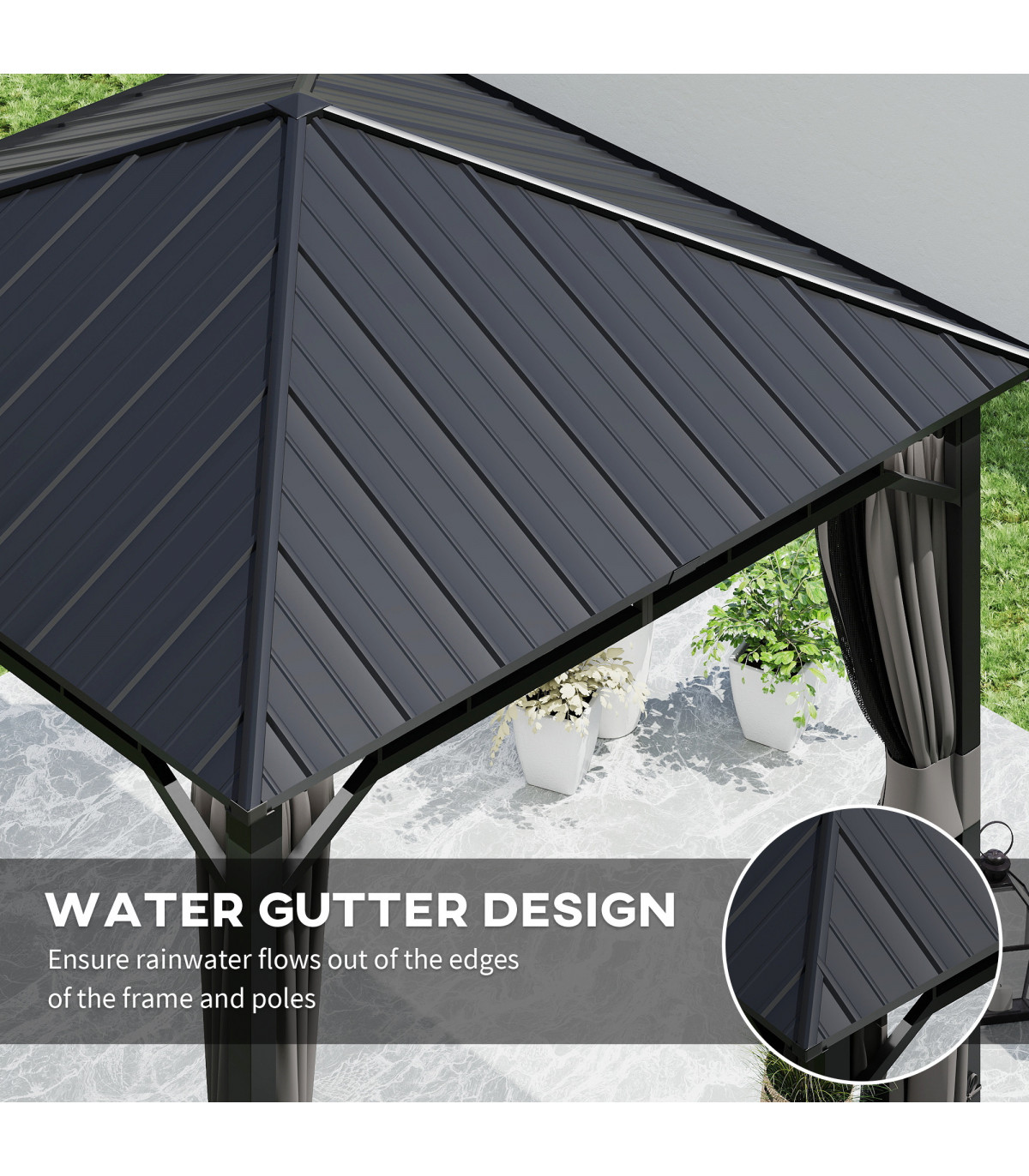 ● Water gutter design prevents roof water pooling