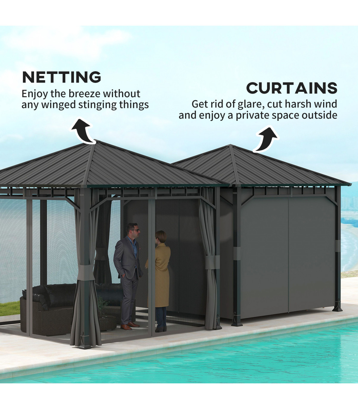 ● Curtains and netting provide privacy and insect protection