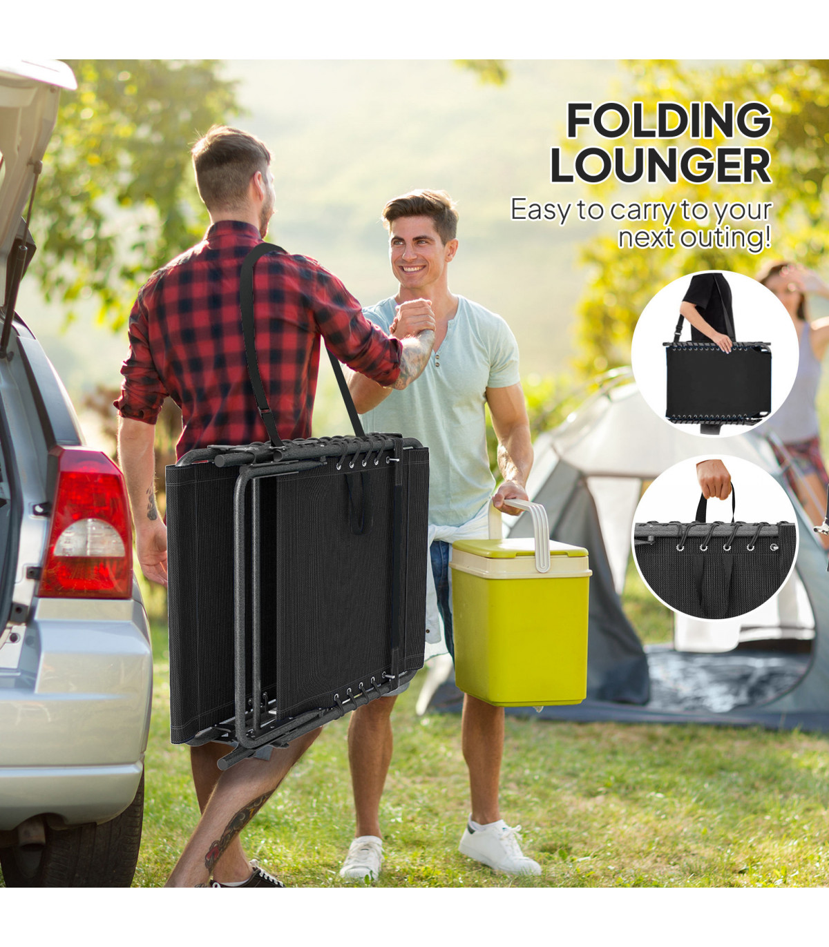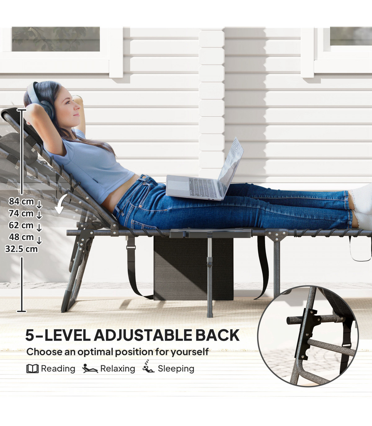 Lay the day away your way, with this Outsunny sun lounger. The back sets to five different angles to a position you want. Powder coated steel frames are strong structures to support you as you relax. The fabric seat with double elastic cords holds you comfortably, with a removable pillow for the head and neck. The side table and pocket offers storage as you relax on this foldable sun lounger, complete with a handle to carry around easily.