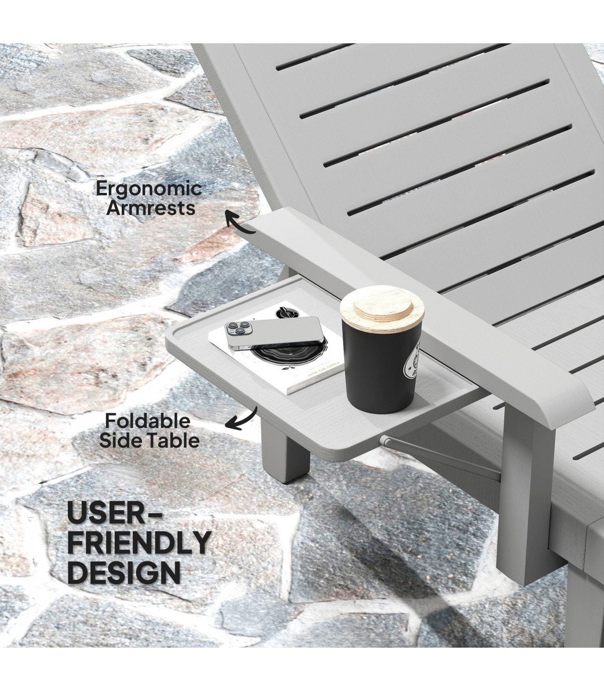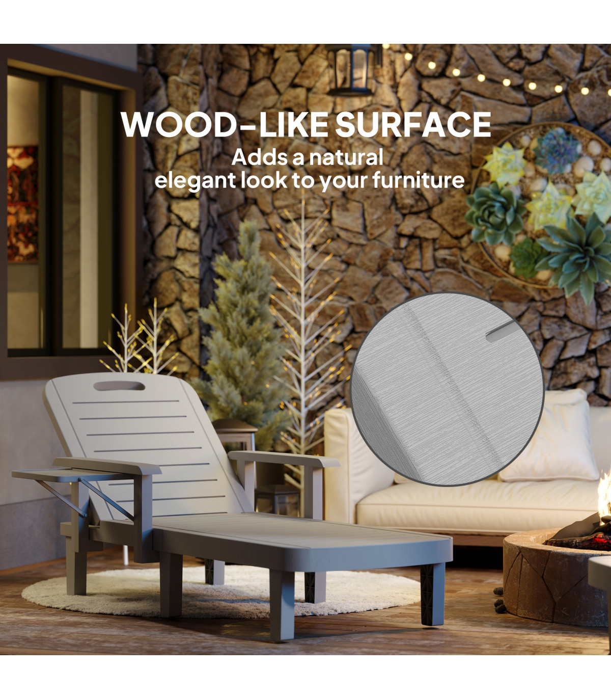 Discover the comfort of the Outsunny Sun Lounger, tailored for relaxation! With 5-level reclining positions, you can adjust from a low 32 cm to a lofty 88 cm to find your optimal spot. Enjoy the convenience of ergonomic armrests and a handy foldable side table. The weather-resistant, wood-like plastic sunbed is your great companion for garden lounging or sunbathing.
