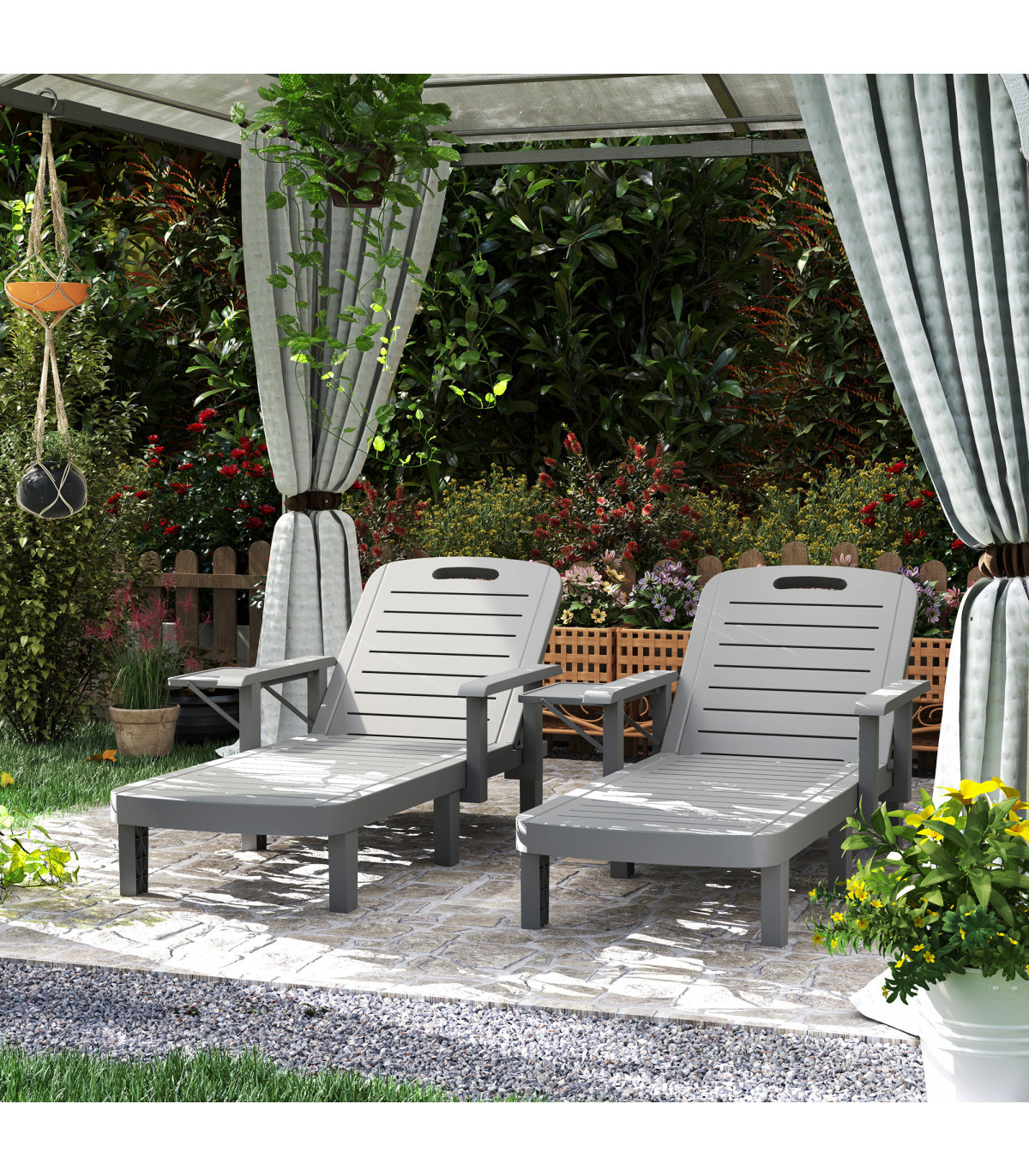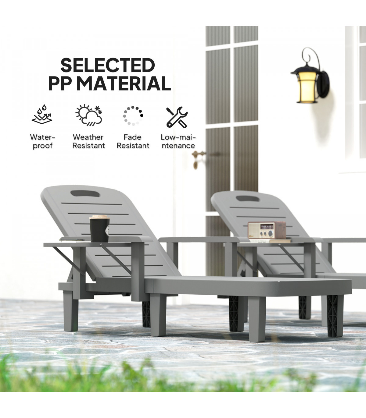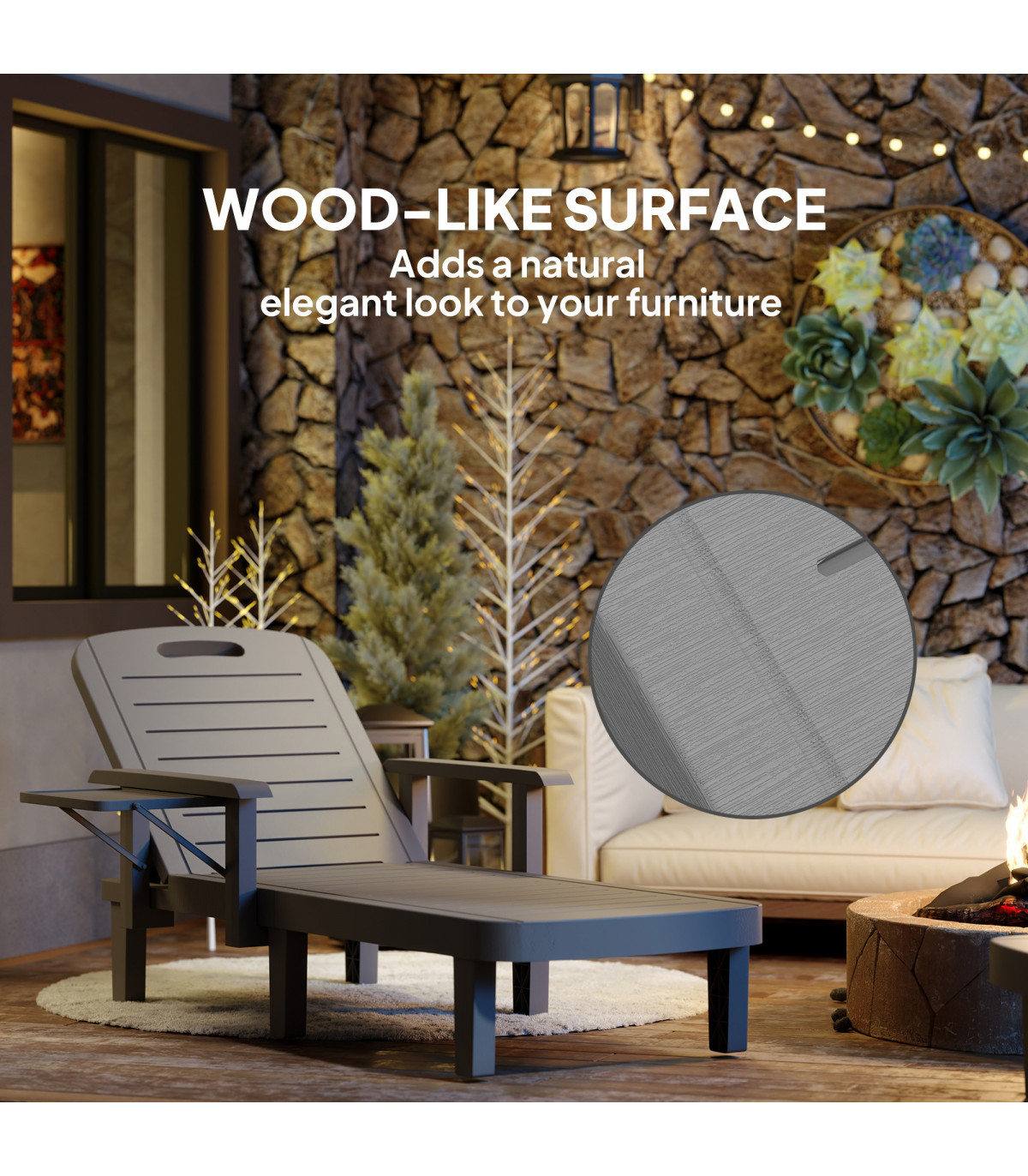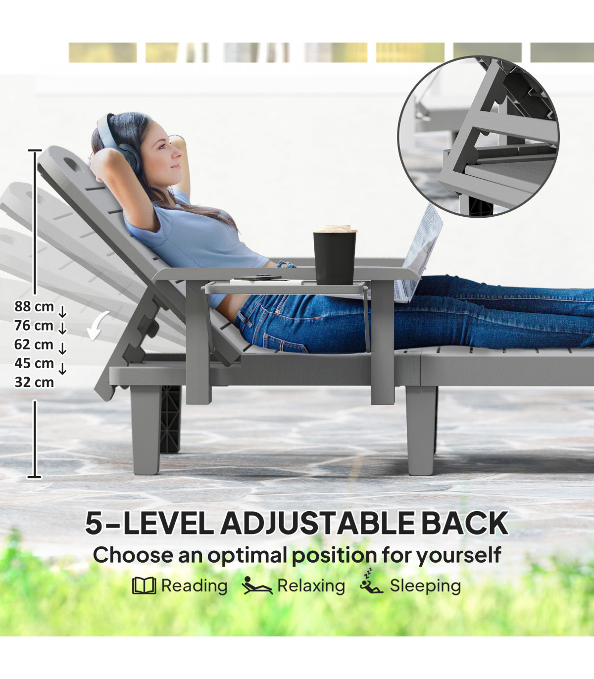 Discover the comfort of the Outsunny Sun Lounger, tailored for relaxation! With 5-level reclining positions, you can adjust from a low 32 cm to a lofty 88 cm to find your optimal spot. Enjoy the convenience of ergonomic armrests and a handy foldable side table. The weather-resistant, wood-like plastic sunbed is your great companion for garden lounging or sunbathing.