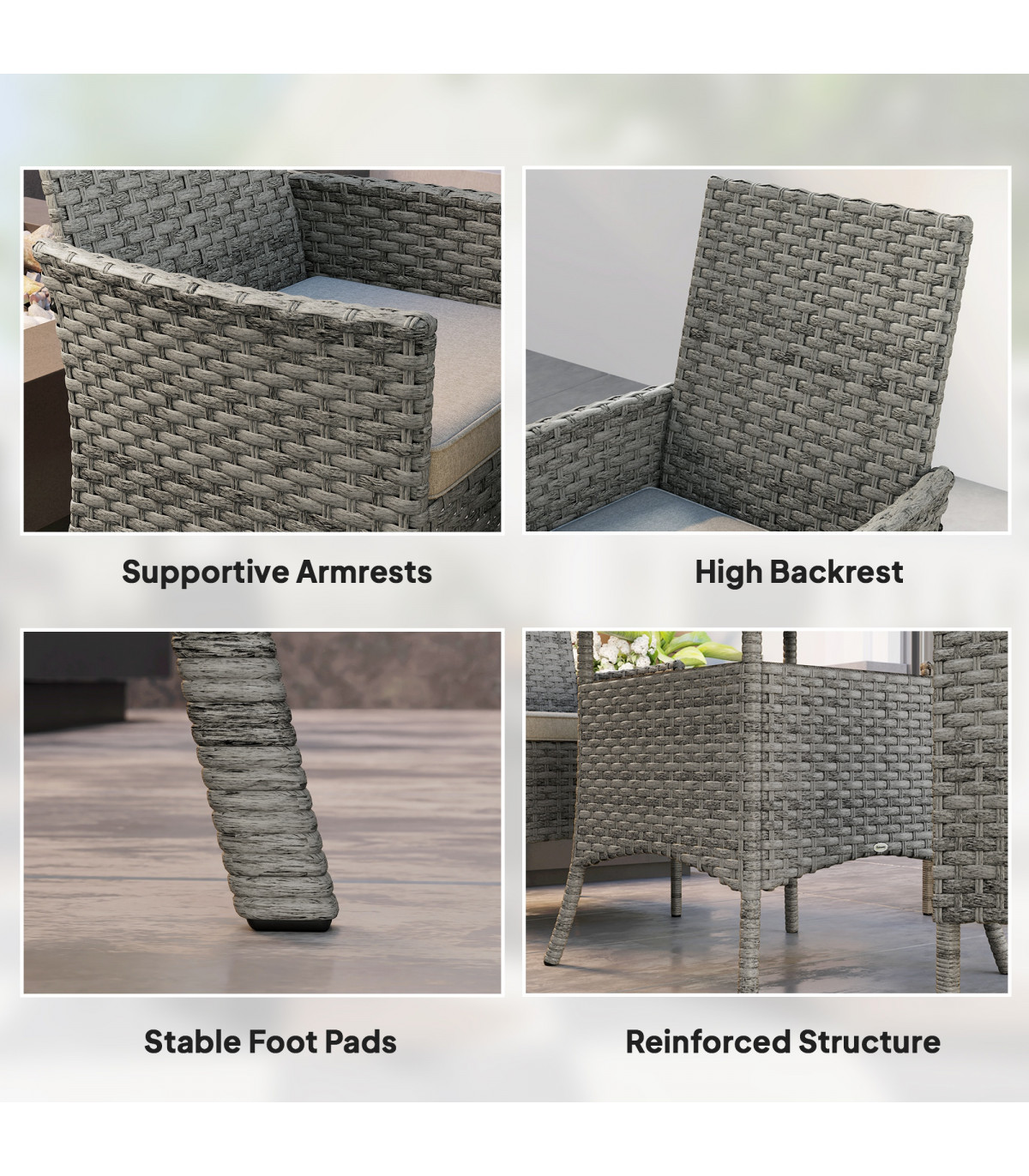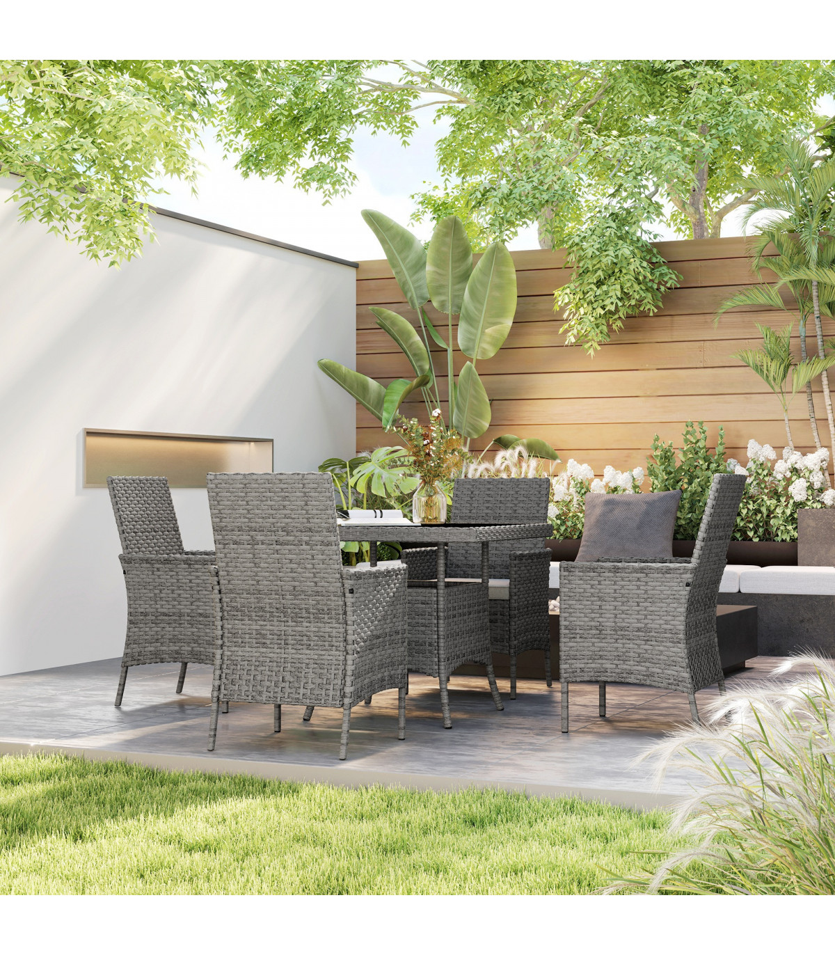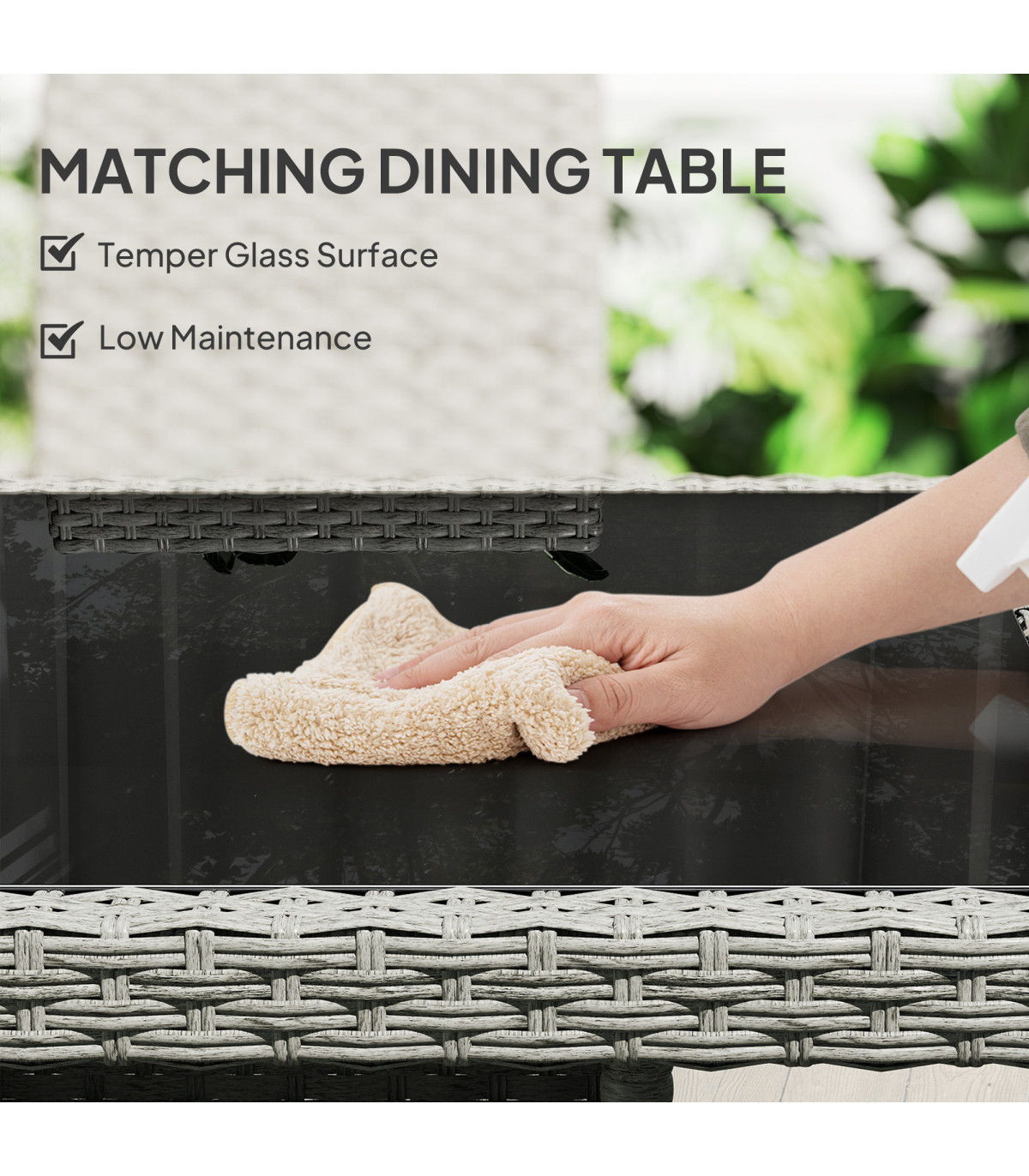 Enjoy alfresco dining with the Outsunny rattan dining set, a charming addition to any outdoor space. This 5-piece garden dining set, featuring four cosy chairs with washable cushions and a sleek table, promises comfort and style. Crafted from all weather double-strand half-round PE rattan with a robust steel frame, it's designed to weather the elements, making it a staple for any garden table and chairs collection.