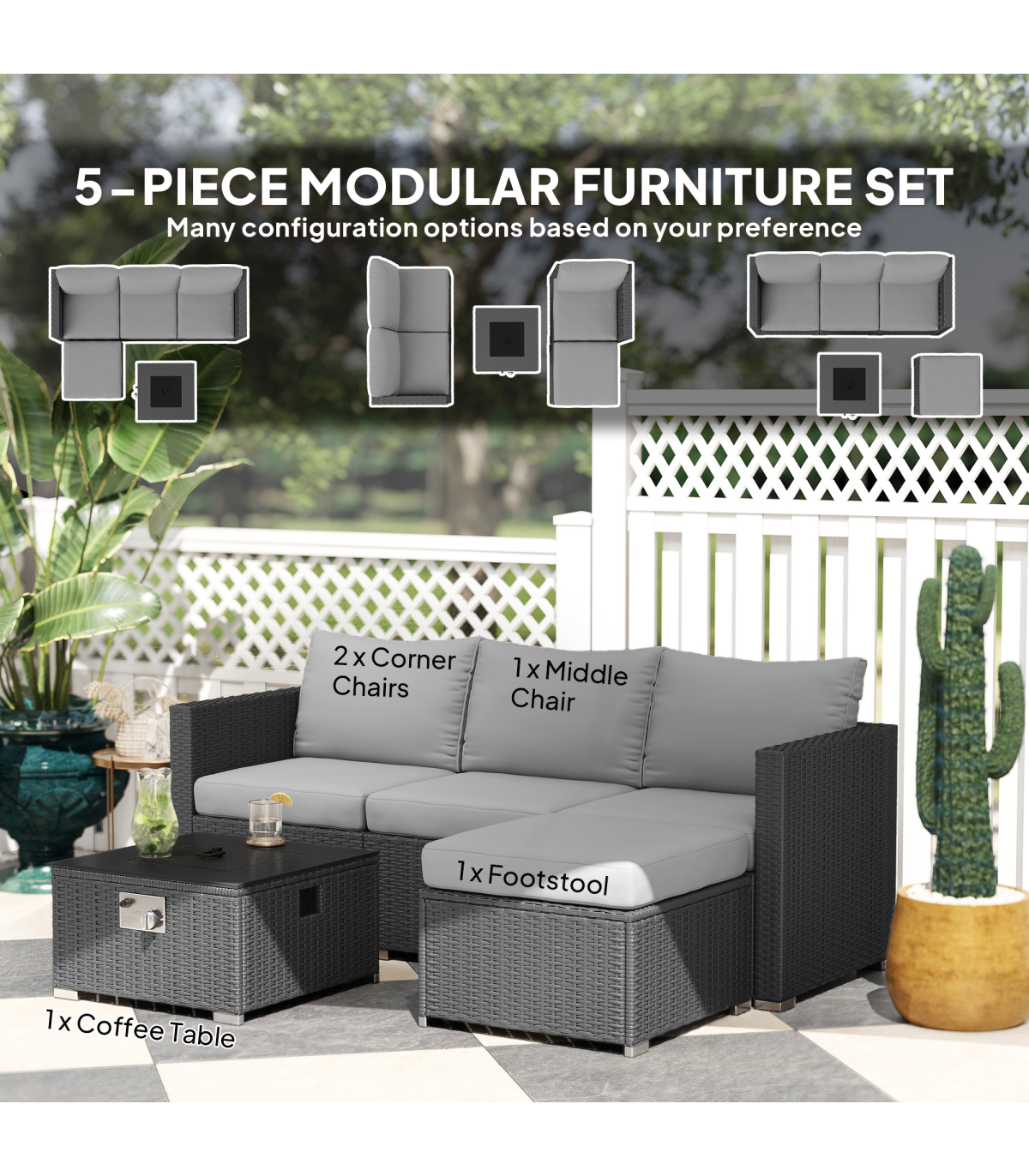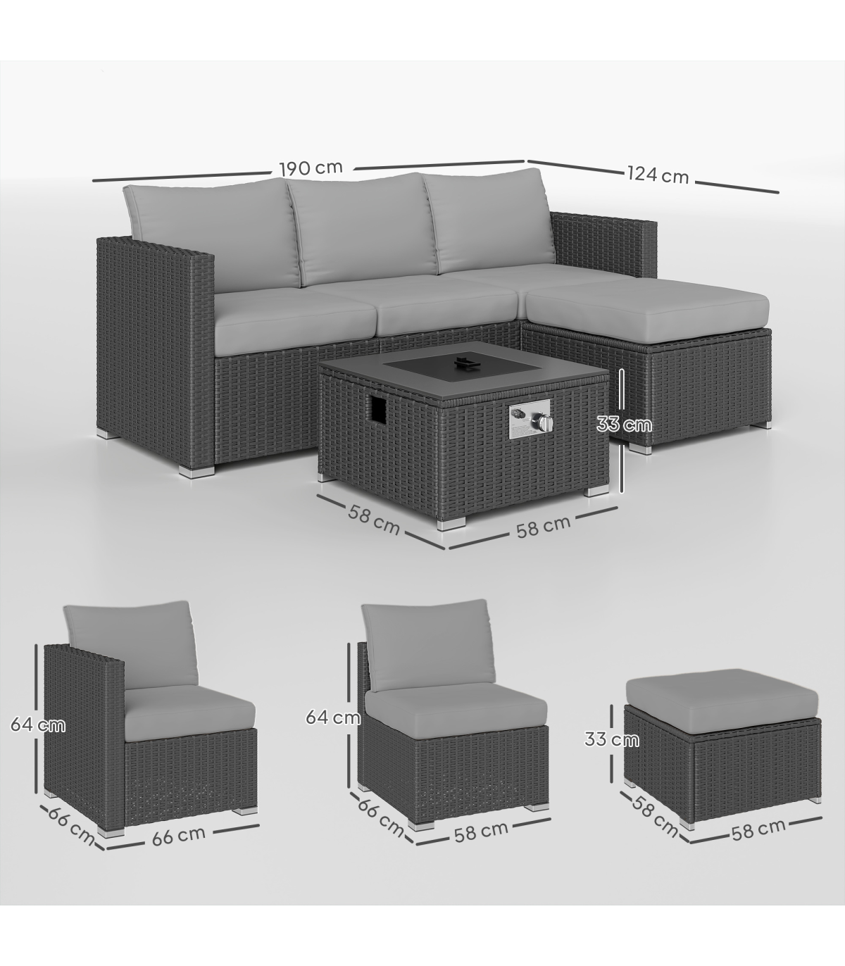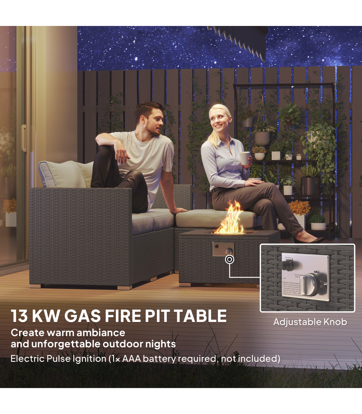 Transform your garden into a cosy haven through the corner garden furniture with fire pit table from Outsunny. This modular outdoor sofa set includes two corner chairs, a middle chair, a footstool and a square table, crafted from all-weather three-strand PE rattan on a robust steel frame. The highlight? A fire pit table doubles as a coffee table, ensuring warmth and style in your outdoors. Whether hosting friends or enjoying a quiet moment, the Outsunny rattan sofa set enhances your space.