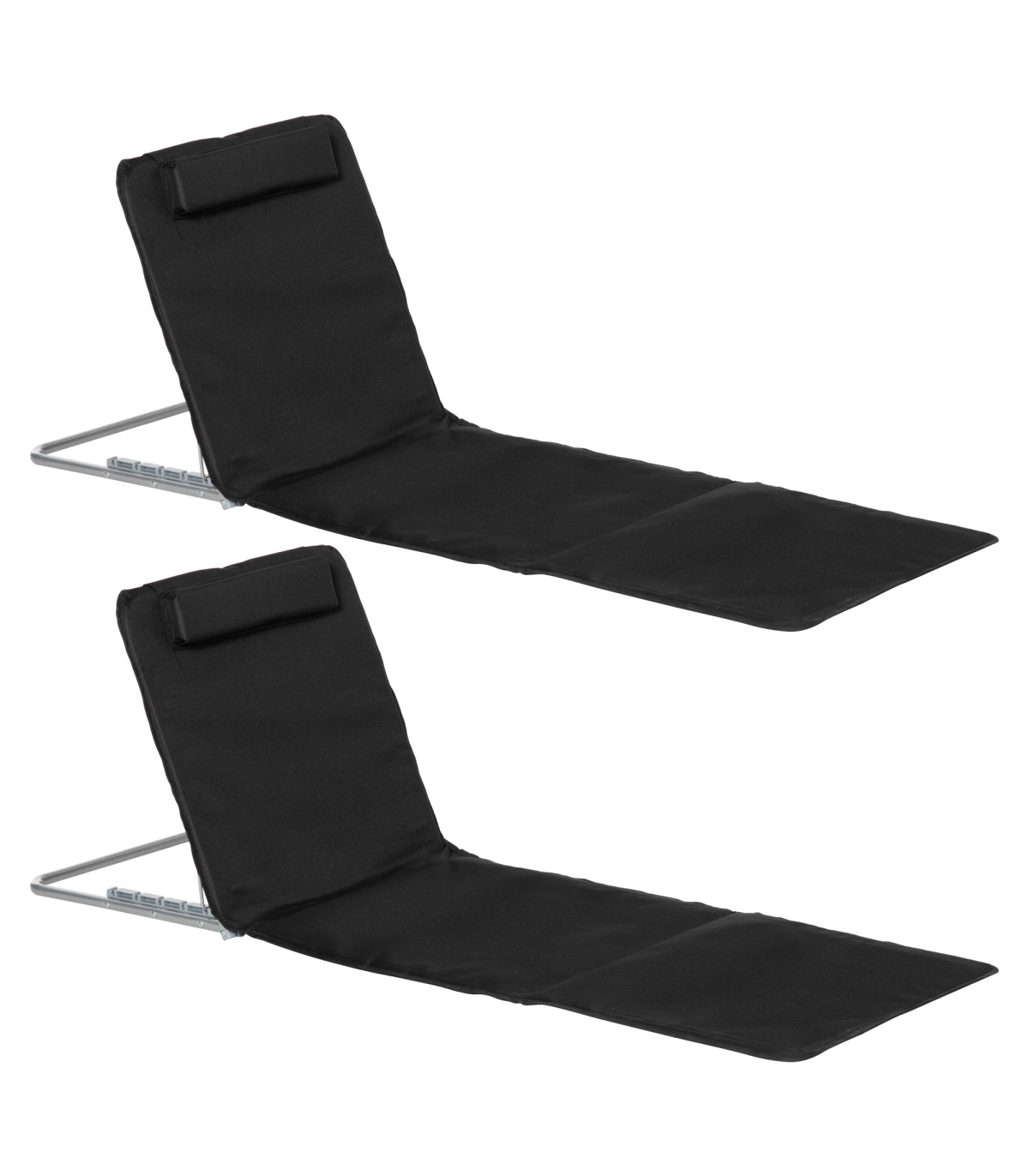 SET OF TWO MATS: Perfect for enjoying the sun and the sea with a friend, this folding beach lounger provides a comfortable seat for you all day long, preventing your body burning on the sand.FIVE-LEVEL ADJUSTABLE BACK: Sets to a level best for you, our portable beach lounger allows you to lie back and relax comfortably.METAL FRAME: Powder coated for extra protection, the beach chair ensures a strong and solid core to last all season and beyond. PADDED SEAT: Stretched across the frame for firm support to your body, PE fabric protects against light water contact and 3-layer design with padding in the middle for added comforts.ATTACHED PILLOW: Provides comfort and support to your head and neck. FOLDABLE DESIGN: With an included carrying bag, these foldable sun loungers allow you to carry them easily.DIMENSIONS: 36-45H x 48W x 134Dcm. Seat: 48W x 89Dcm. Folded: 3.5H x 49.5L x 48Wcm. EASY TO ASSEMBLE.