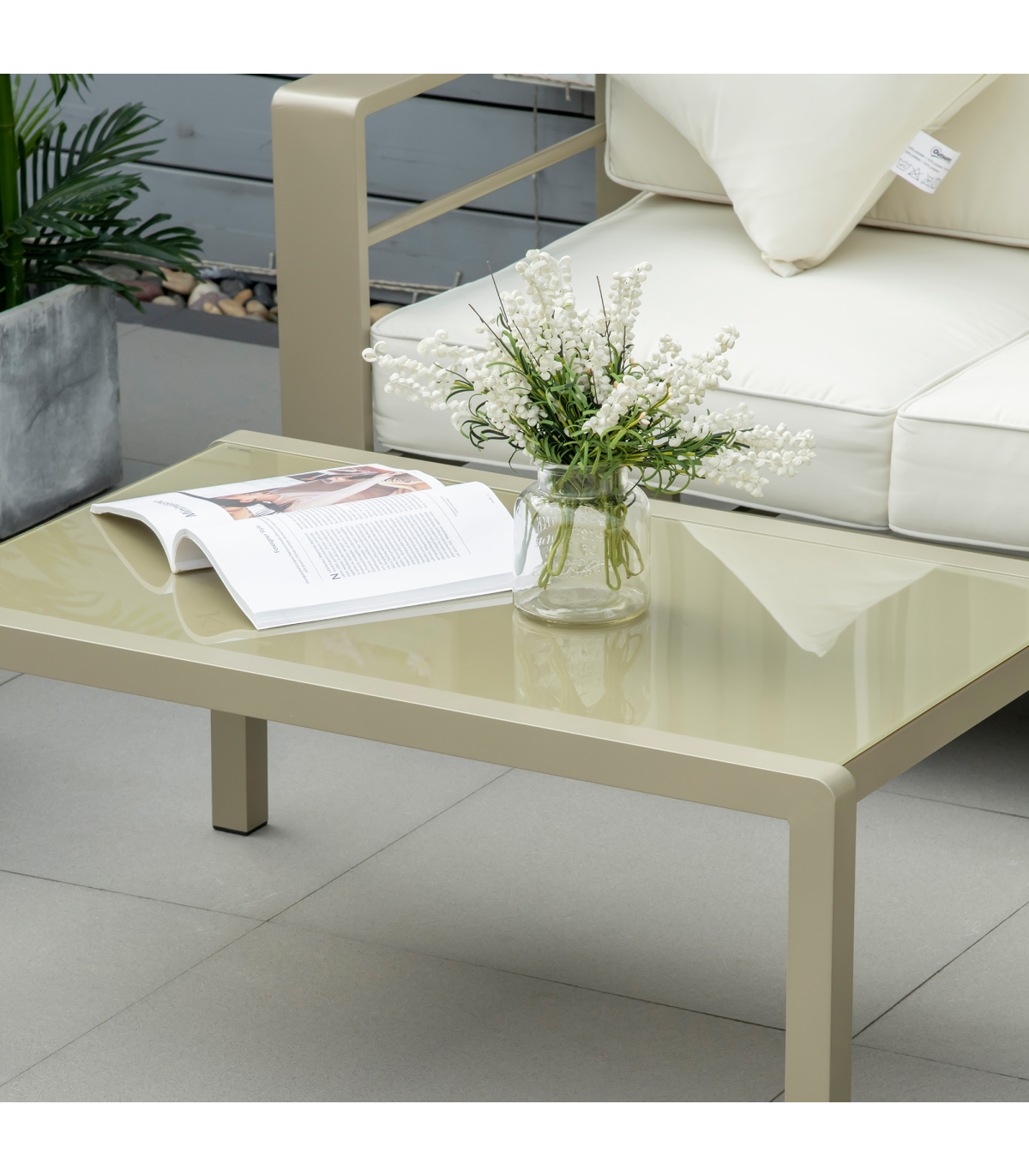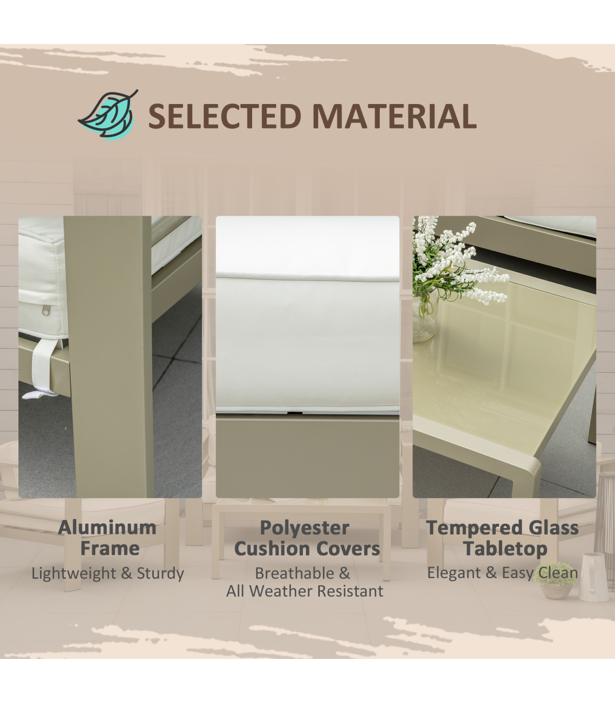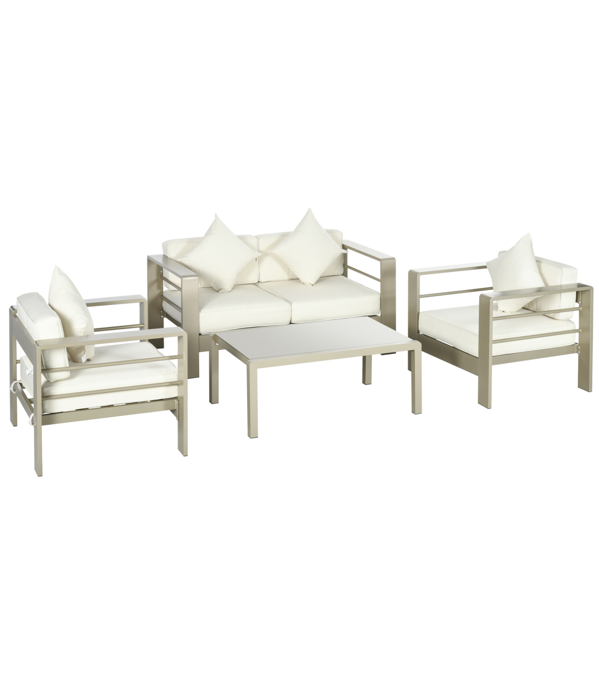Comfort, with a chic touch - this Outsunny four-piece garden set is here to make an impact in your home, this season and beyond. Each piece is made from powder coated aluminium for a strong core, coated in a champagne gold colour - elegant. Set comes with a two-seater sofa, two armchairs and a matching coffee table, bringing your closest people together. Seat and back cushions for comfort. A glass table top for a sleek finishing touch.