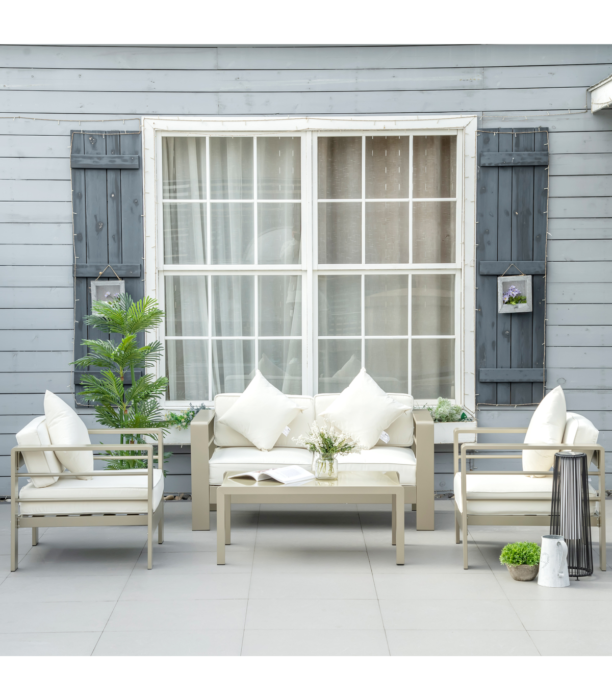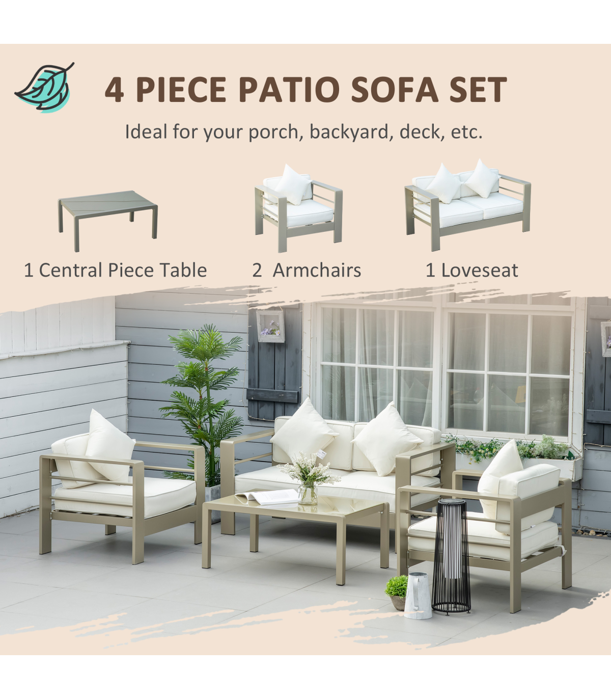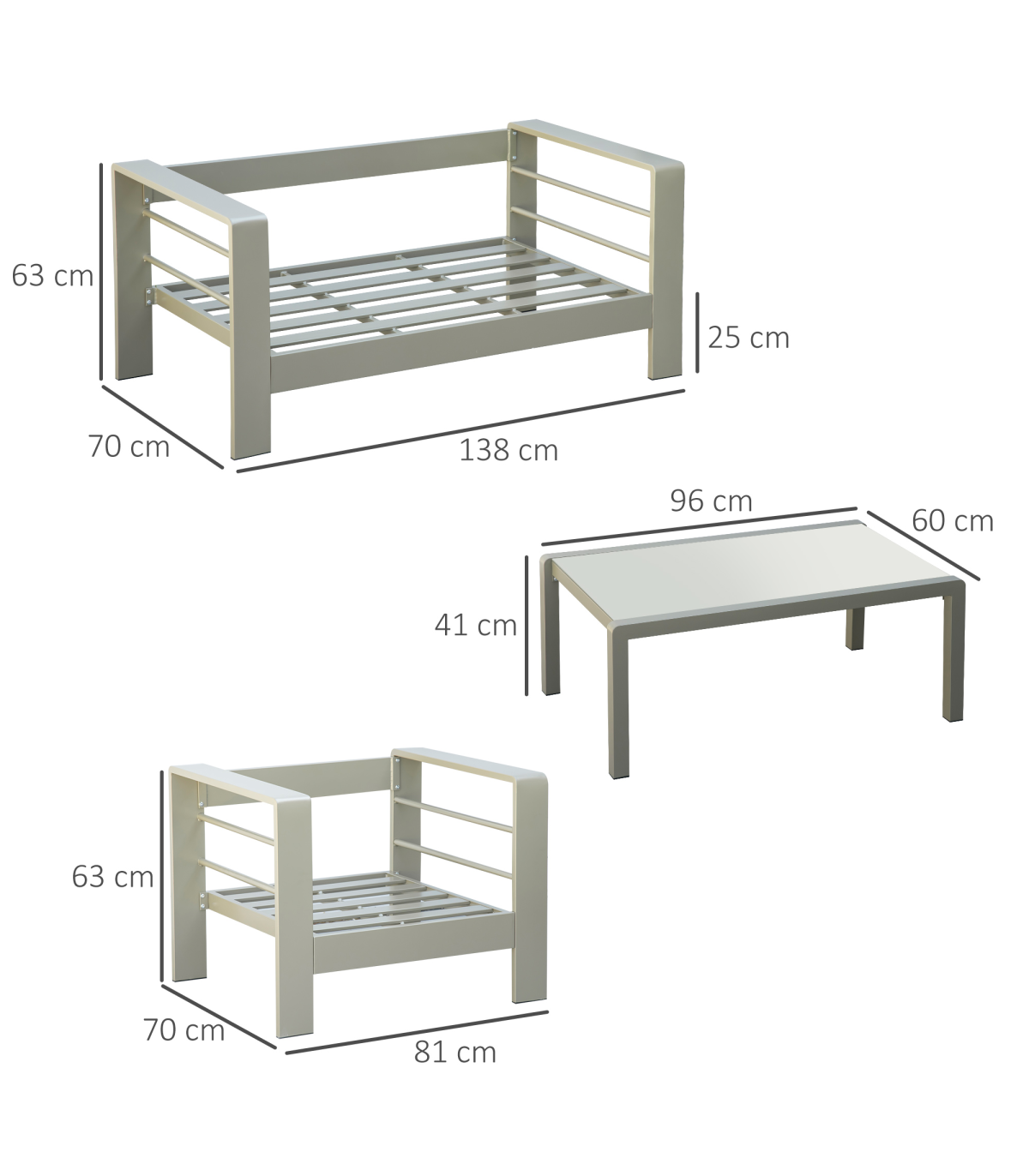 Four-piece aluminium garden furniture set: Comes with a loveseat, two armchairs and a matching coffee table - ideal for seating friends and family outside together.Tempered glass table: Strong surface in a sleek look, offering a handy place to keep things close by, as you relax into this garden furniture set.Comfortable: Wide seating and high backs of the sofa and chairs, in this aluminium garden sofa set, offer plenty of resting room. Padded seat and back cushions, with removable and washable cushion covers.Aluminium frames: Powder coated metal garden furniture set for strong support, in a beautiful champagne gold coloured finish.Dimensions: Loveseat: 138W x 70D x 63Hcm. Chair: 81W x 70D x 63Hcm, Table: 96L x 60W x 41Hcm. Assembly required.