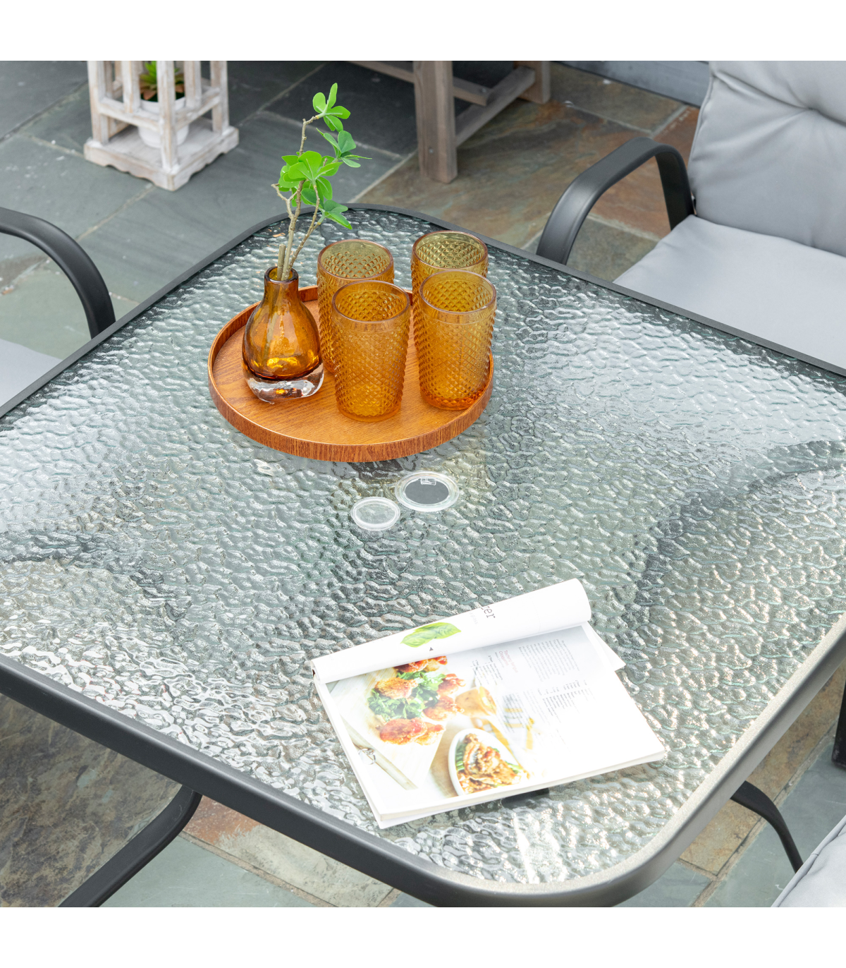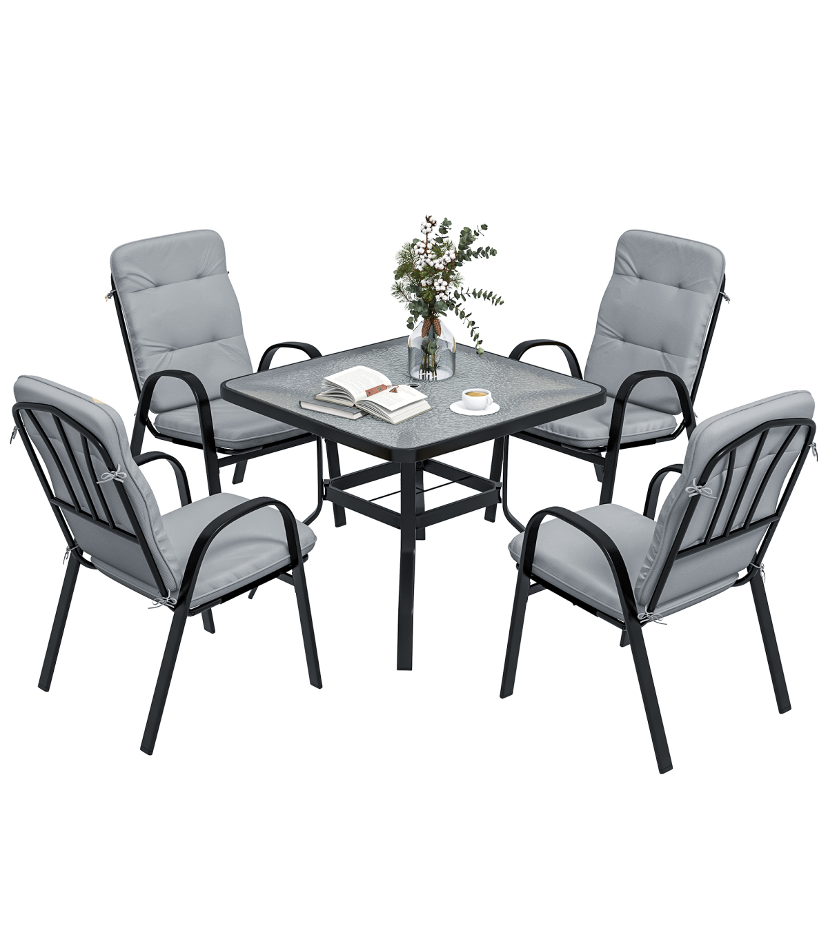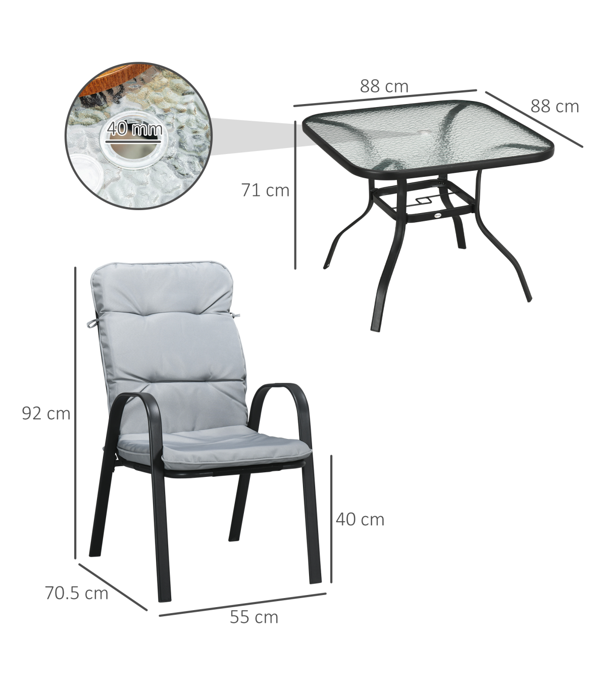 Outsunny Garden Dining Set, Glass Table w/ Umbrella Hole & Texteline Seats" Description: - Five-piece garden dining set: Comes with four cushioned chairs and a matching dining table. - Seats four: Relax and unwind with company. - Glass-top table with umbrella hole: Relax with protection in this four-seater garden furniture set. - Hole fits parasol umbrella with a 38mm-sized pole. - Padded chairs: Sink and relax while seated on this patio table and chairs set. - High back and armrests for support. - Steel frames: Strong metal core to offer support as you sit. Dimensions: - Table: 71H x 88L x 88Wcm. - Chair: 92H x 55W x 70.5Dcm. Maximum load: - Table: 50kg. - Chair: 120kg. Assembly required.