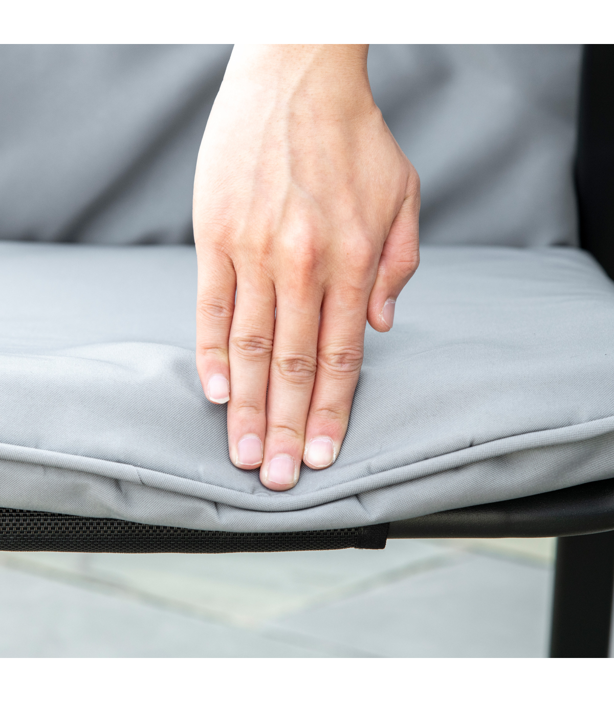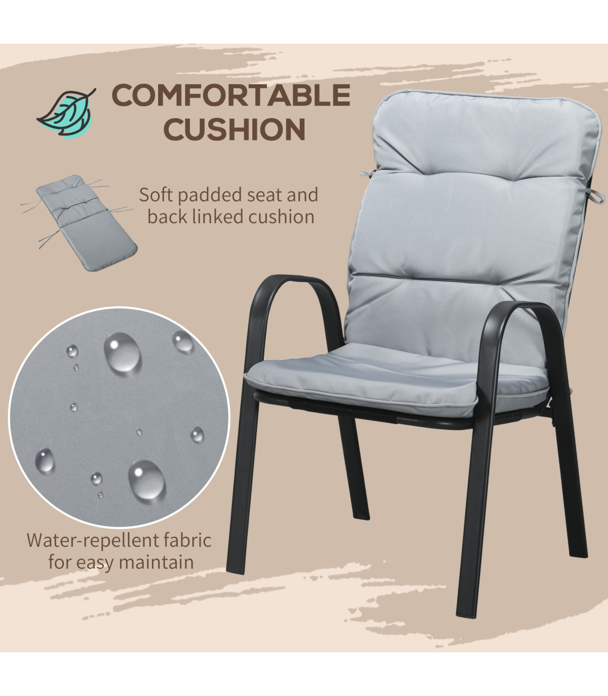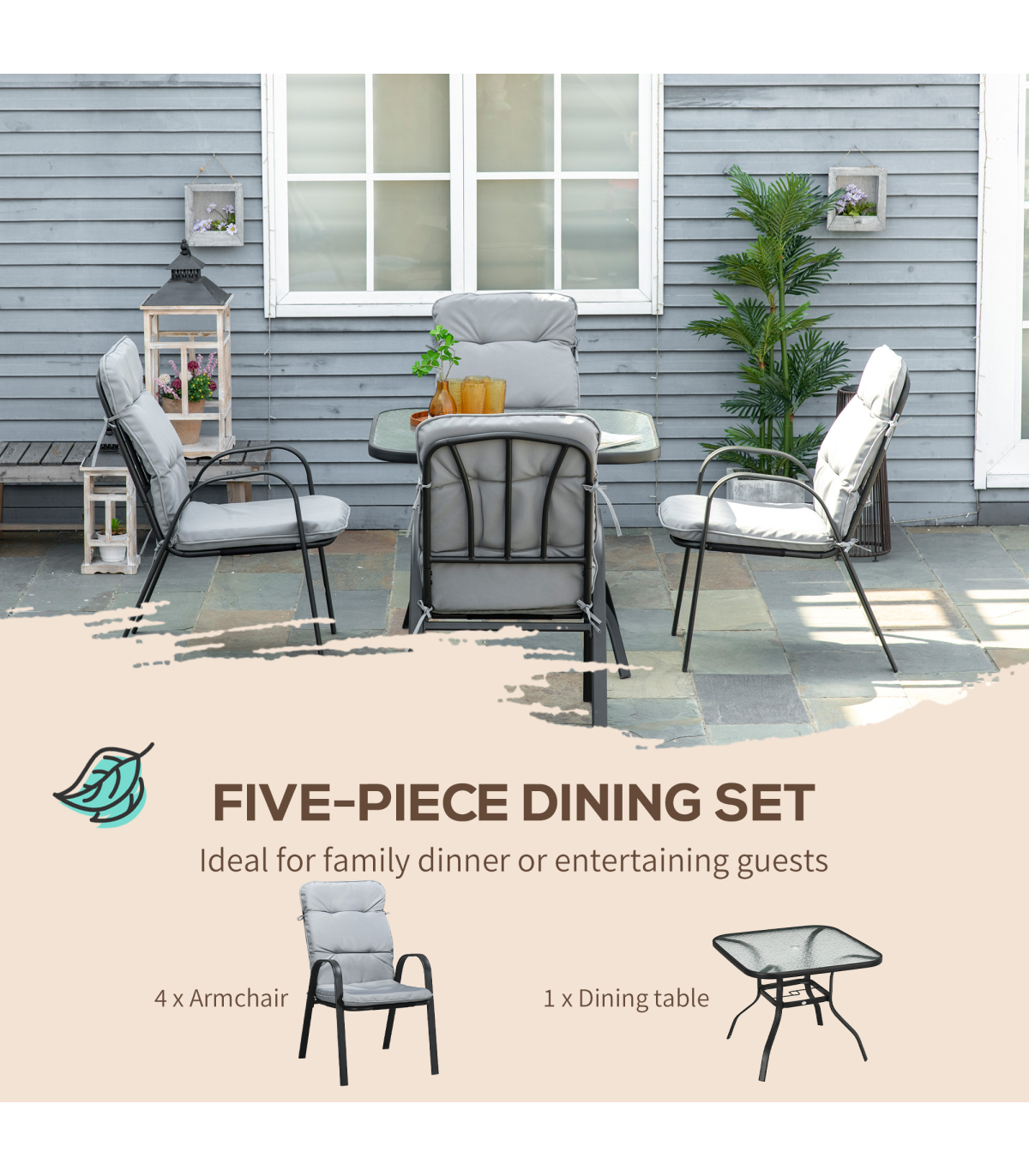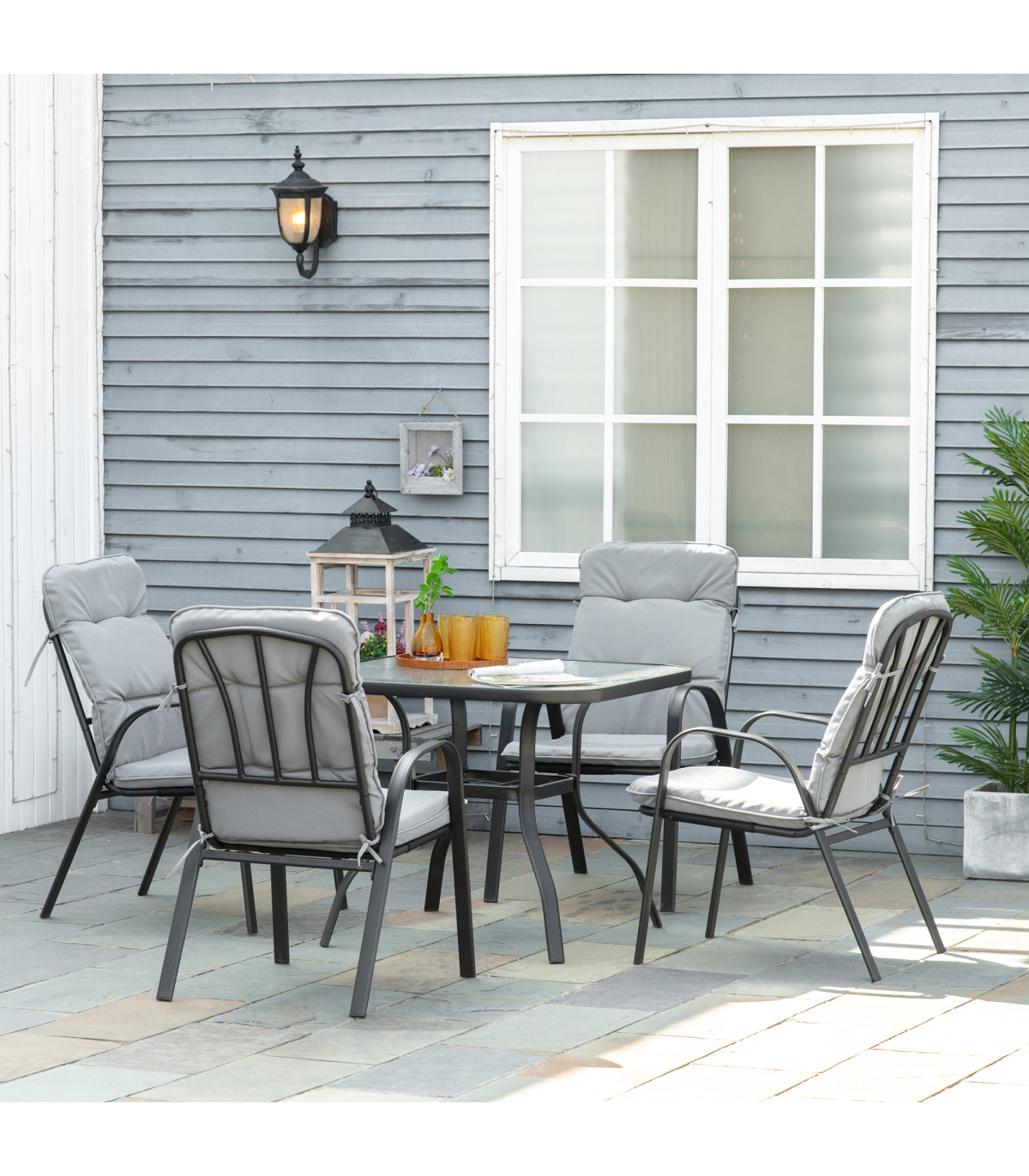 Enjoy your socialising time outdoors comfortably - look to this garden table and chairs set from Outsunny. Comes with four padded armchairs and a tempered glass-top table. Steel frames make each piece strong. High backs and armrests on the chairs for support, with a padded seat for comfort. The table is fitted with a tempered glass tabletop - comes with a middle hole to hold a parasol umbrella in place (�38mm sized pole).