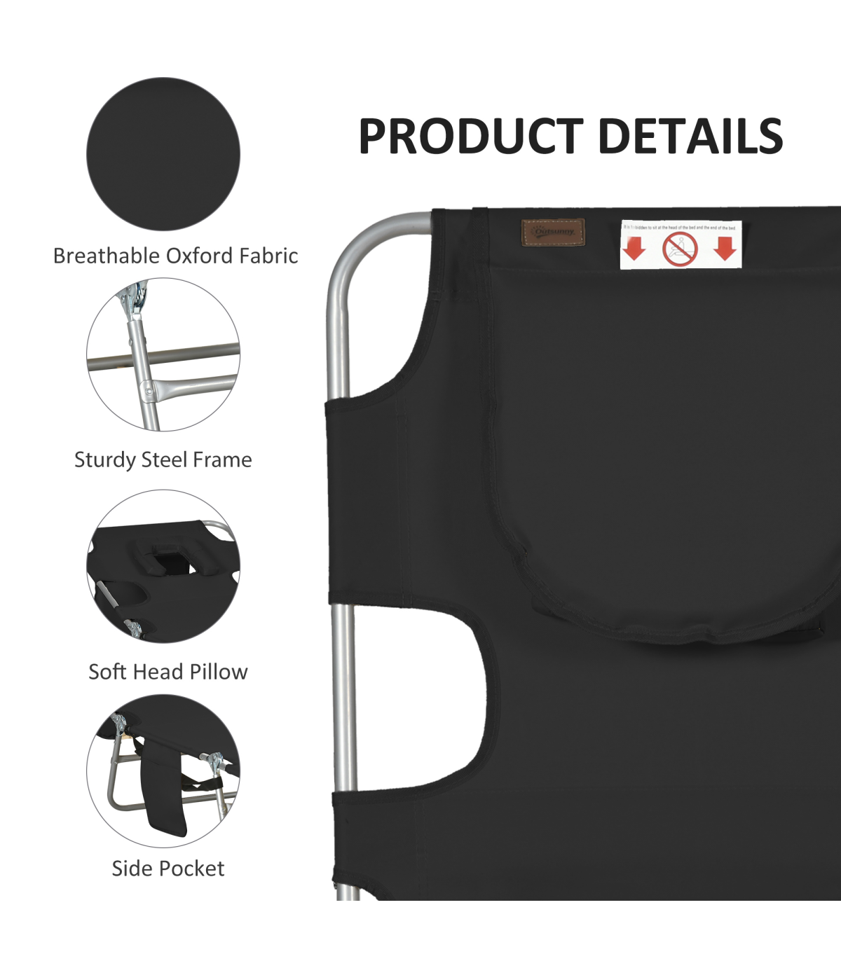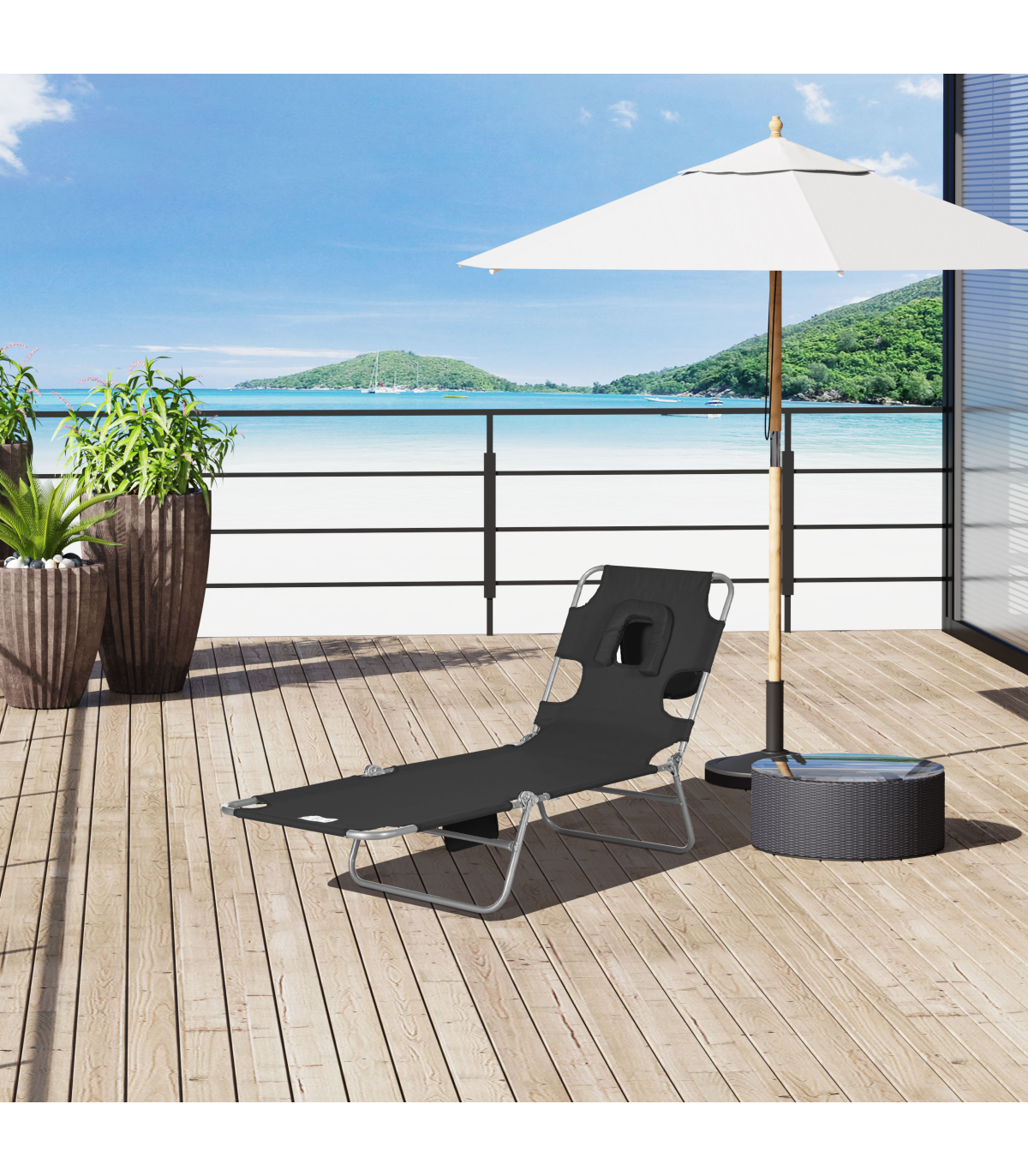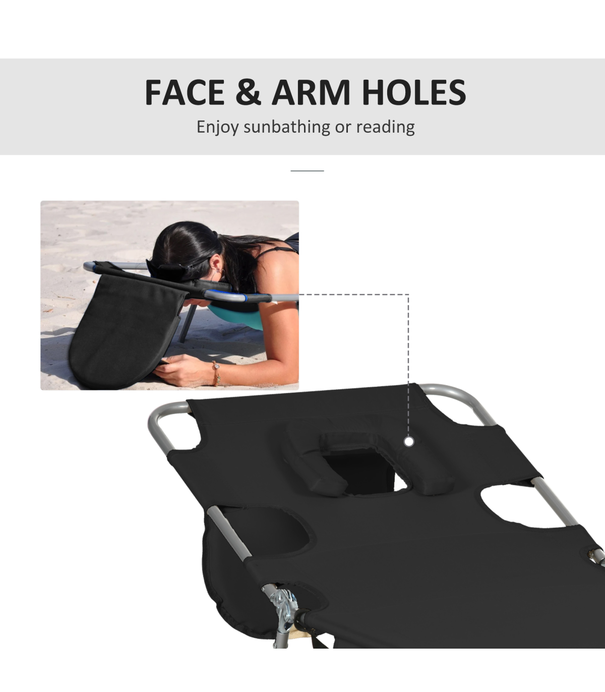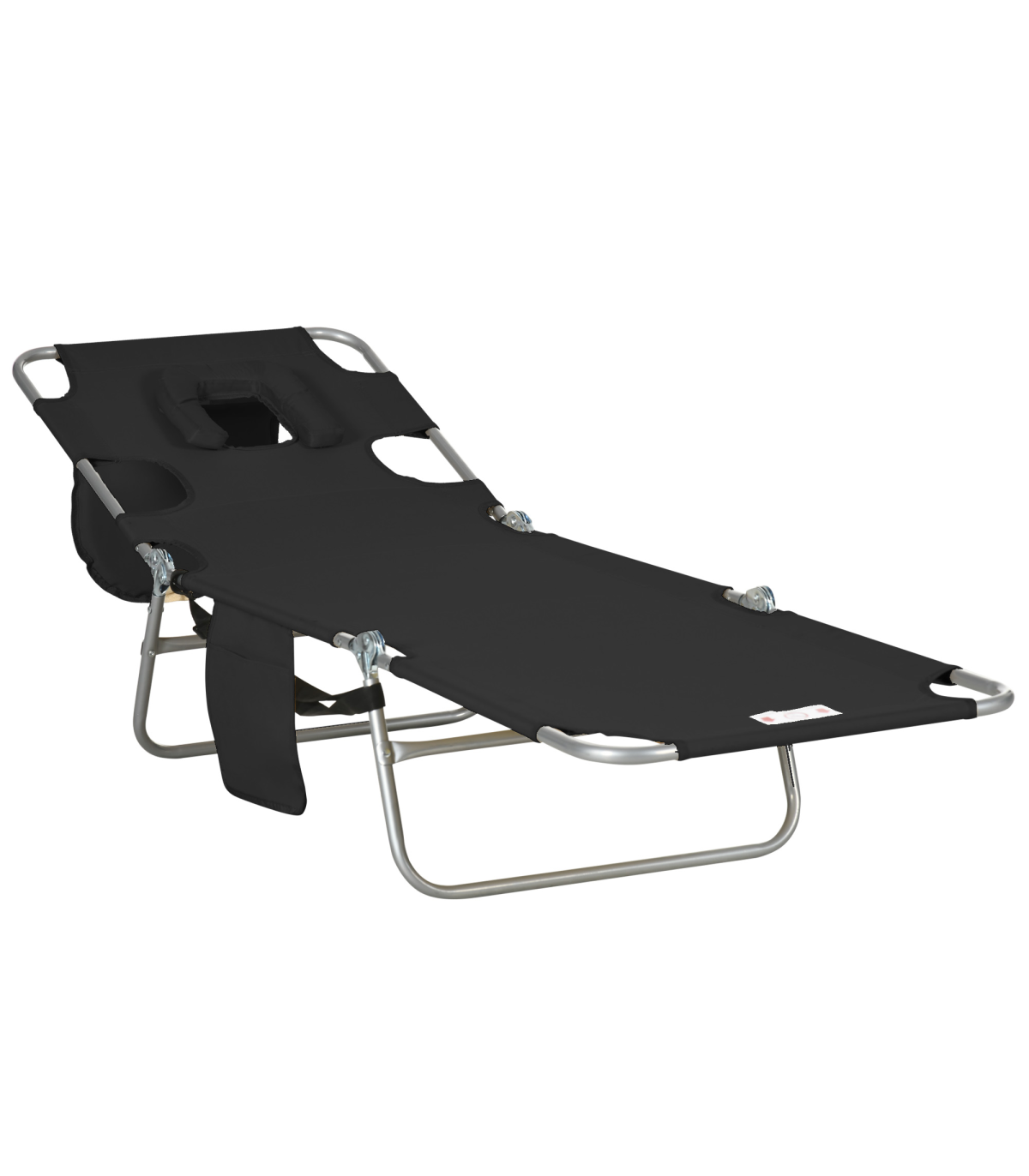 A cool update on the foldable sun lounger from Outsunny. Features a padded head hole at the front to allows you to rest your face in comfortably, which is perfect for relaxing or even reading a book! The powder coated steel frame is strong and solid to support up to 120 kg. The reclining backrest is five positions adjustable, easy to set and lock to a position you like best. Complete with a handy side pocket.