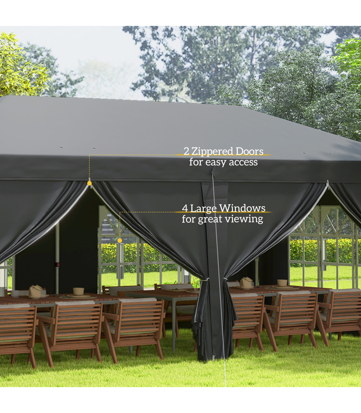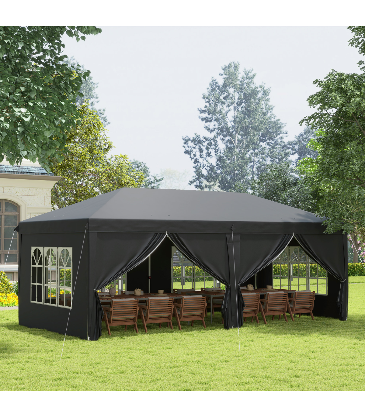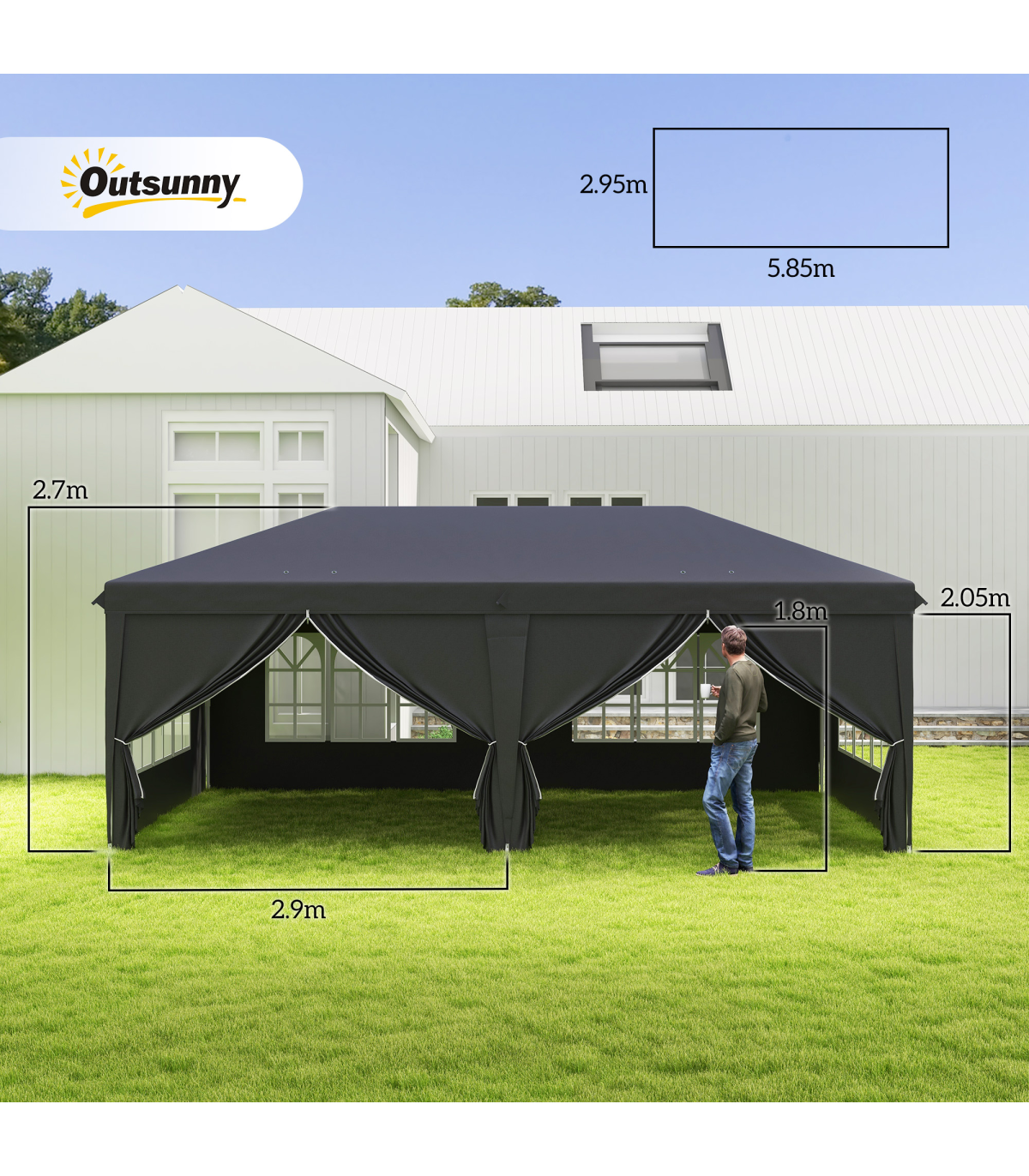 This Outsunny marquee gazebo with sides is perfect for garden parties, BBQs, camping trips, and other outdoor events. The pop-up design allows for quick and easy set up, while the sidewalls with windows provide great visibility. The silver-coloured lining of the canopy helps to retain heat and protect against extreme sunlight. The adjustable steel frame offers three different height options, making it versatile for various occasions. This party tent comes with a carry bag, guy ropes, and ground stakes for added convenience. With dimensions of 5.85L x 2.95Wm, a top height of 2.7m, and an eave height of 2.05m, this gazebo provides ample space for hosting friends and family.