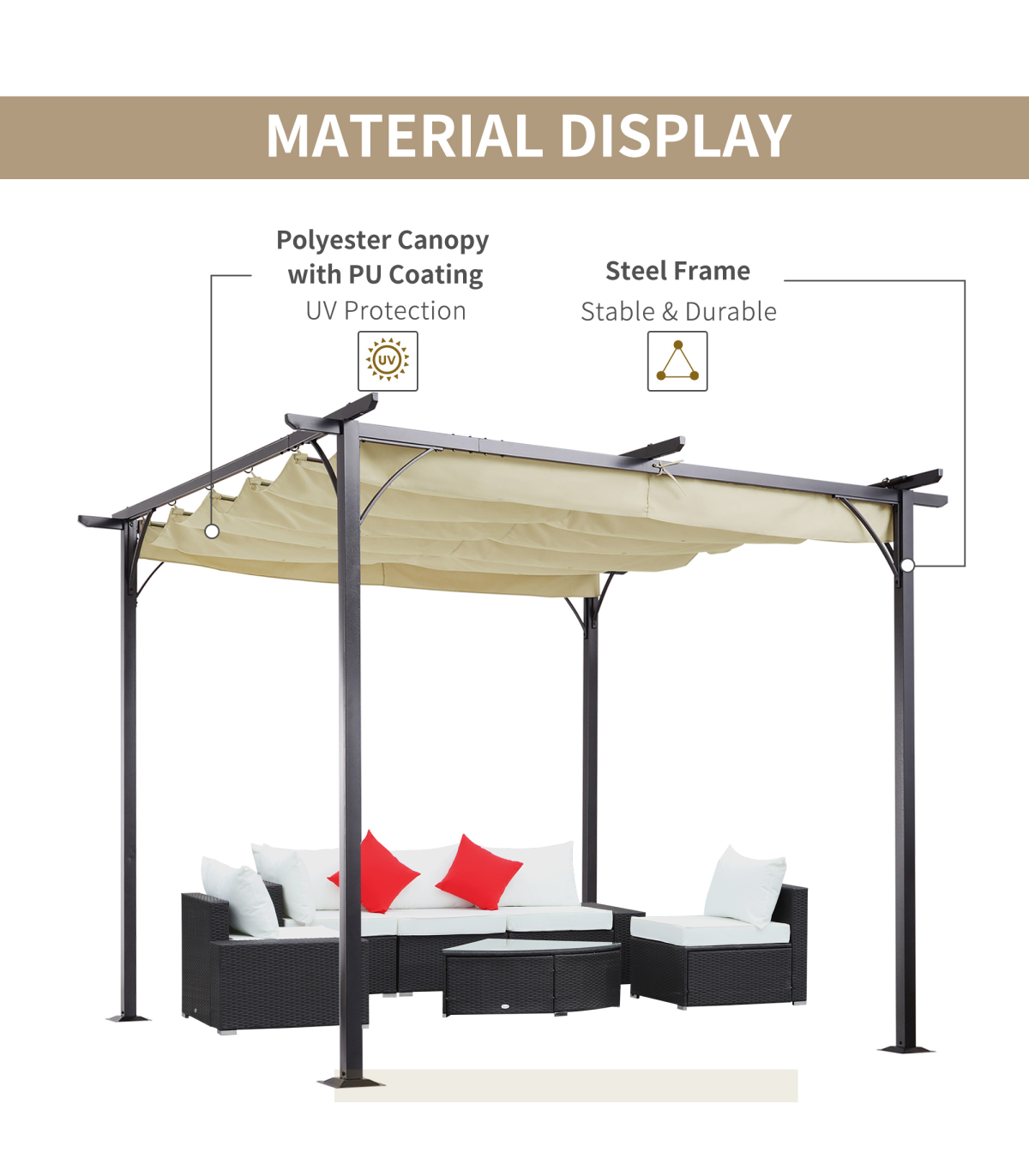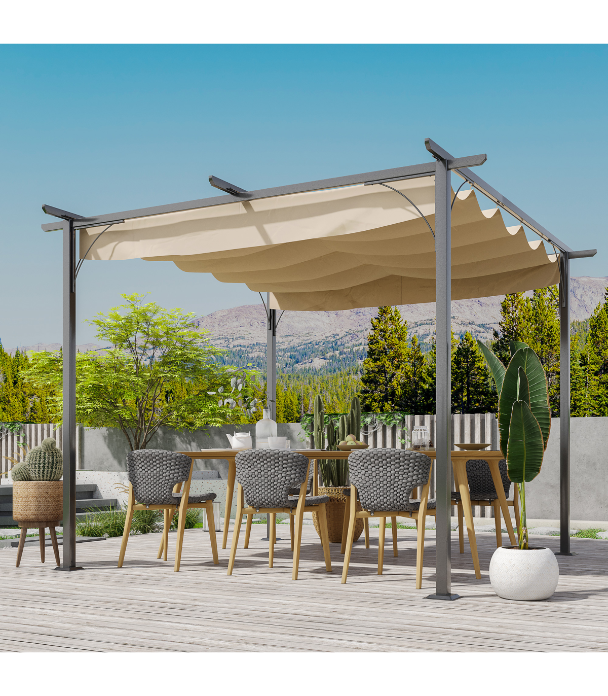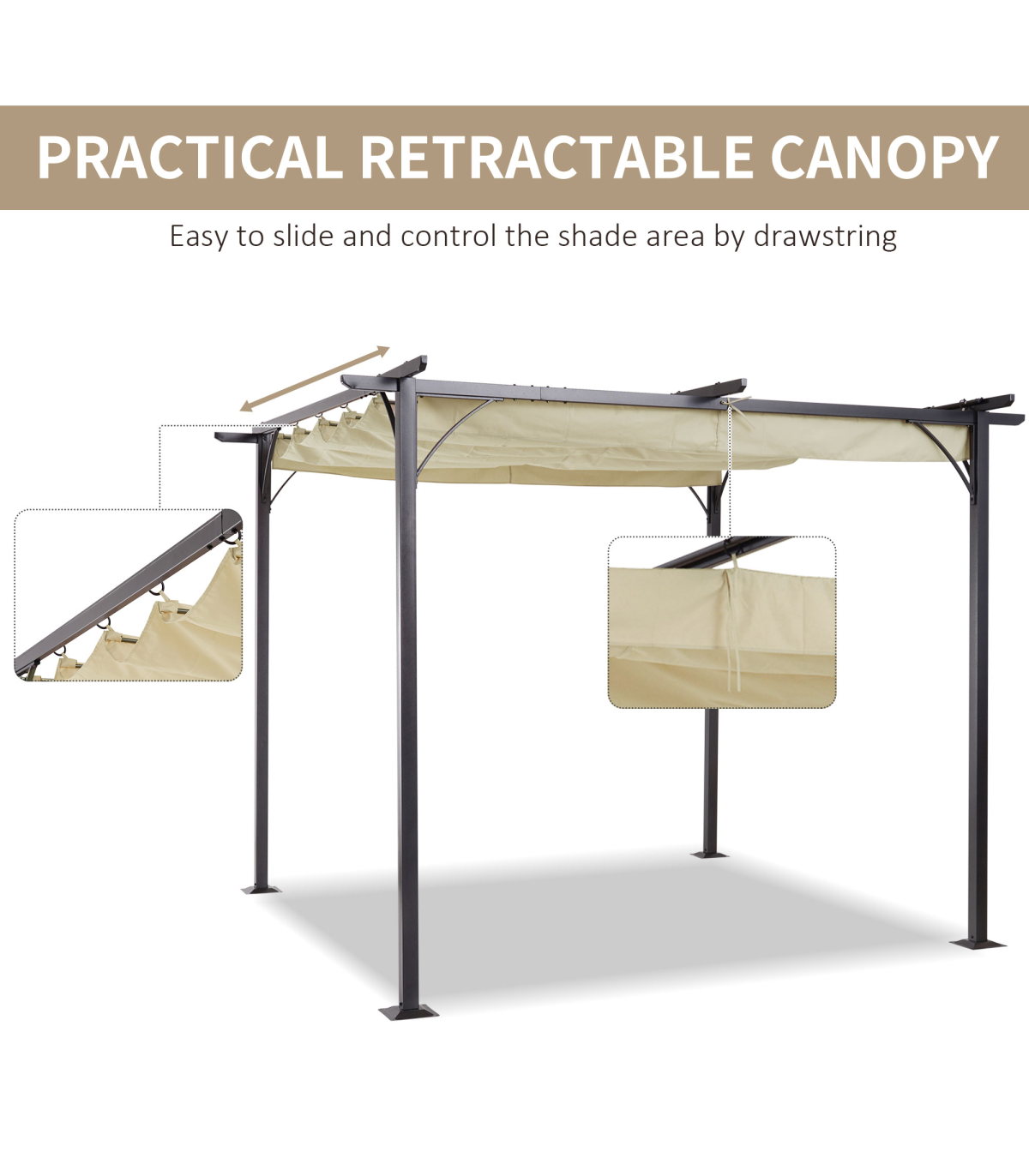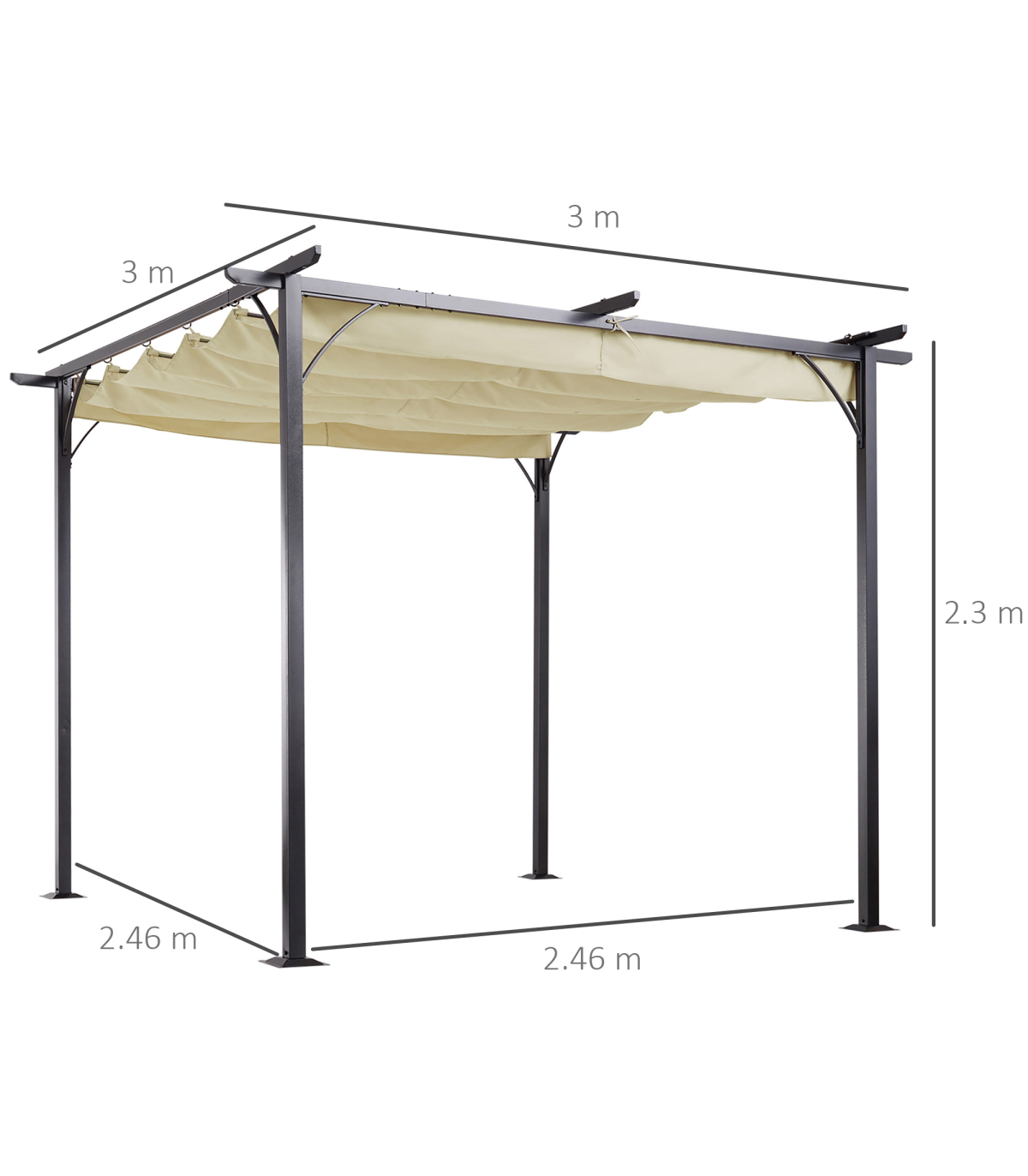 Whether you want to enhance your garden or patio space, this Outsunny pergola with a retractable roof is the perfect solution. The sturdy steel frame is powder-coated and rust-resistant, ensuring long-lasting strength. The retractable canopy roof can be easily opened and closed, making it ideal for changing weather conditions. With grommet holes for drainage, you can enjoy the outdoors without worrying about water build-up. This pergola is a great addition to any outdoor area, providing extra space for dining, socializing, or simply relaxing.