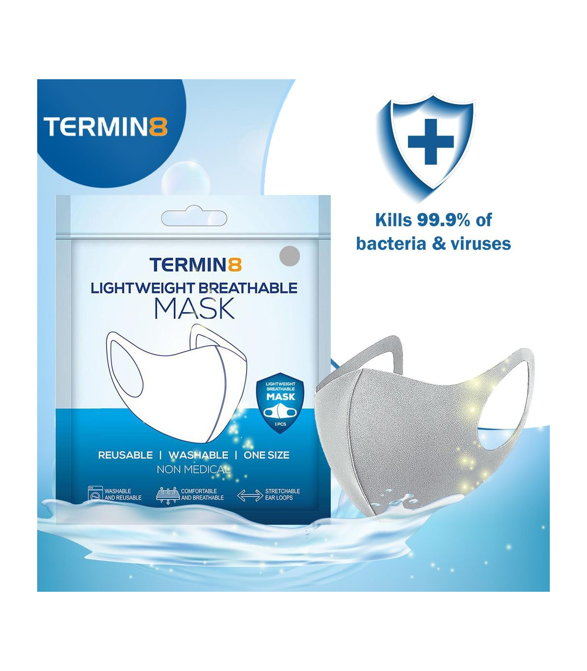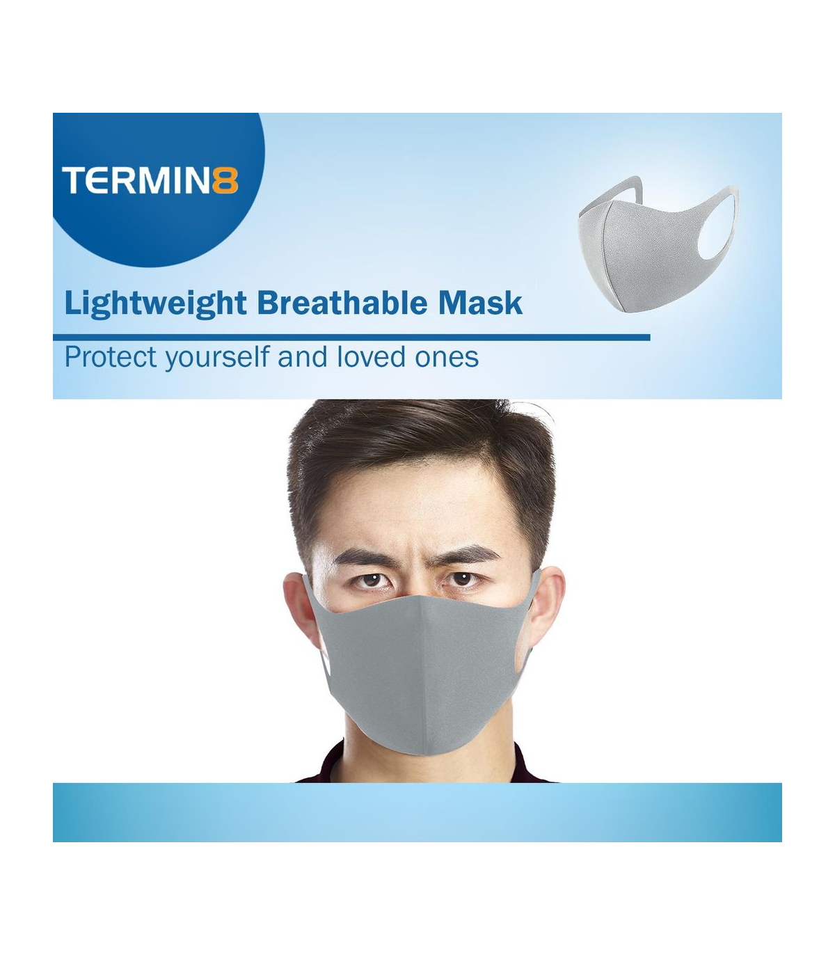 Package Contains: 1x Termin8 Water Repellent Reusable Adult/Teen Face Covering Reusable Mask - Grey