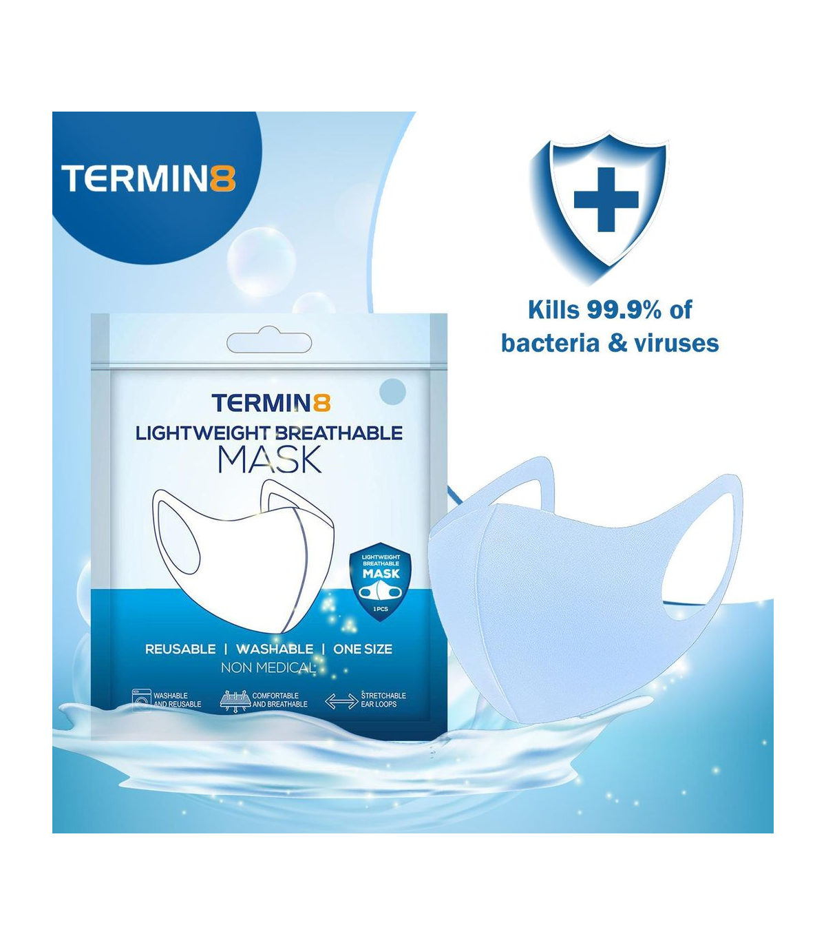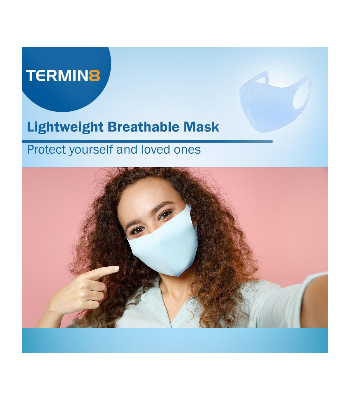 If you�re looking for a super comfortable, lightweight face mask that you can wear comfortably for hours on end, no matter the situation, we�ve got the solution here at Termin8. Our lightweight, reusable face masks are soft and skin and incredibly breathable, keeping your face cool and sweat-free all day long. Thanks to the polyester/spandex construction and stretchable earloops, your mask will automatically form to the contours of your face, giving you a perfect fit instantly with no awkward tugging and pulling. It�s machine washable too, just throw your mask in with your next load of washing and hang it to dry - it�ll look just like new!