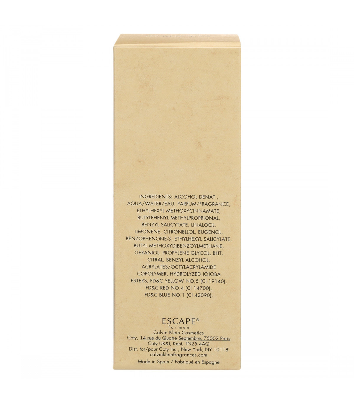 The 100ml bottle of CK Escape For Men features a sleek and minimalist design. The clear glass bottle with its metallic cap reflects the timeless elegance and adventurous spirit of the fragrance.