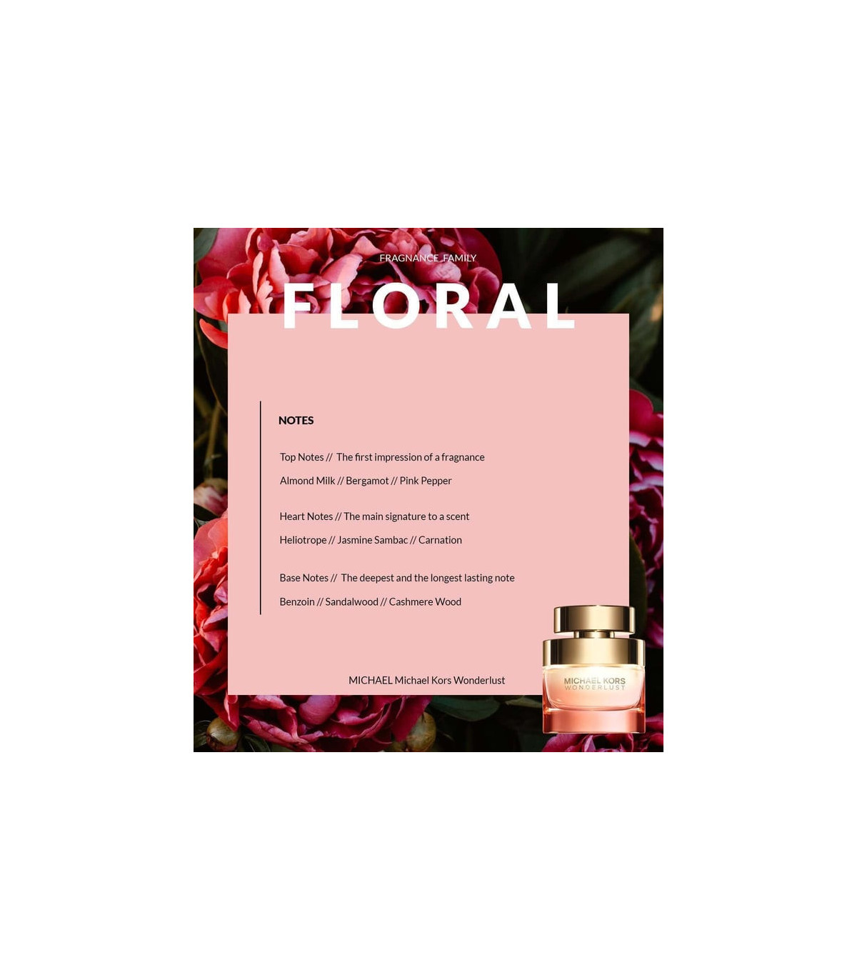 The 50ml bottle of Michael Kors Wonderlust is elegantly designed with a modern and sleek shape. Its golden accents and refined design reflect the luxurious nature of the fragrance, adding a touch of sophistication to your vanity.