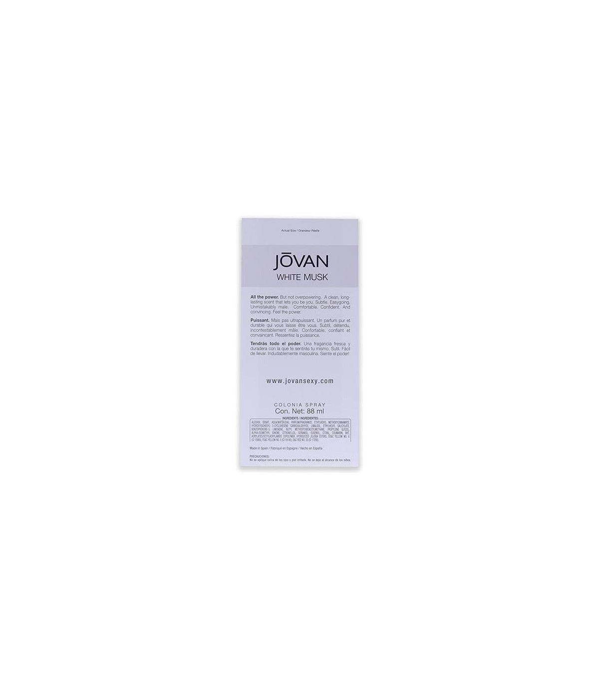 The 88ml bottle of Jovan White Musk is designed with simplicity and elegance in mind. The clear glass bottle showcases the pure, pale color of the cologne, while the minimalist design reflects the fragrance's classic and refined nature.