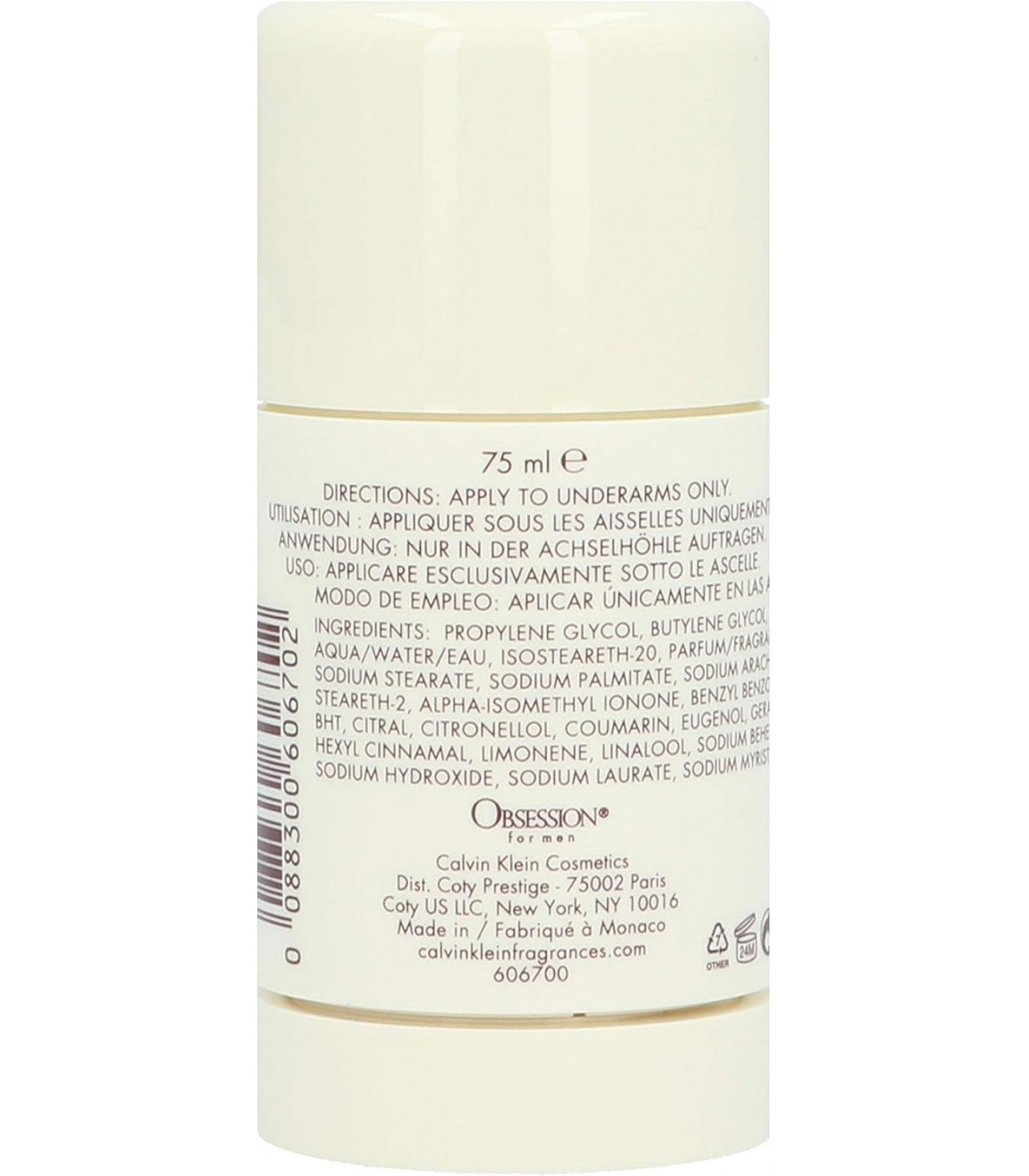 Calvin Klein Obsession for Men Deodorant Stick is presented in a sleek and practical 75ml stick format. The design reflects the classic and sophisticated essence of the Obsession fragrance line, featuring the signature Calvin Klein branding and the fragrance's name. The convenient stick format makes it easy to apply and ideal for on-the-go use, ensuring you can maintain a fresh and captivating scent throughout the day.