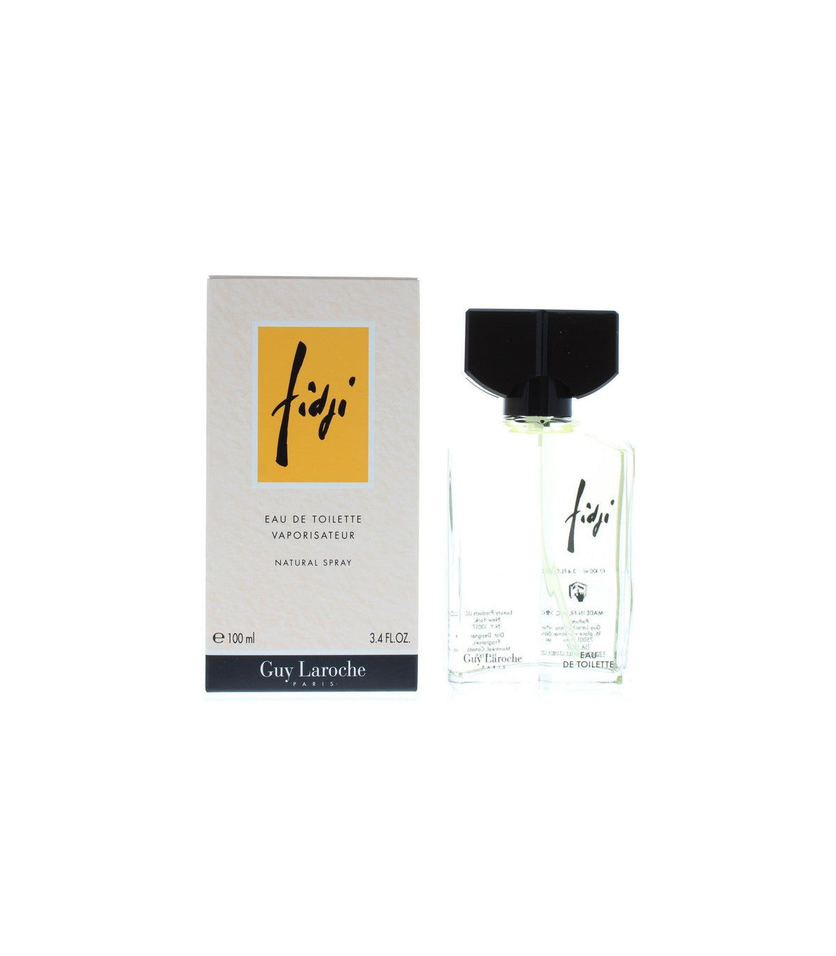 Guy Laroche Fidji is presented in an elegant and classic bottle that reflects the fragrances timeless charm. The 100ml bottle features a sleek design with a clear glass body that showcases the light, golden hue of the fragrance. The bottle is adorned with a simple, yet sophisticated cap, embodying a sense of refinement and grace.