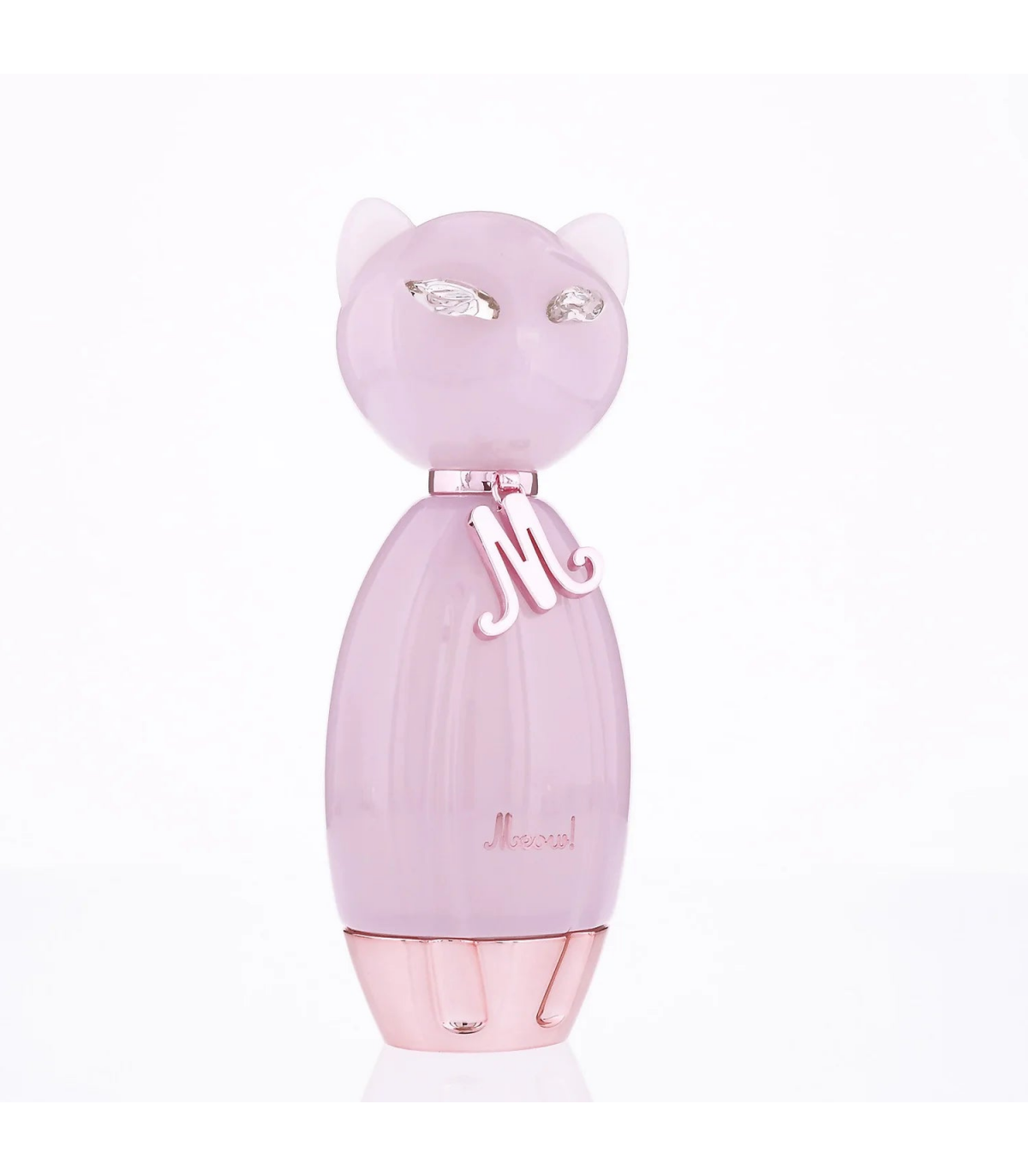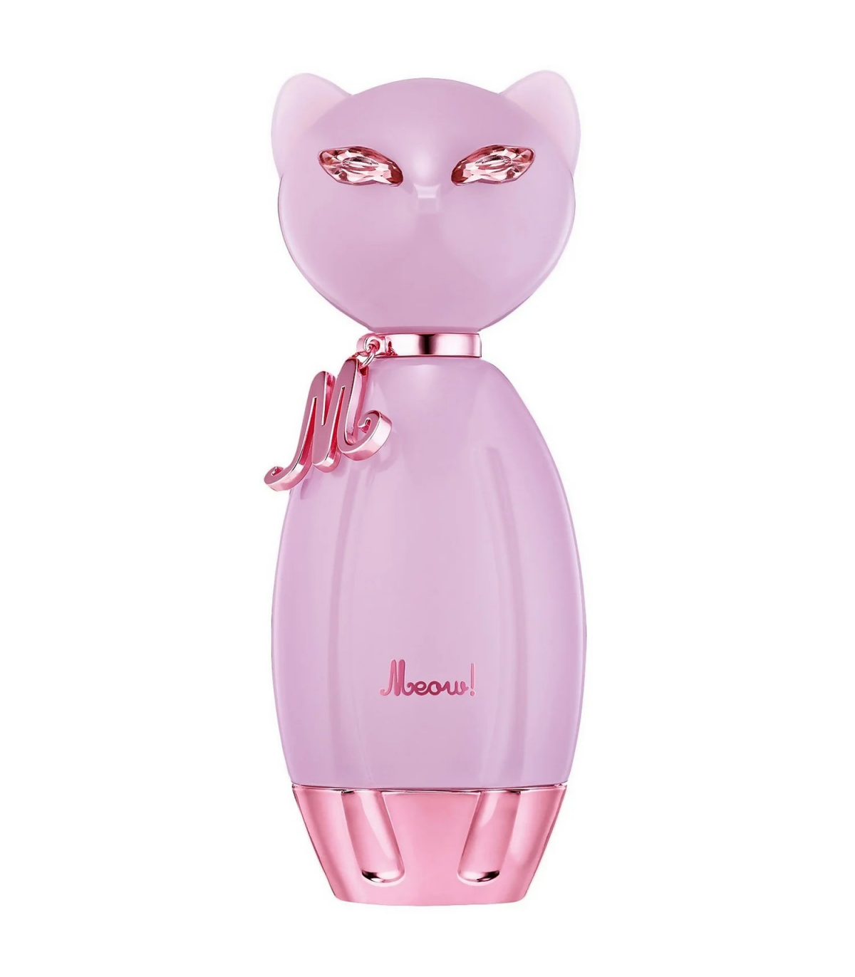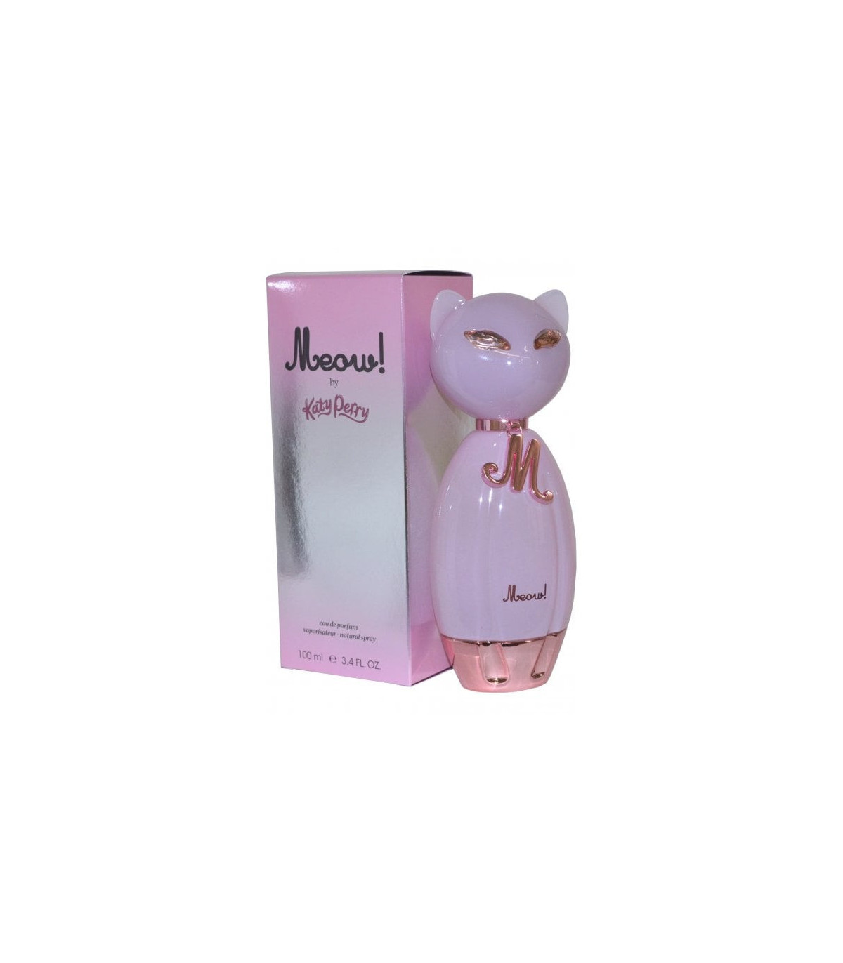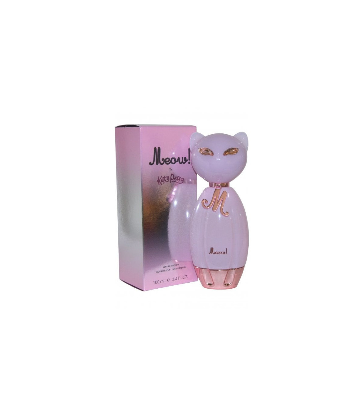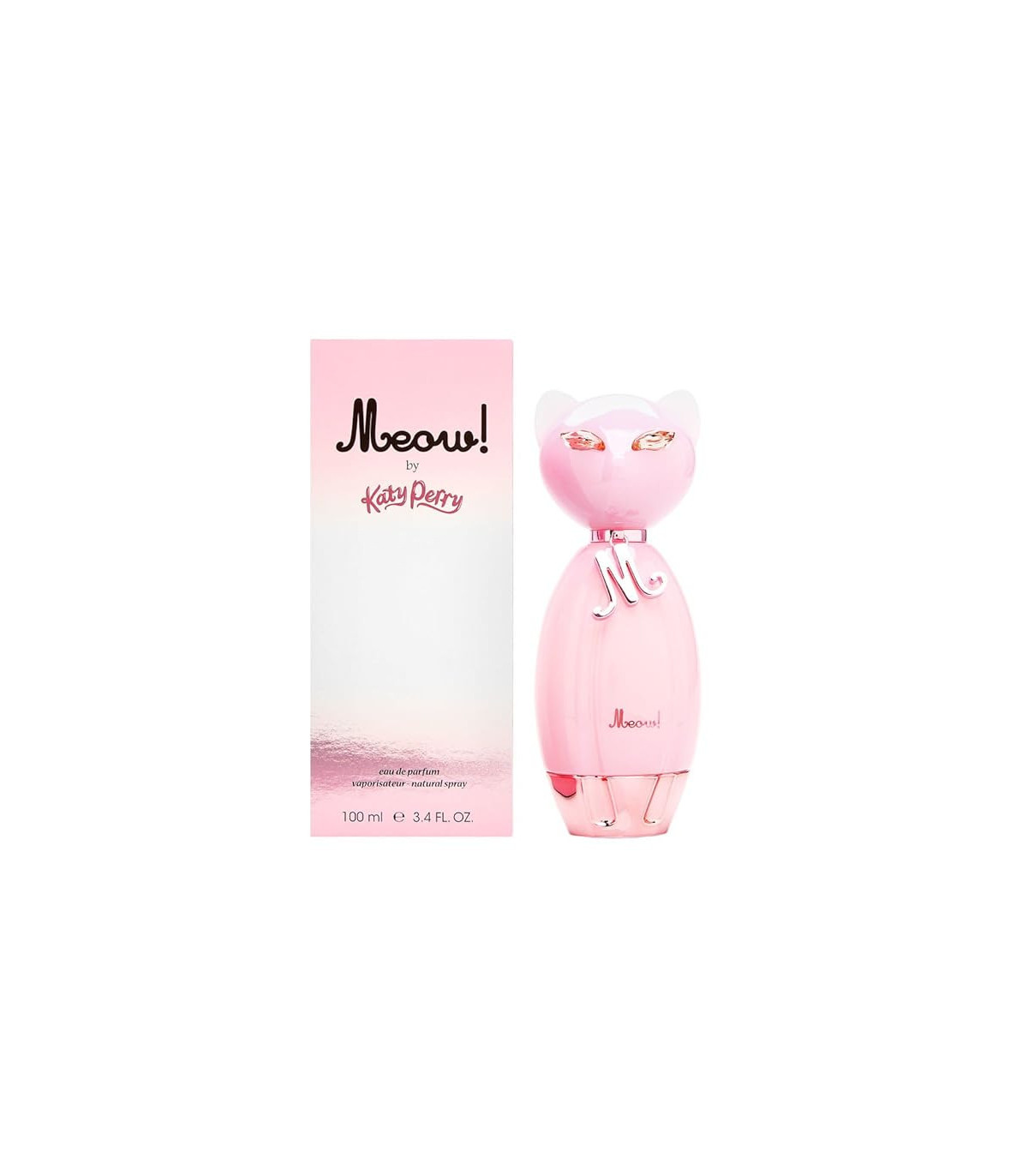 The 100ml bottle of Katy Perry Meow is as playful and charming as the fragrance itself. The bottle is shaped like a cat, with a sleek and glossy finish in a soft, pastel pink color. The cat's eyes are adorned with tiny crystals, adding a touch of sparkle and glamour. The bottle is topped with a metallic collar that reads "Meow," a fun and whimsical detail that reflects the fragrance's playful nature. The overall design is both cute and stylish, making it a perfect addition to any perfume collection.