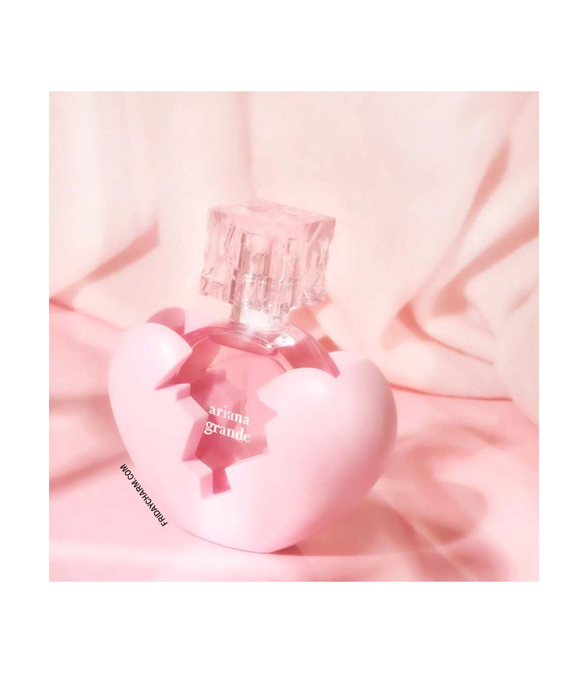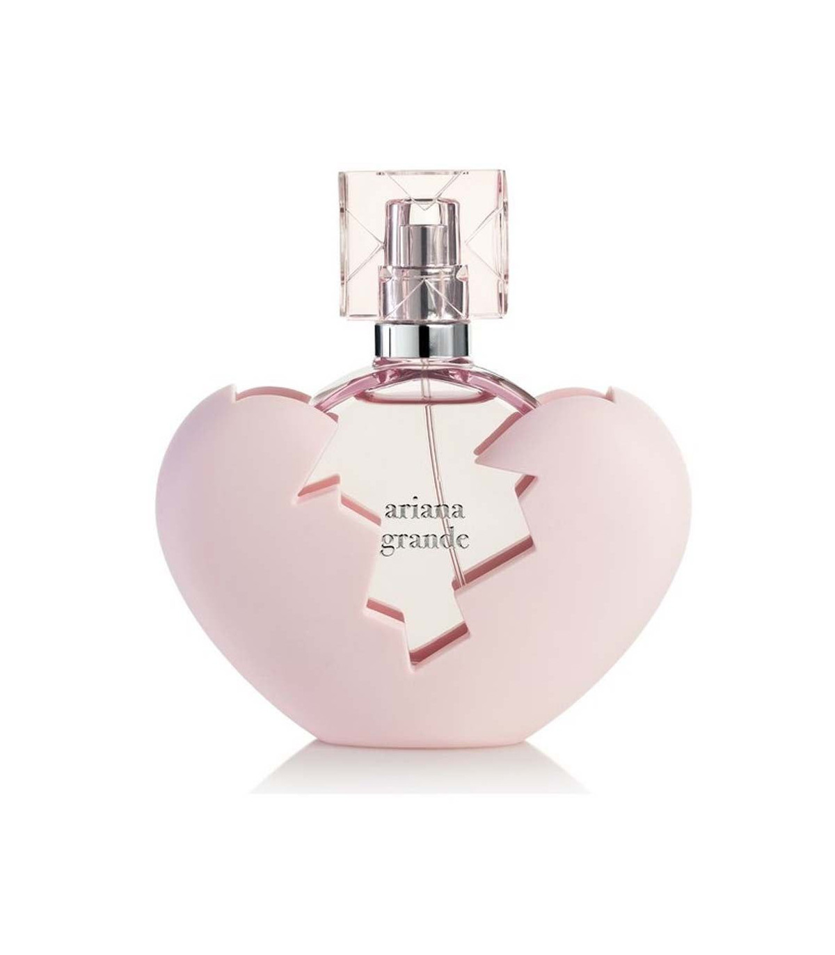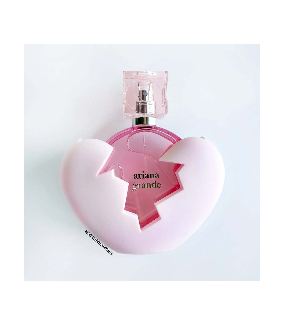 The Thank U Next Eau De Parfum bottle reflects Ariana Grande's signature playful and daring style. The 100ml bottle is encased in a shattered pink heart, symbolizing resilience and the ability to move forward from broken experiences. The inner bottle itself is sleek and pink, with Ariana's name and the fragrance title printed in chic lettering. This unique design is both visually striking and meaningful, making it a standout piece for any fragrance collection.