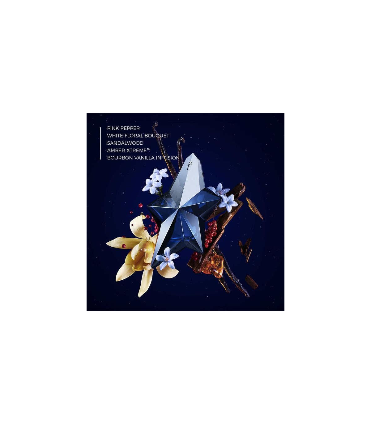 Angel Elixir features bright, creamy tones with a sweet gourmand base, contrasted by a radiant white floral bouquet. Its amber woods and vanilla infusion offer a more seductive, fearless aroma compared to the original Angel EDP.