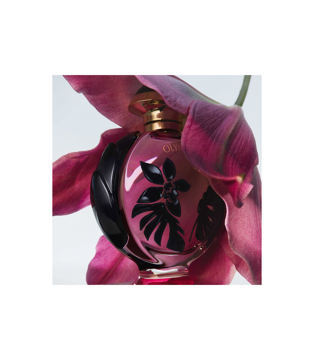 The 80ml bottle features the signature Olympea design, enhanced with floral motifs and a deep pink hue that reflects the intensity and vibrancy of the fragrance. Its elegant and bold design makes it a striking addition to any vanity.