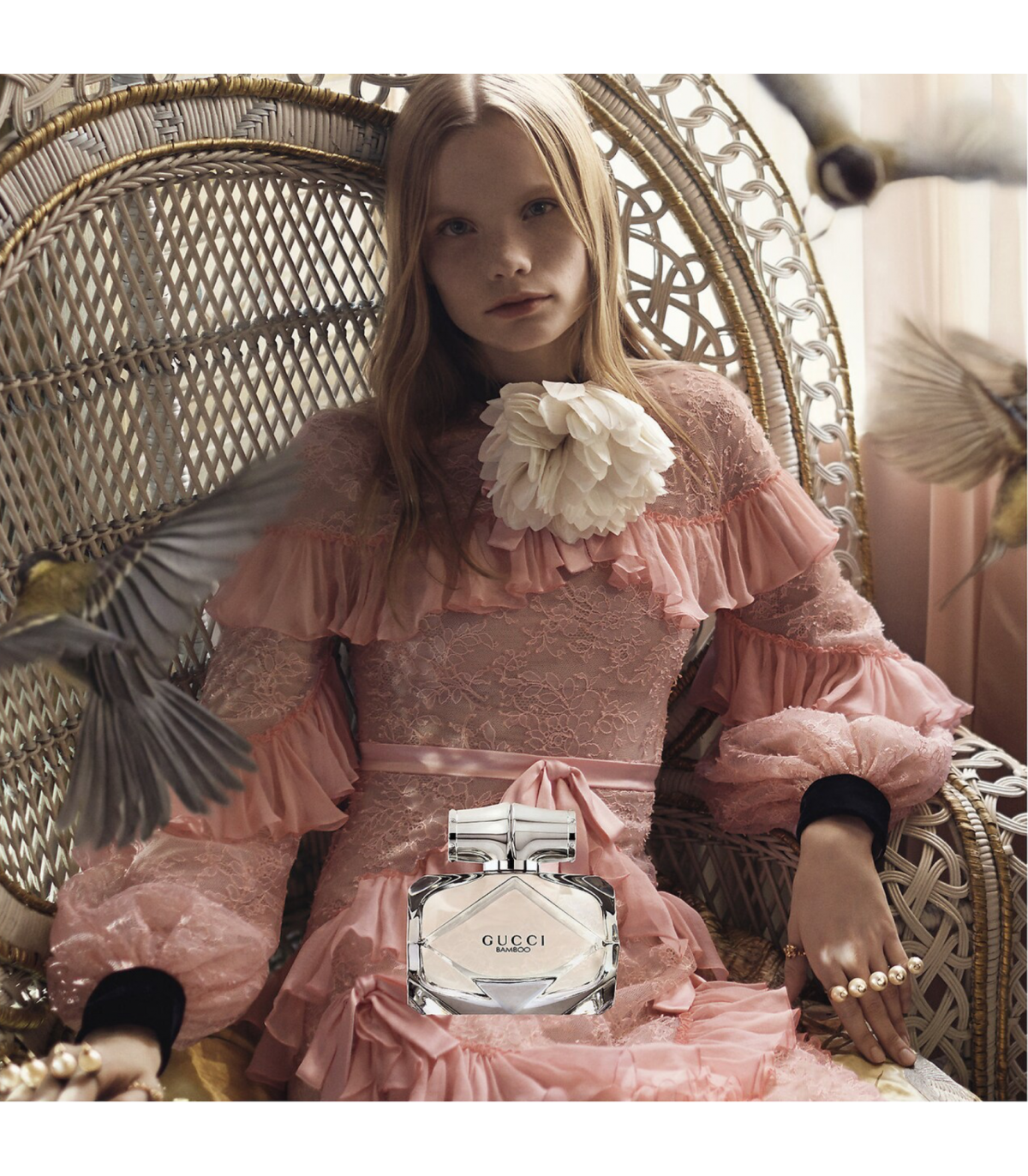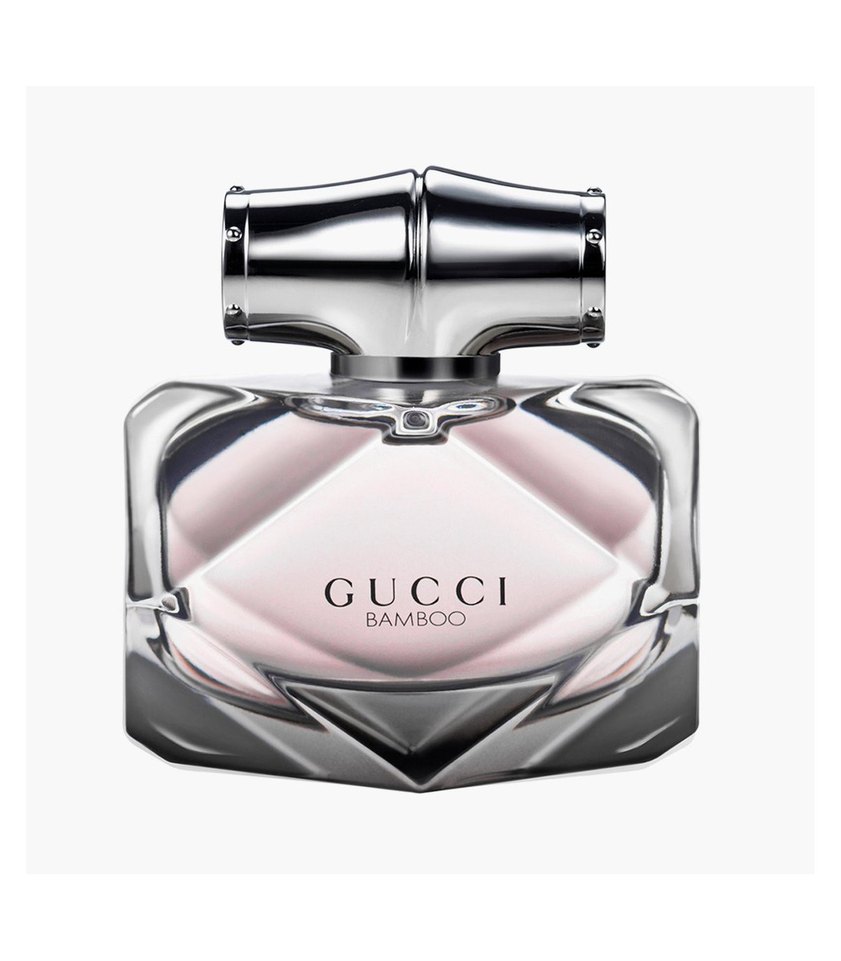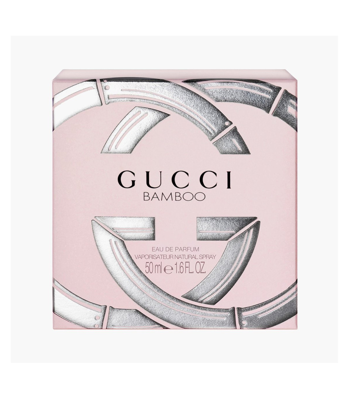 The 50ml Gucci Bamboo bottle reflects the fragrances concept of strength and grace. Its sleek, art-deco-inspired design features a jewel-like cap and soft, blush-colored liquid inside, evoking timeless luxury.