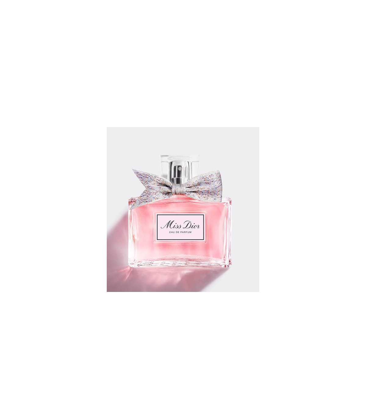 The Miss Dior bottle is a symbol of classic elegance and modern sophistication. Its sleek, rectangular shape is adorned with a delicate bow, embodying the essence of femininity and grace. The clear glass allows the light pink hue of the perfume to shine through, reflecting the fragrances refined and romantic character. The silver cap adds a touch of sophistication, making the bottle a beautiful addition to any vanity.