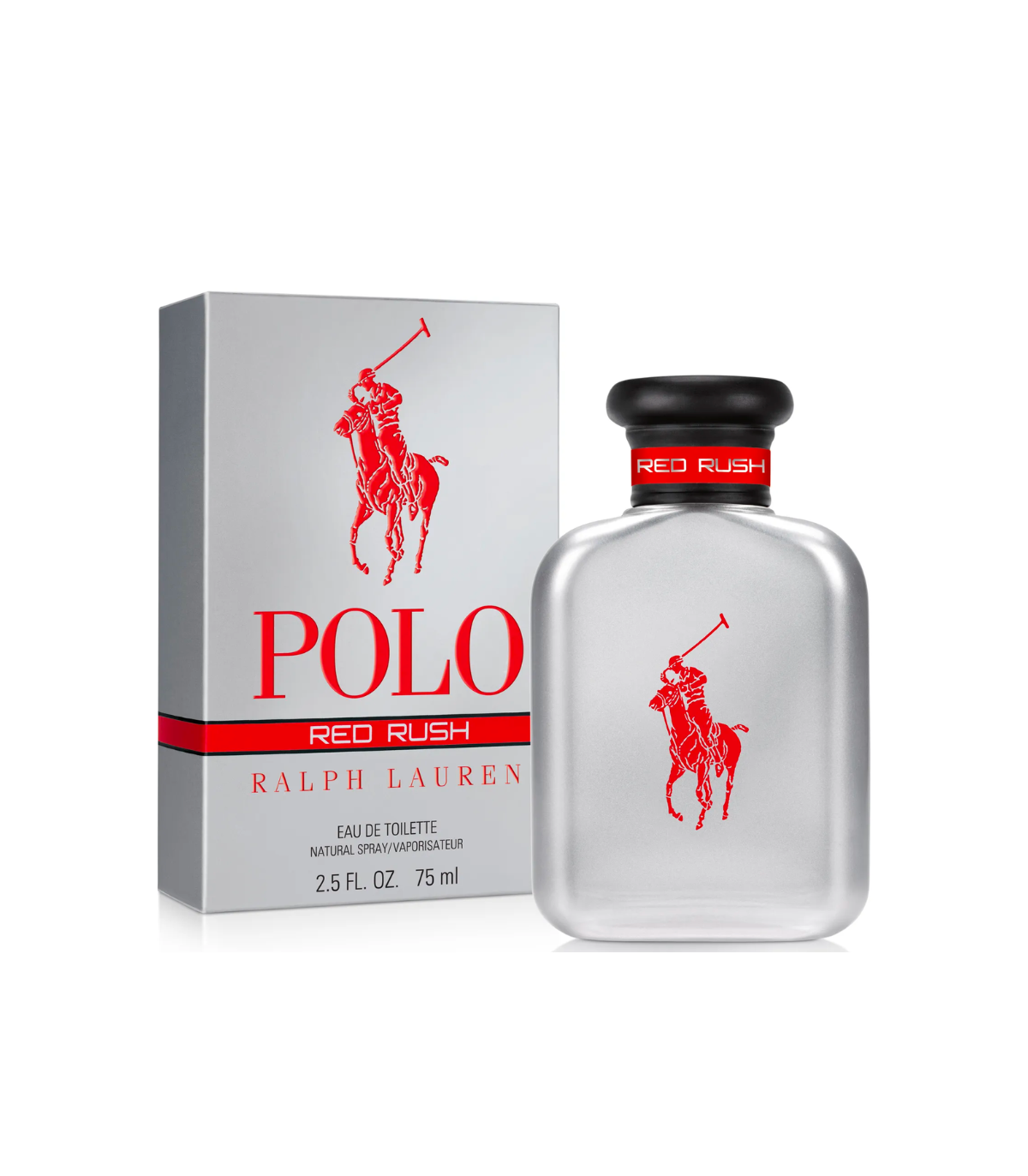 The 75ml bottle of Polo Red Rush is designed to reflect the bold and modern nature of the fragrance itself. The sleek, transparent glass bottle allows the cool silver-colored liquid to shine through, while the iconic red Polo logo and black accents add a touch of sophistication. The design is minimalist yet striking, perfectly embodying the high-energy, adventurous spirit of the fragrance.