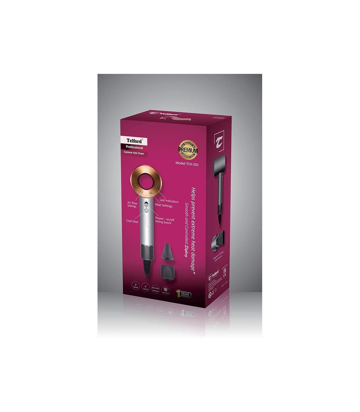 - RAPID DRYING WITH LOW NOISE: Equipped with a high-speed bladeless 1600-watt DC motor, the Telford Cyclone generates three times the air pressure of traditional hair dryers. This powerful airflow quickly removes moisture from your hair, reducing drying time significantly. Its low-noise operation ensures a quieter styling experience.