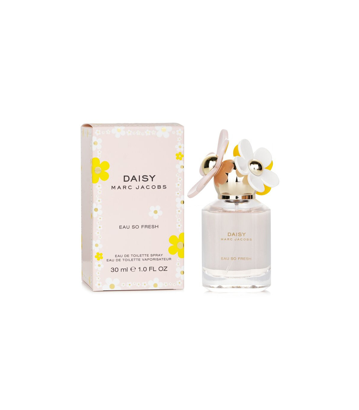 The 30ml bottle of Marc Jacobs Daisy Eau So Fresh features a charming and whimsical design that reflects the fragrance's playful character. The clear glass bottle showcases the light pink liquid inside and is adorned with a colorful assortment of flowers on the cap. The vibrant and eye-catching design makes it a delightful addition to any fragrance collection and adds a touch of whimsy to your vanity.