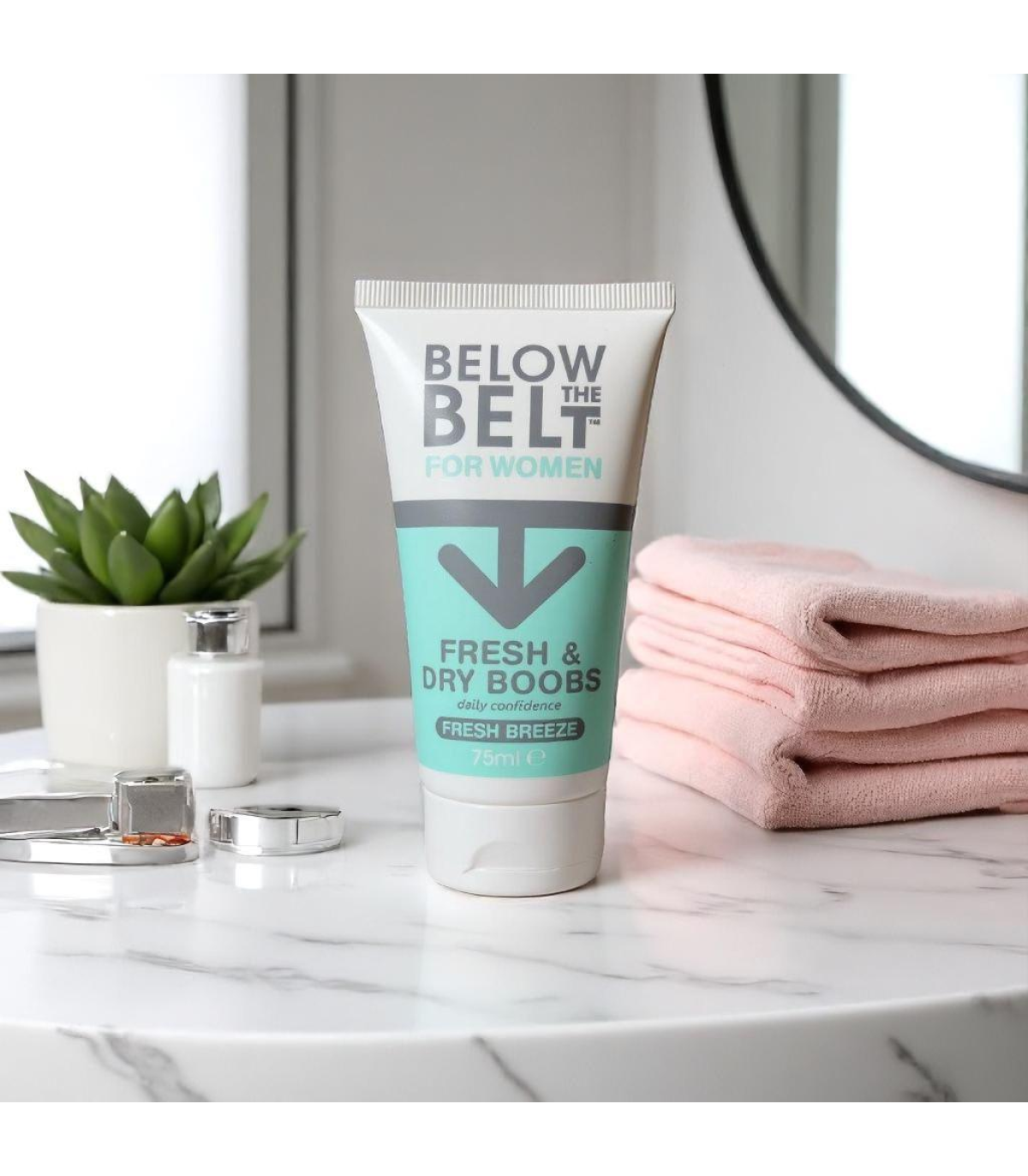 At Below the Belt for women we understand what it takes to help you feel fresh & confident all day. Below the Belt Fresh & Dry Boobs is a quick drying, talc-free formulation designed to absorb excess moisture, relieve irritation and reduce friction in your intimate under-boob area keeping you dry, cool and comfortable.