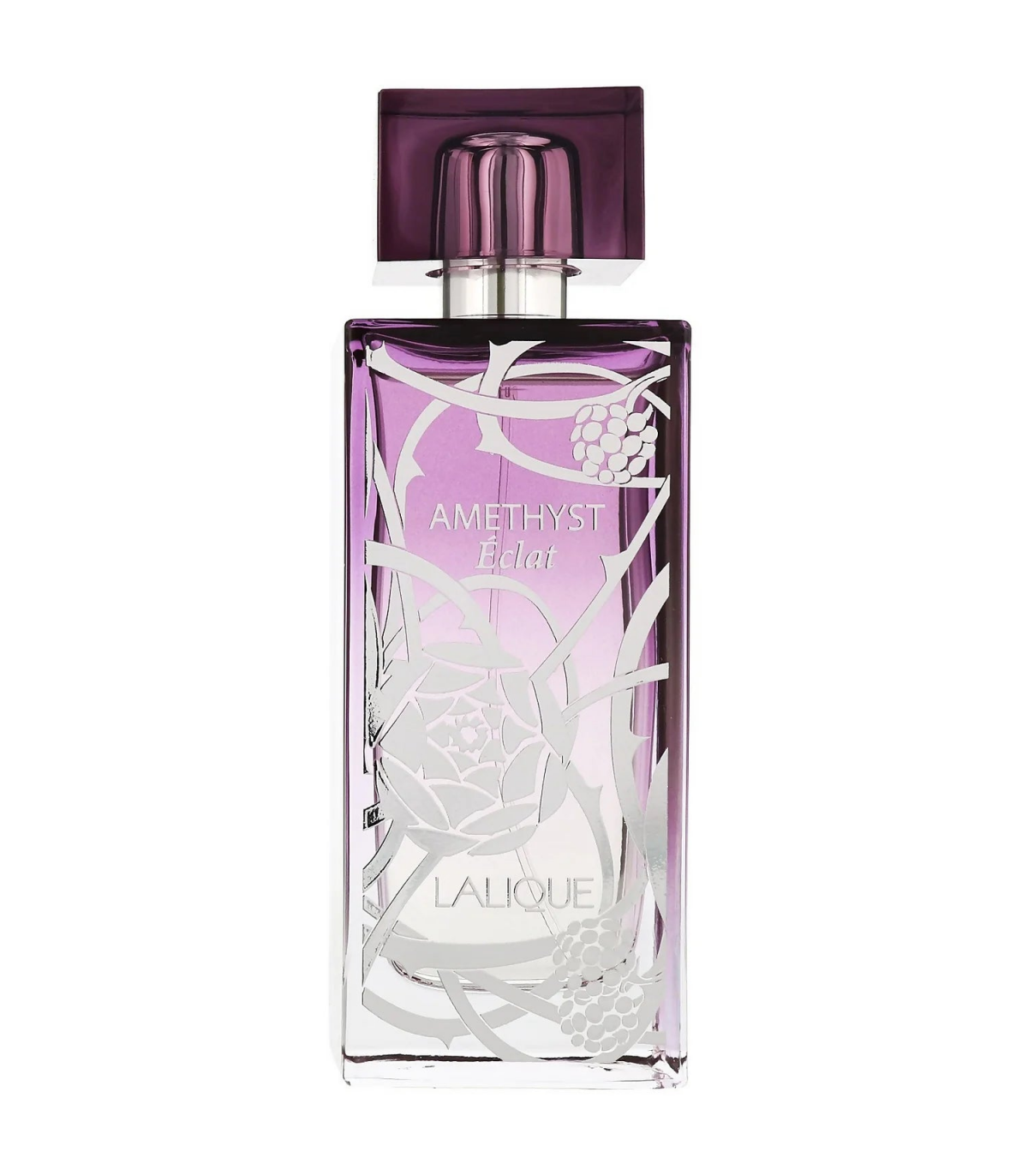 The 100ml bottle of Lalique Amethyst Éclat is a reflection of the fragrance's sophisticated and modern character. The bottle is crafted from deep purple glass, reminiscent of the amethyst gemstone, with a sleek and elegant design. The cap is adorned with a polished silver detail, adding a touch of luxury and refinement. The bottles clean lines and rich color make it a striking addition to any perfume collection, combining both beauty and functionality.