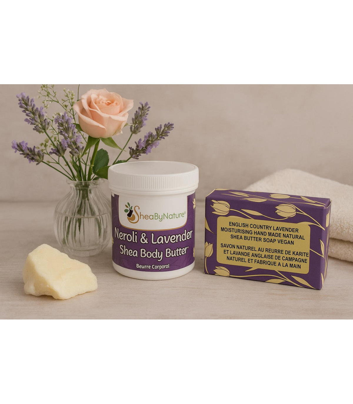 Indulge your skin with this luxurious, all-natural skincare combo handcrafted by SheaByNature. This perfect pairing includes our best-selling Neroli & Lavender Shea Body Butter and our gentle Country Lavender Handmade Soap — both enriched with organic unrefined fair trade shea butter and 100% natural botanical oils.