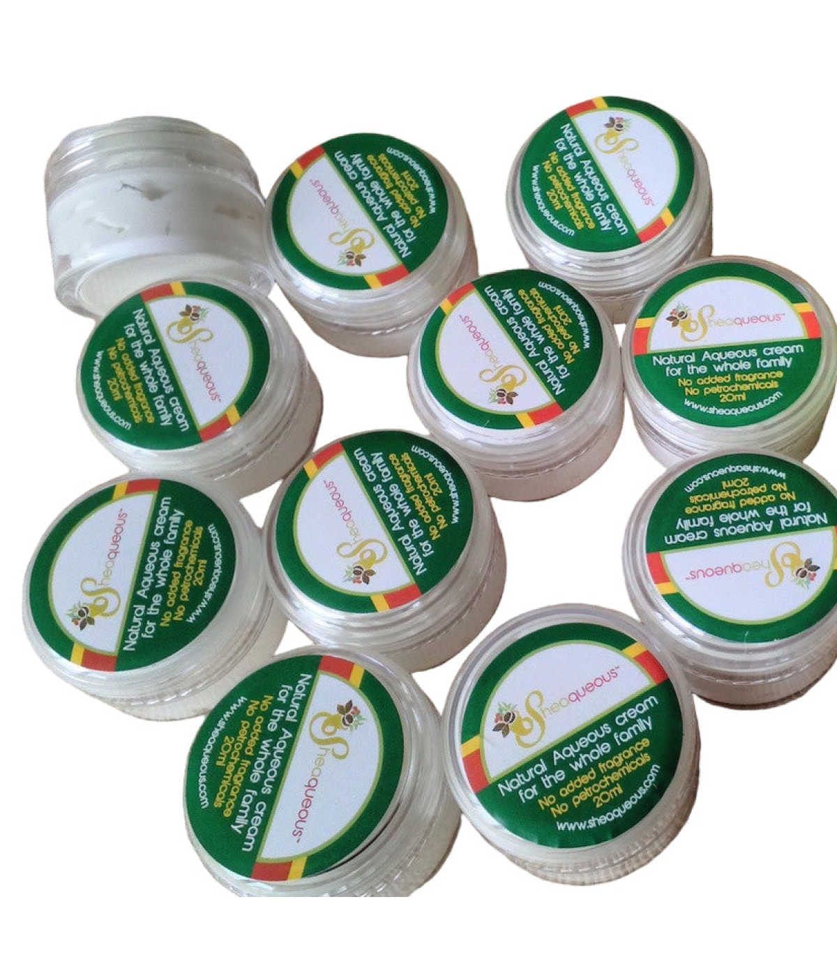 Following on from the Success of our Natural aqueous cream and as a result of the number of customers who asked us for a single cream which would be suitable for the whole family, We created Sheaqueous cream. Sheaqueous cream is a natural aqueous butter for dry skin. It helps to moisturise, soothe, protect and maintain your skin in Good condition. Made from naturally emollient oils found in nature, with pure unrefined organic shea butter at the heart of this rich formulation, sheaqueous cream is ideal for the whole family, from babies to adults and elderly users. Many customers have loved our moisturising aqueous cream for years and seen tremendously positive results. We decided it was time to pack the cream even fuller with goodness. The recent revised formulation Sheaqueous is even richer, creamier and more nourishing than before. It has no added Fragrance and It is vegan. It is not tested on animal but on our human volunteers.