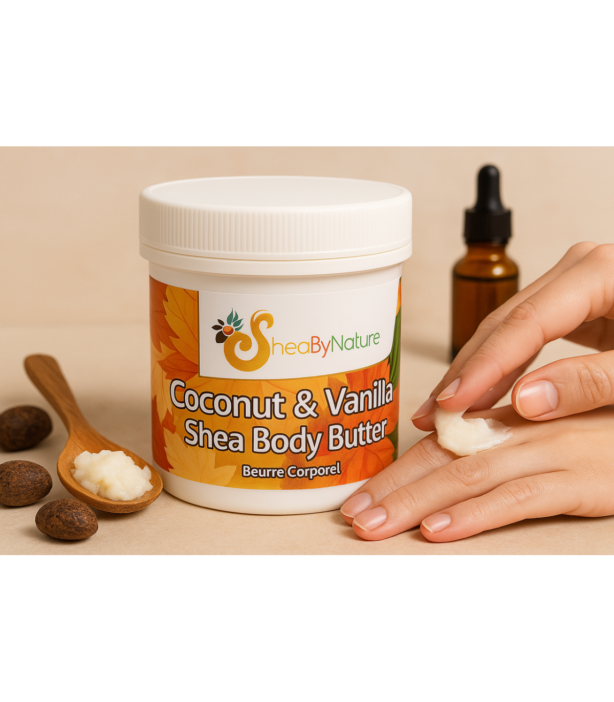 SheaByNature intensive body moisturiser with 50% organic pure shea butter, and coconut and vanilla fragrance, for very dry skin. The smell of this shea body butter is simply divine. It smells of the tropics, the summer and good times. It feels so wonderful on the skin! This range has been specially blended just for you with the following: Unrefined shea butter to deeply moisturise, heal, nourish and refresh and regenerate your skin (50%): Cocoa butter to keep your skin soft and healthy and enriched: Olive oil to keep your skin supple, elastic and moisturised. We have delicately fragranced this butter with food grade fragrance oils of coconut and vanilla. It smells good enough to eat! This fragrance combination is one of the best-sellers from our body butter range. Shea butter comes from the Karite tree, which grows in the savanna regions of West Africa. Shea butter's emollient properties have been proven through centuries of use in African. It helps to keep your skin smooth, nourished, supple and young and protected. Buy it today.